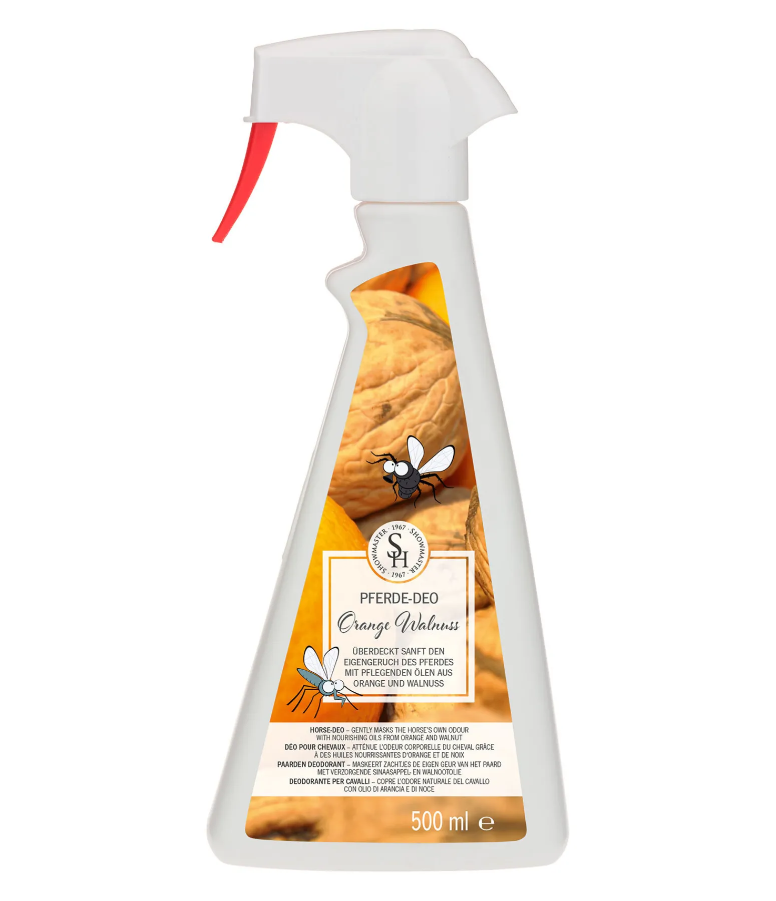 Déodorant naturel pour chevaux. Couvre et atténue l’odeur corporelle du cheval grâce aux huiles nourrissantes d’orange et de noix. Nourrit également la peau et la robe. Le parfum est marqué, sans être entêtant.