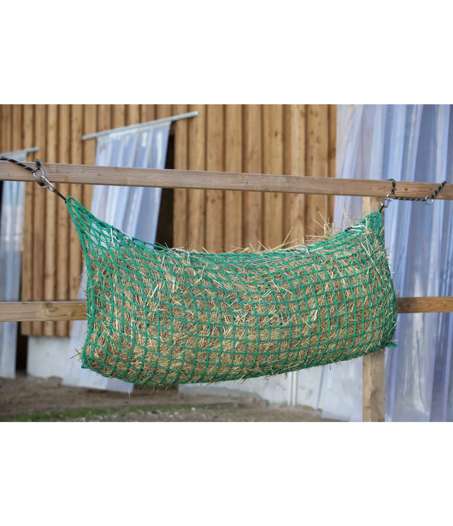 Un filet à foin grand format facile à remplir par le haut et facile à accrocher au moyen des quatre mousquetons de sécurité. Ces mousquetons sont spécialement conçus pour réduire au maximum le risque de blessure pour le cheval. Idéal pour nourrir plusieurs chevaux dans des écuries ouvertes ou des enclos extérieurs. Mailles 4 x 4 cm. 150 x 60 cm. 10 kg.