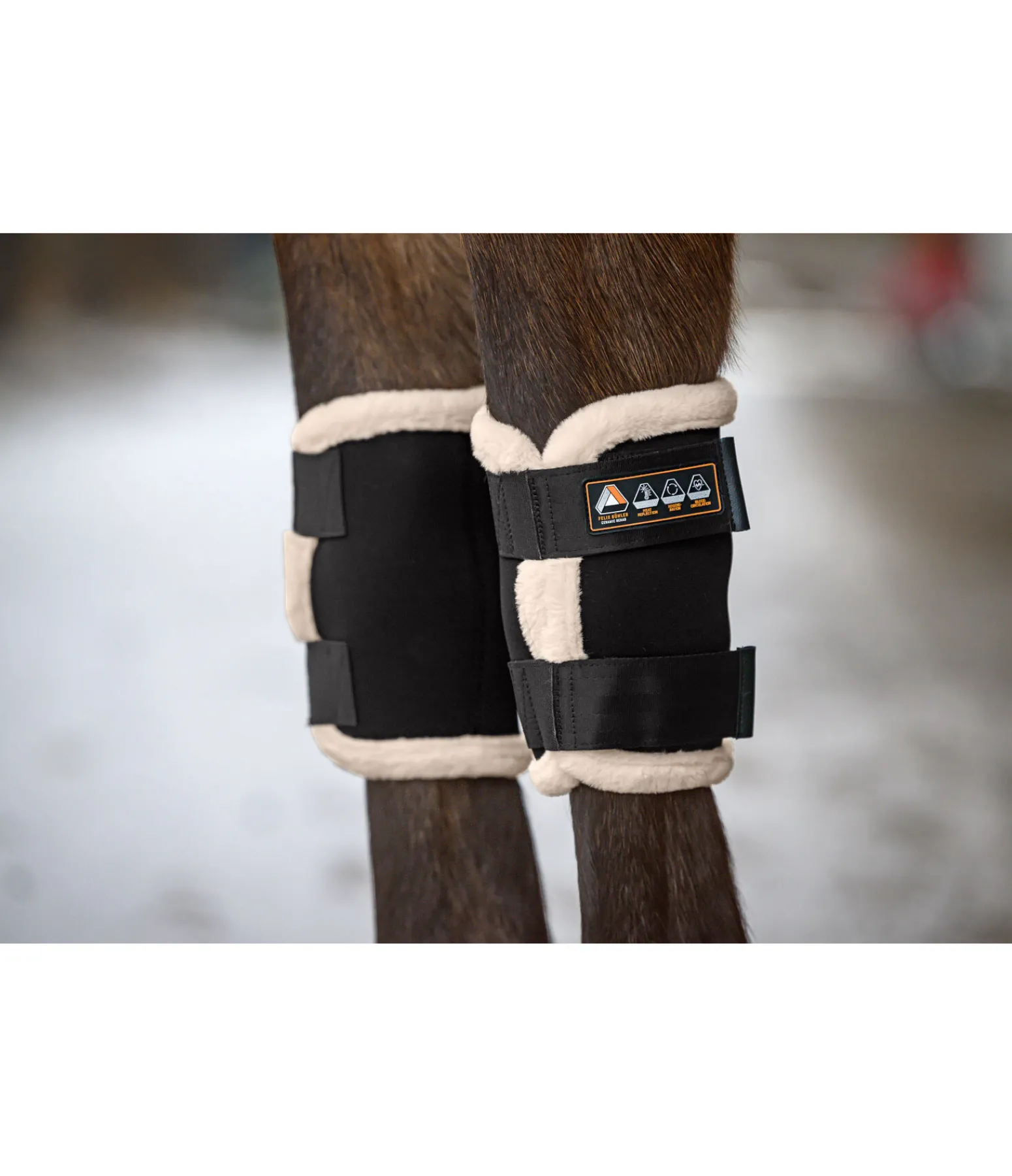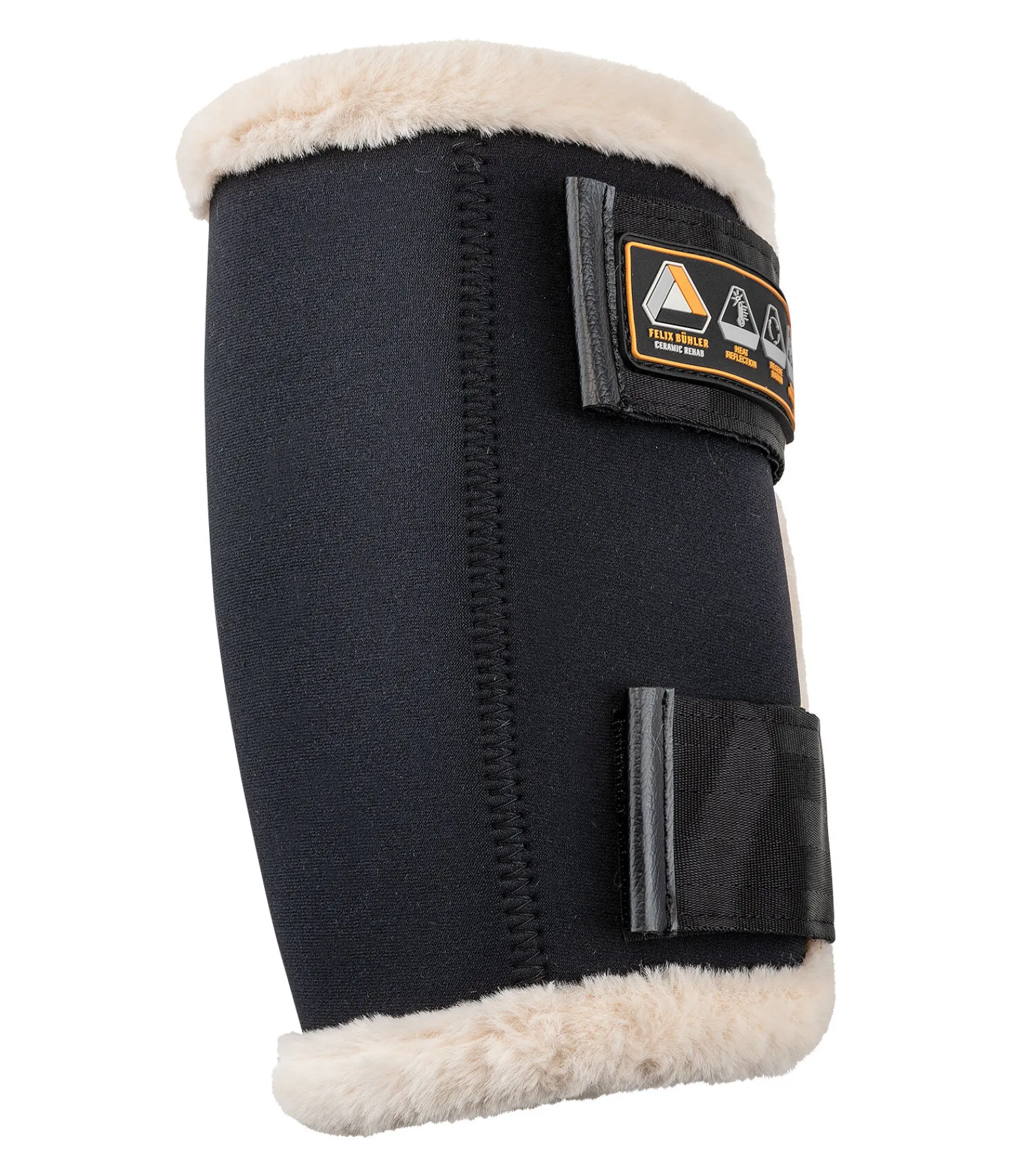 Genouillères anatomiques souples. Protection des os du carpe (genou). Doublure intérieure respirante avec fibres de céramique permettant de réfléchir la chaleur corporelle sous forme de rayonnement infrarouge et de stimuler la circulation sanguine. Idéales pour les maladies chroniques de l’articulation du carpe comme l’arthrose. En cas d’inflammation aiguë des glandes séreuses, la chaleur peut aggraver le processus inflammatoire, c’est pourquoi nous recommandons dans tous les cas de demander l’avis d’un vétérinaire avant utilisation ! Peuvent également servir de protection contre les blessures en cas de pseudo-narcolepsie. Doublure douce et moelleuse en polaire Teddy pour protéger des irritations dues aux frottements, même en cas de port prolongé. Pour cela, elles doivent être nettoyées régulièrement. Les protections sont lavables en machine à 30 degrés sur cycle délicat. Deux larges pattes auto-agrippantes robustes avec insert élastique pour un maintien sûr et ajustement individuel de la taille. Vendues par paire ! Matière extérieure 100 % caoutchouc chloroprène, doublure intérieure et polaire 100 % polyester.