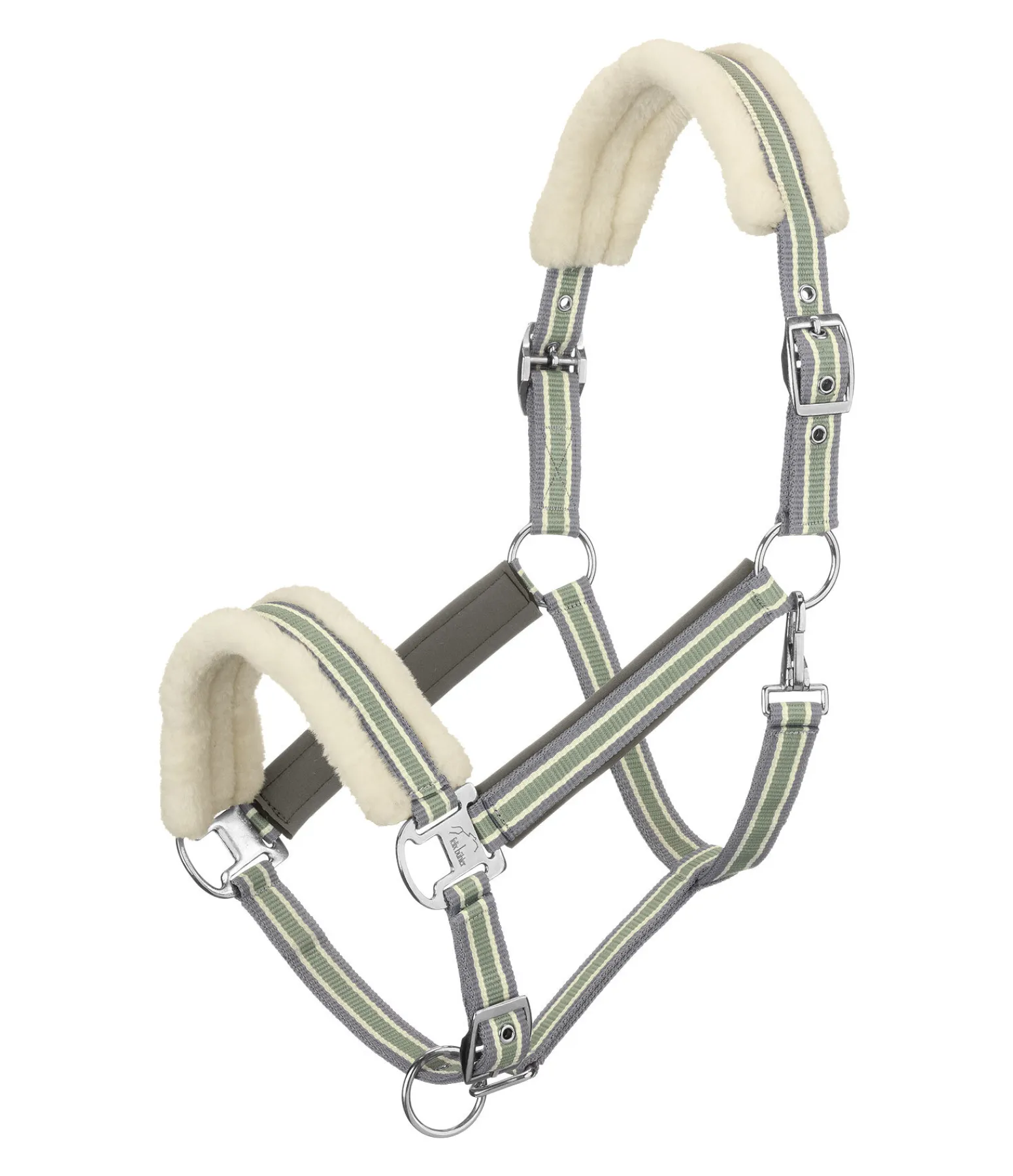 Licol sportswear avec doublure en polaire Teddy douce sur la têtière et muserolle et en caoutchouc-chloroprène moelleux sur les montants. Design tricolore tendance. Têtière doublement réglable et muserolle réglable. Bouclerie en métal de couleur assortie. Licol 100 % polypropylène, polaire Teddy 100 % polyester.