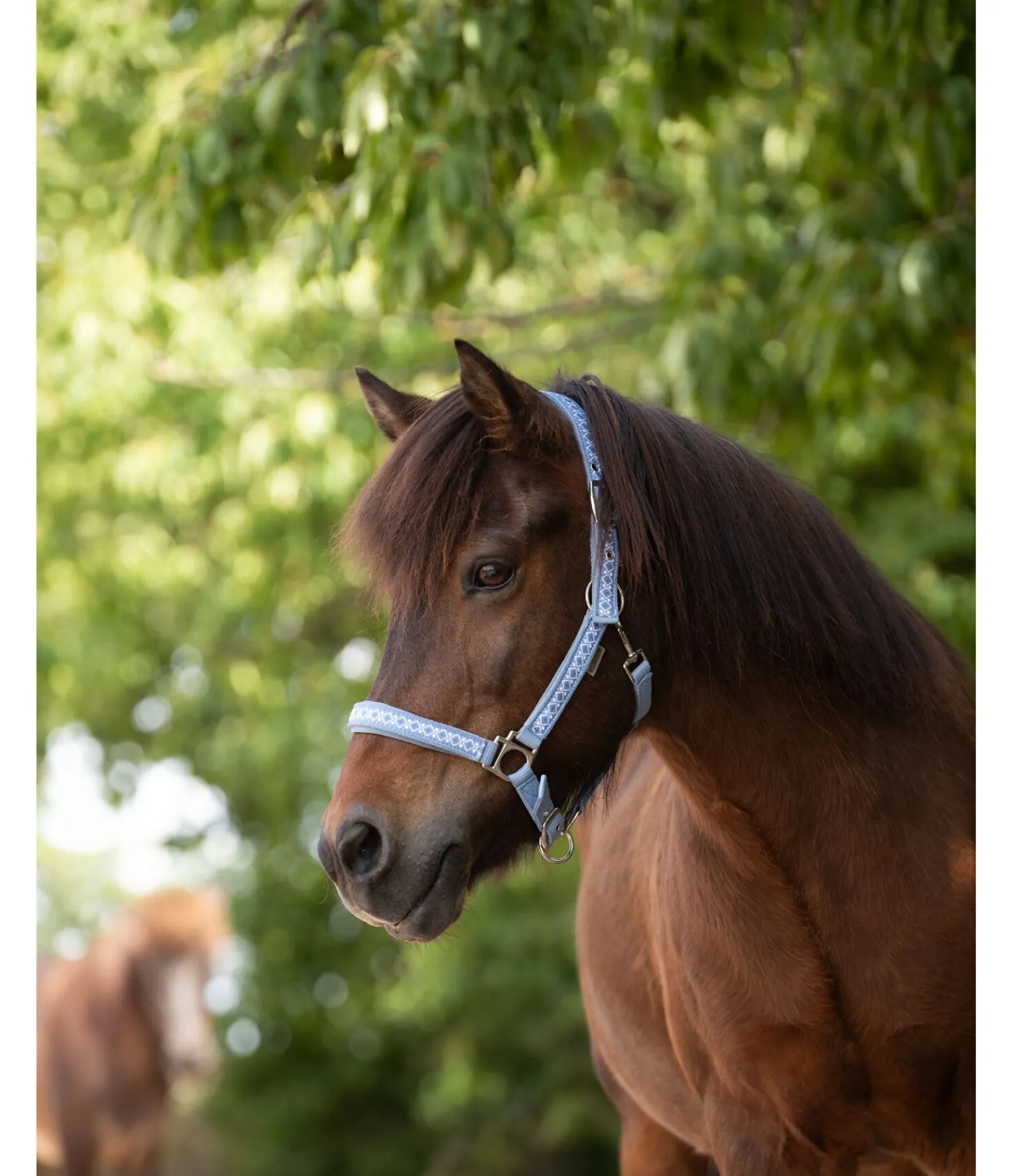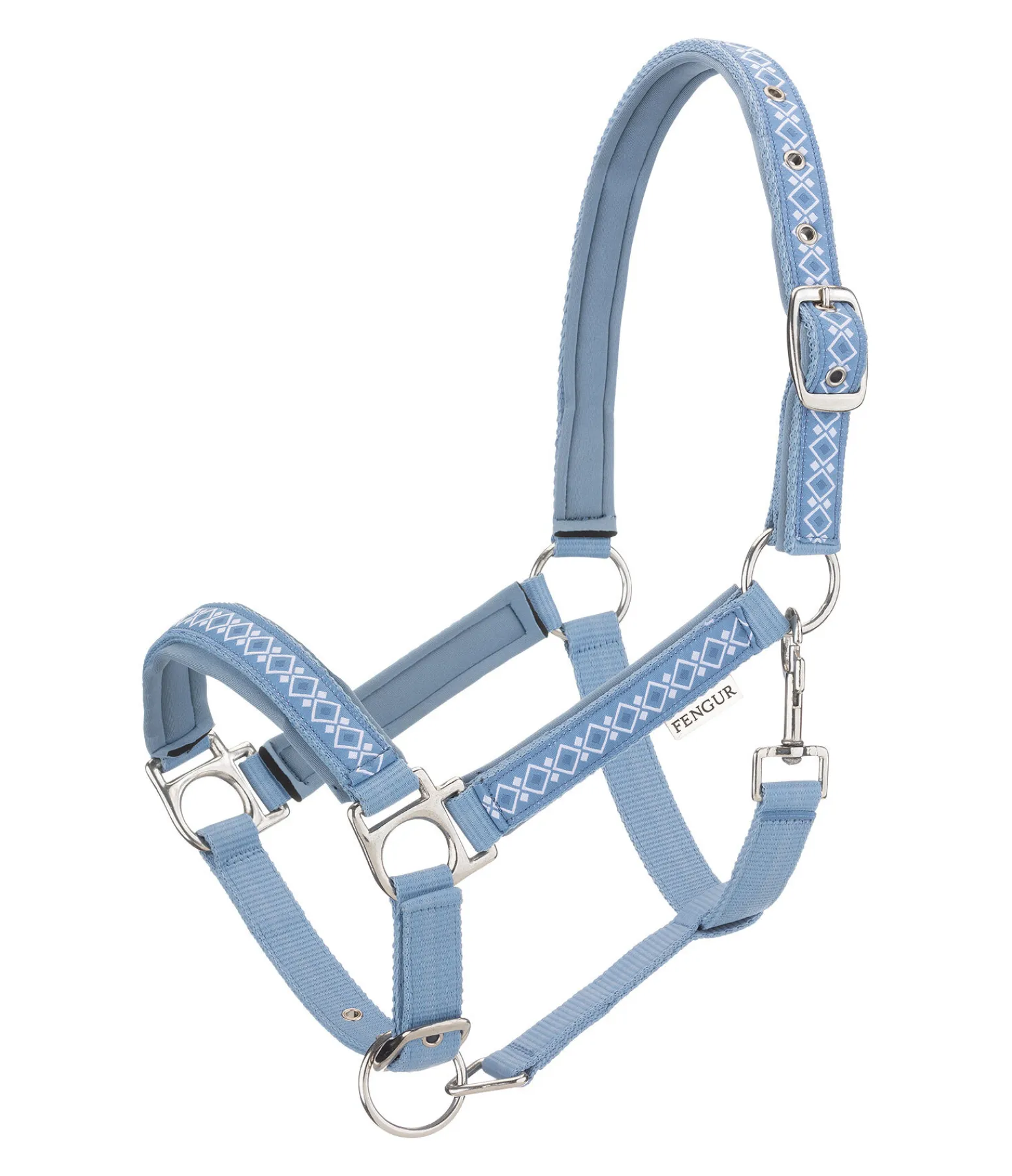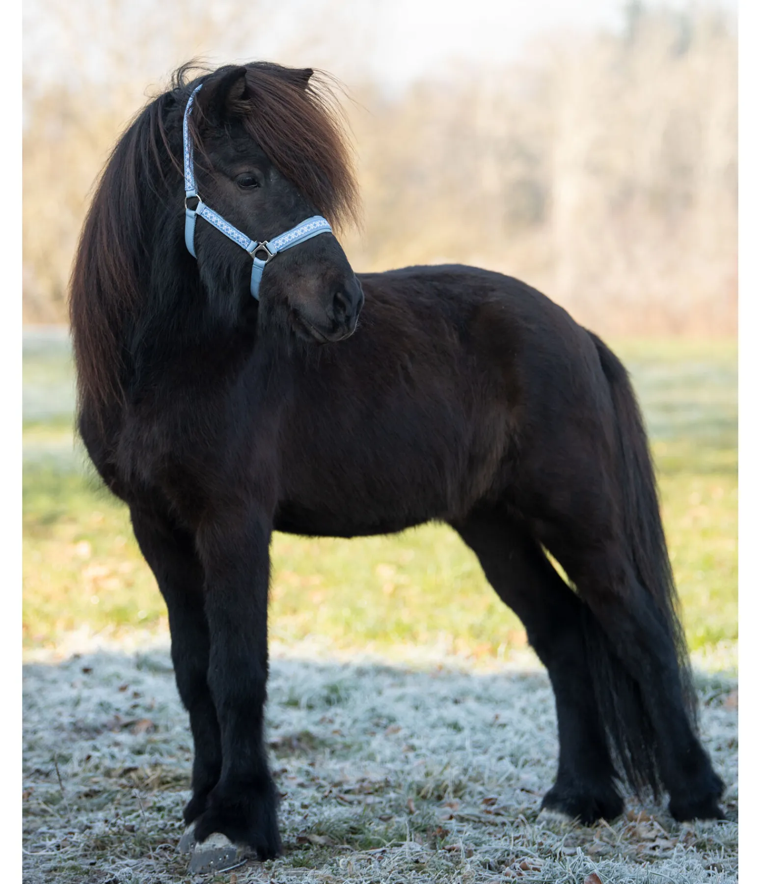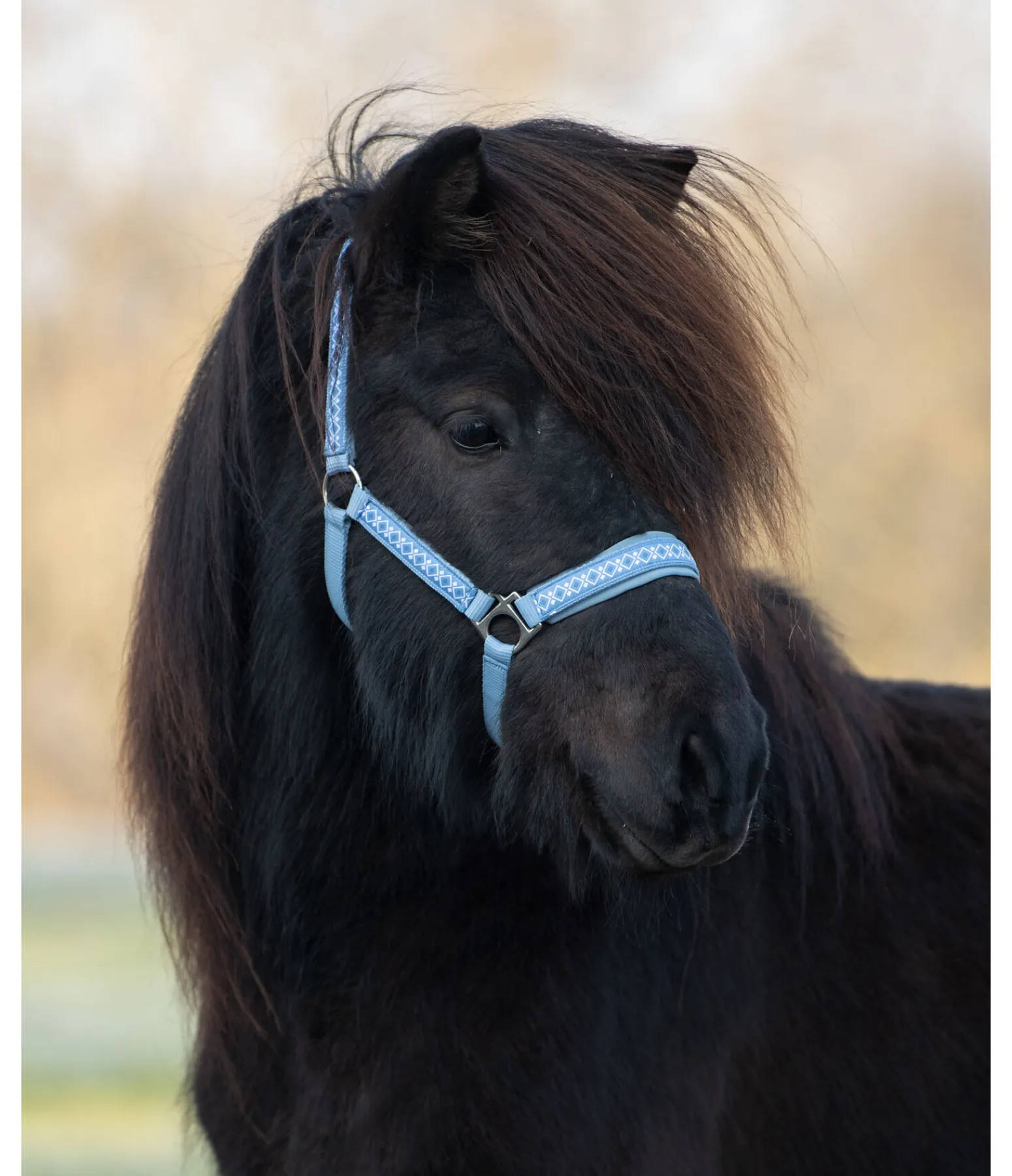 Licol avec motif nordique, pas uniquement réservé aux poneys islandais. Têtière, montants et muserolle avec doublure moelleuse. Têtière et muserolle réglables. Licol 100 % polypropylène, doublure 100 % polyester
