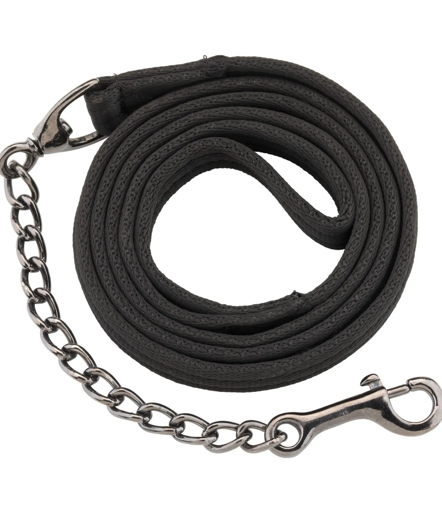 Longe de présentation confortable plate en polyester avec dragonne. Longueur totale 2 m, chaîne 30 ou 70 cm au choix.