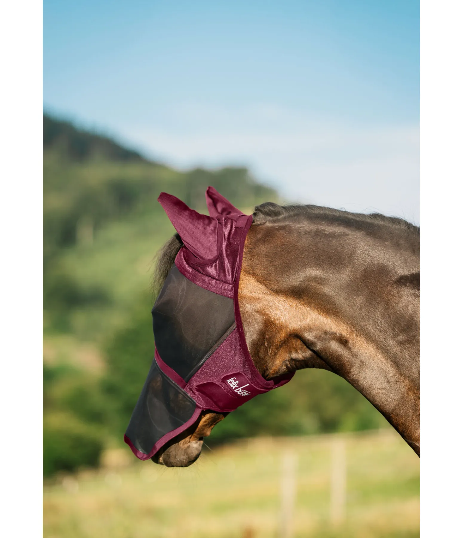 Masque anti-mouches avec protège-naseaux extra-long, pour les chevaux sensibles et / ou ayant tendance à secouer la tête. Mailles serrées et coutures permettant de maintenir le filet à distance des yeux. Matière à mailles respirantes aux oreilles. Protège parfaitement les oreilles et les yeux contre les moustiques et autres insectes. Doublure en polaire Teddy douillette au niveau du front pour éviter les irritations dues aux frottements. Avec passage de toupet et double patte auto-agrippante pour un maintien sûr. 100 % polyester.