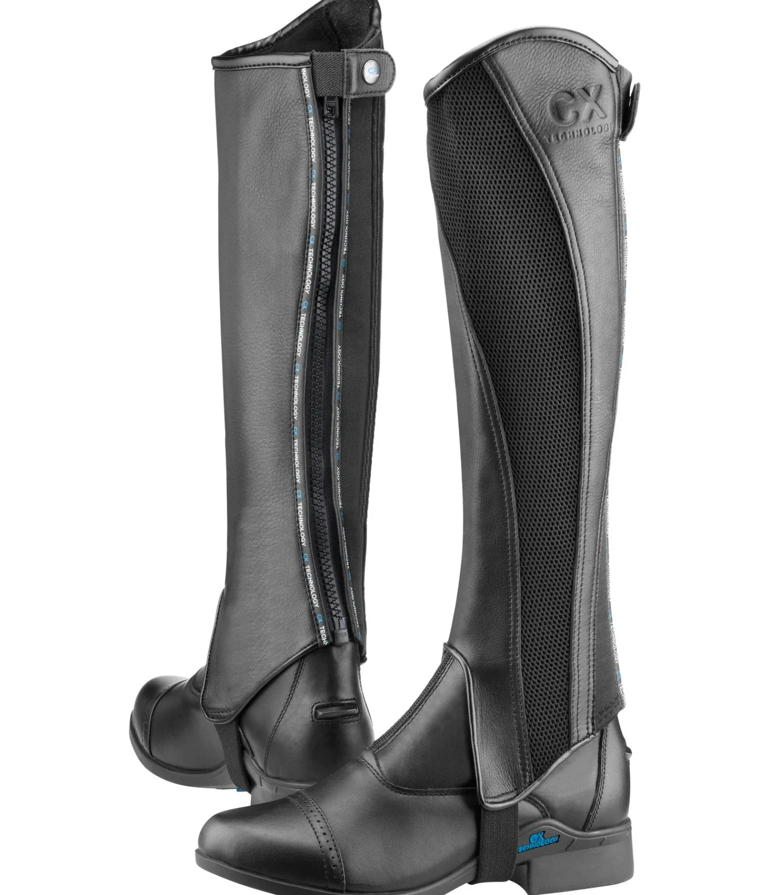 Mini-chaps respirantes grâce à la large bande de tissu mesh. Extérieur en cuir de vachette pleine fleur souple. Empiècement élastique à l’arrière pour un ajustement optimal. Fermeture à glissière YKK robuste à l’arrière. Passepoil CX Technology. Sous-pieds renforcés. Fermeture par bouton-pression.