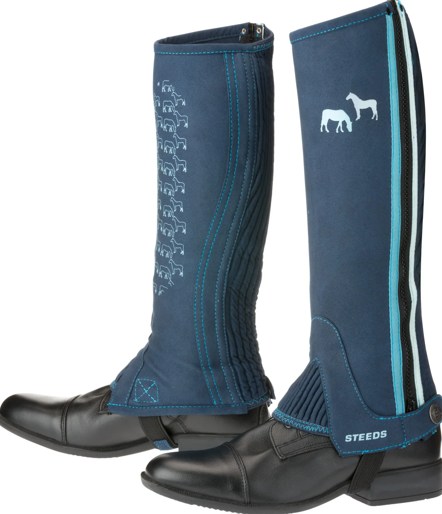 Mini-chaps tendances en synthétique Amara. Lavables en machine. Détails de couleur contrastante et grip original sur la face intérieure. Les inserts extensibles sur les côtés et au cou-de-pied s’adaptent parfaitement au mollet et à la chaussure d’équitation. Fermeture à glissière robuste avec rabat fermé par bouton-pression en bas. Sous-pieds élastiques.
