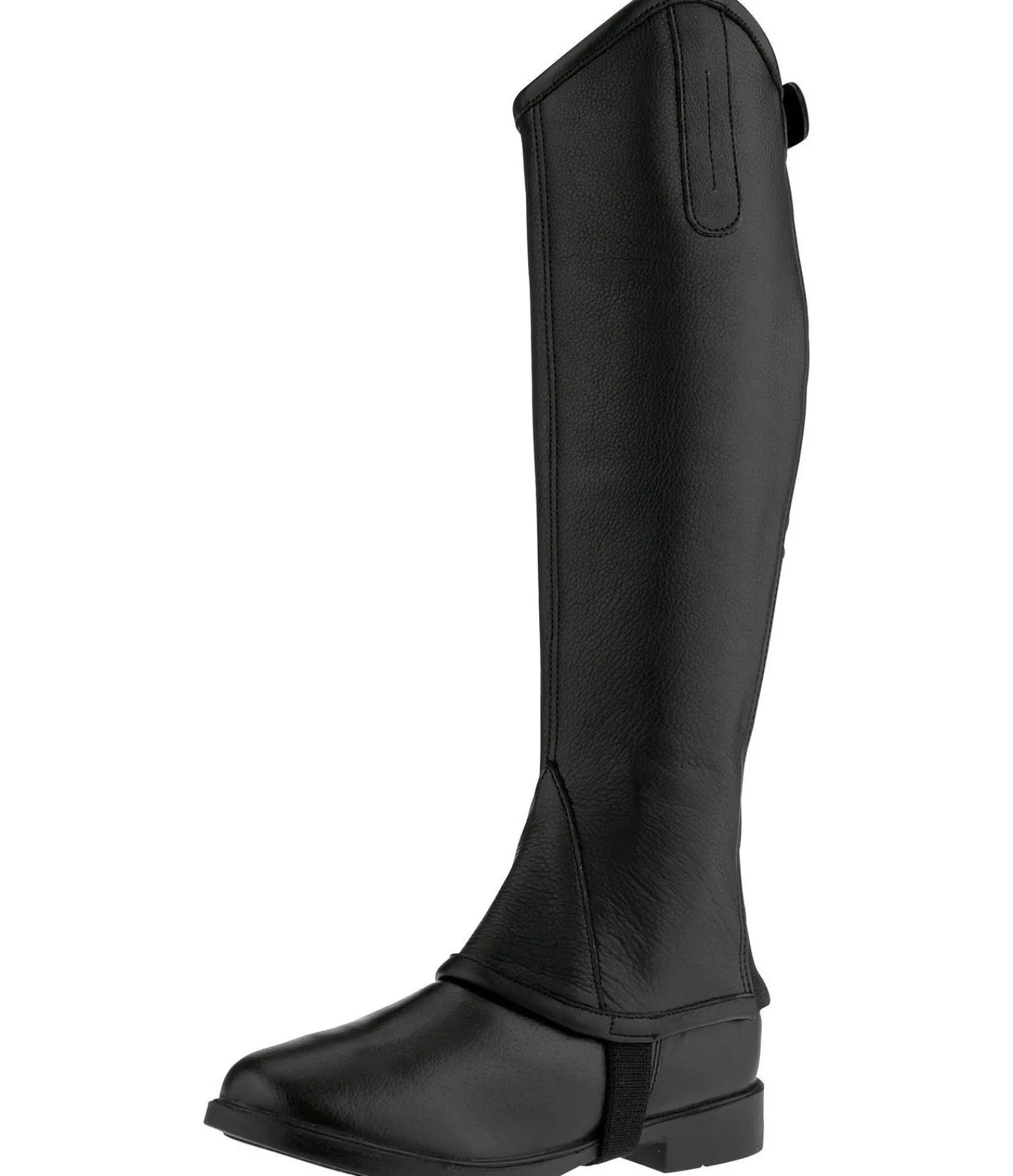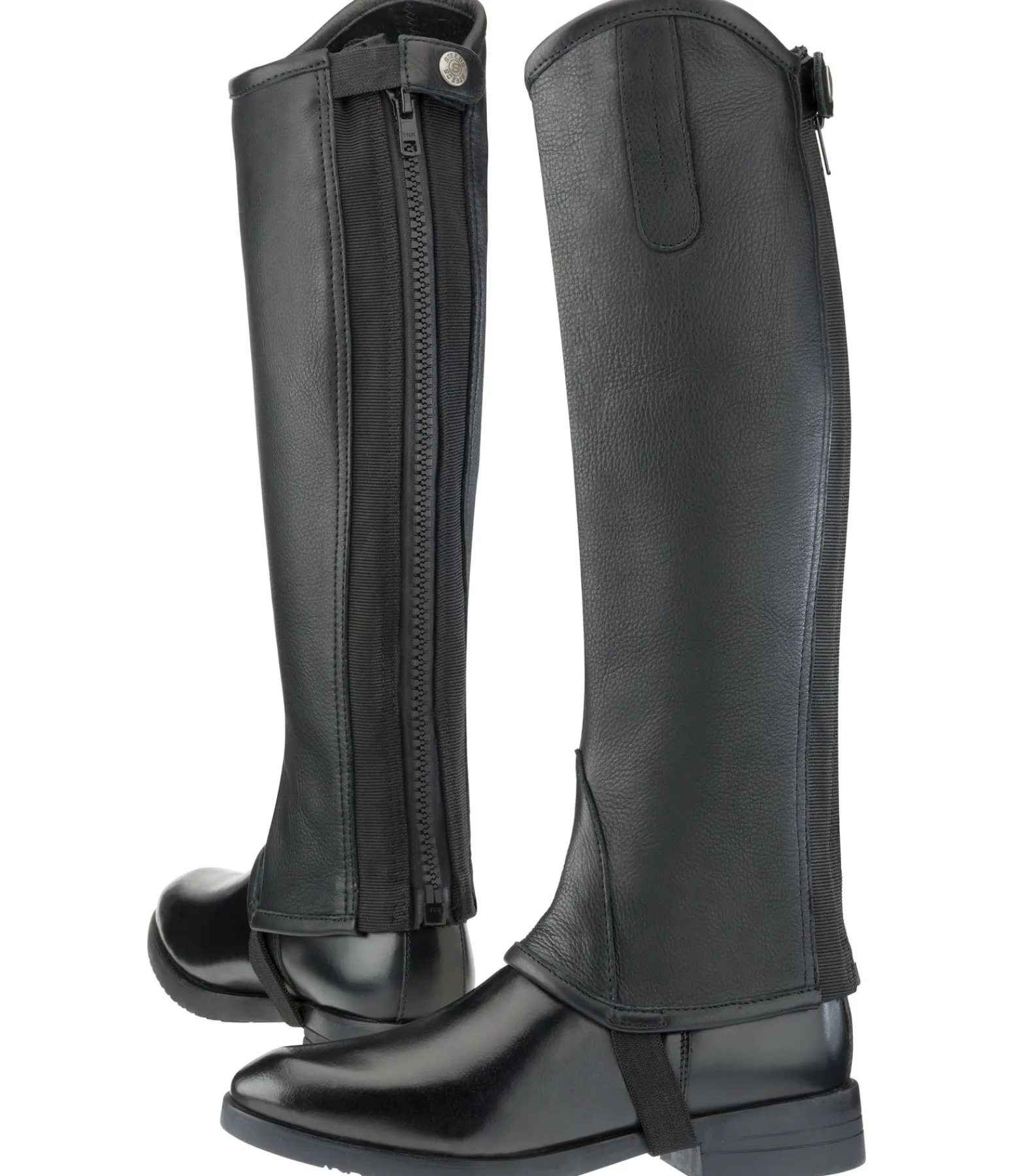 Mini-chaps souples dans un design évoquant des bottes cavalières. Dessus en cuir de vachette naturellement grainé, doux et résistant. Empiècements élastiqués le long de la fermeture à glissière pour un ajustement optimal.