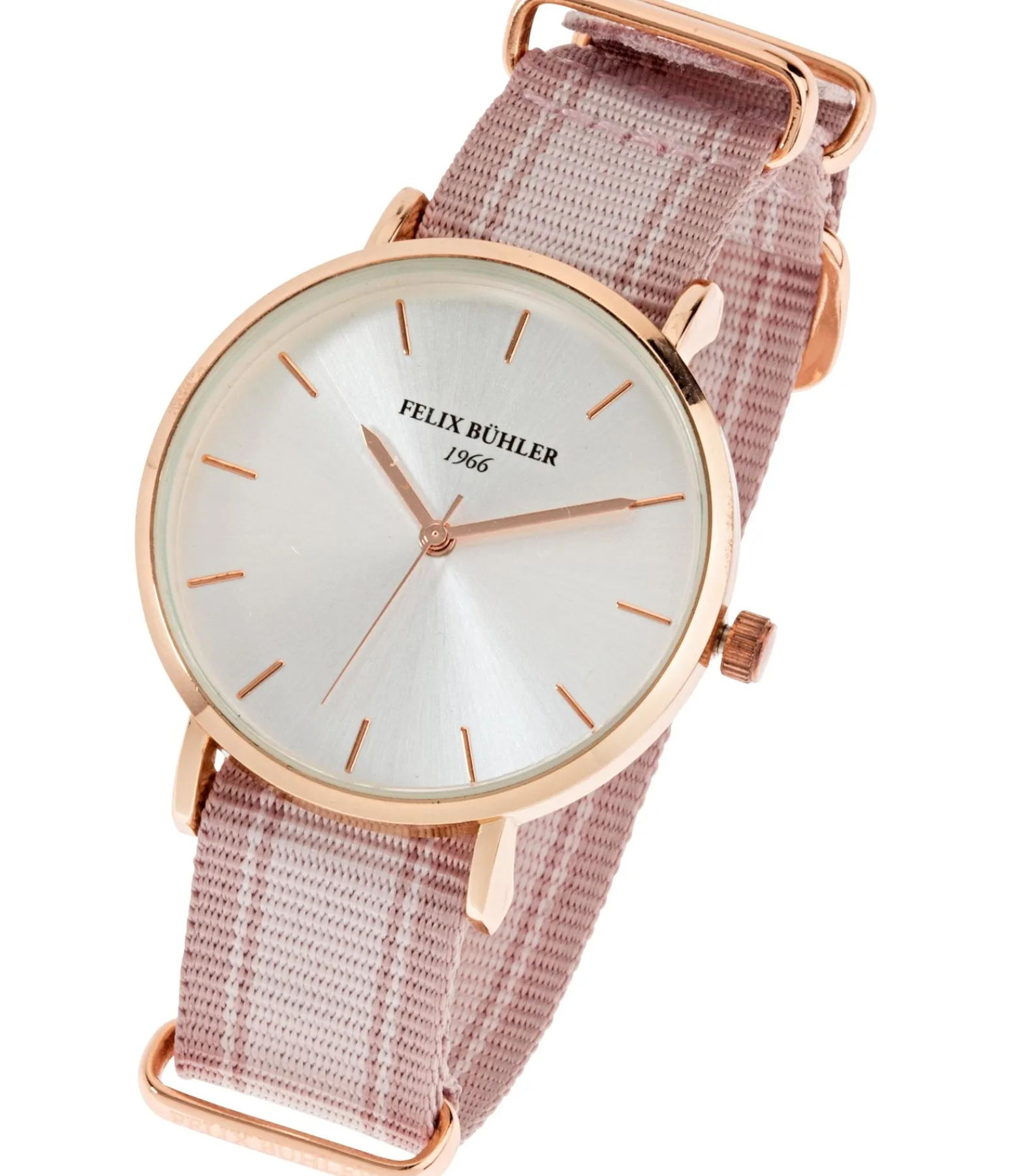 Montre avec joli cadran Felix Bühler. Sportswear. Bracelet en tissu robuste avec rayures bicolores. Cadran rose doré brillant. Mouvement Miyota 2035. Étanchéité 3 ATM signifiant que la montre résiste aux éclaboussures. Livrée dans une jolie boîte à bijoux Felix Bühler. Diamètre 35 mm. Bracelet 23,5 x 1,8 cm.
