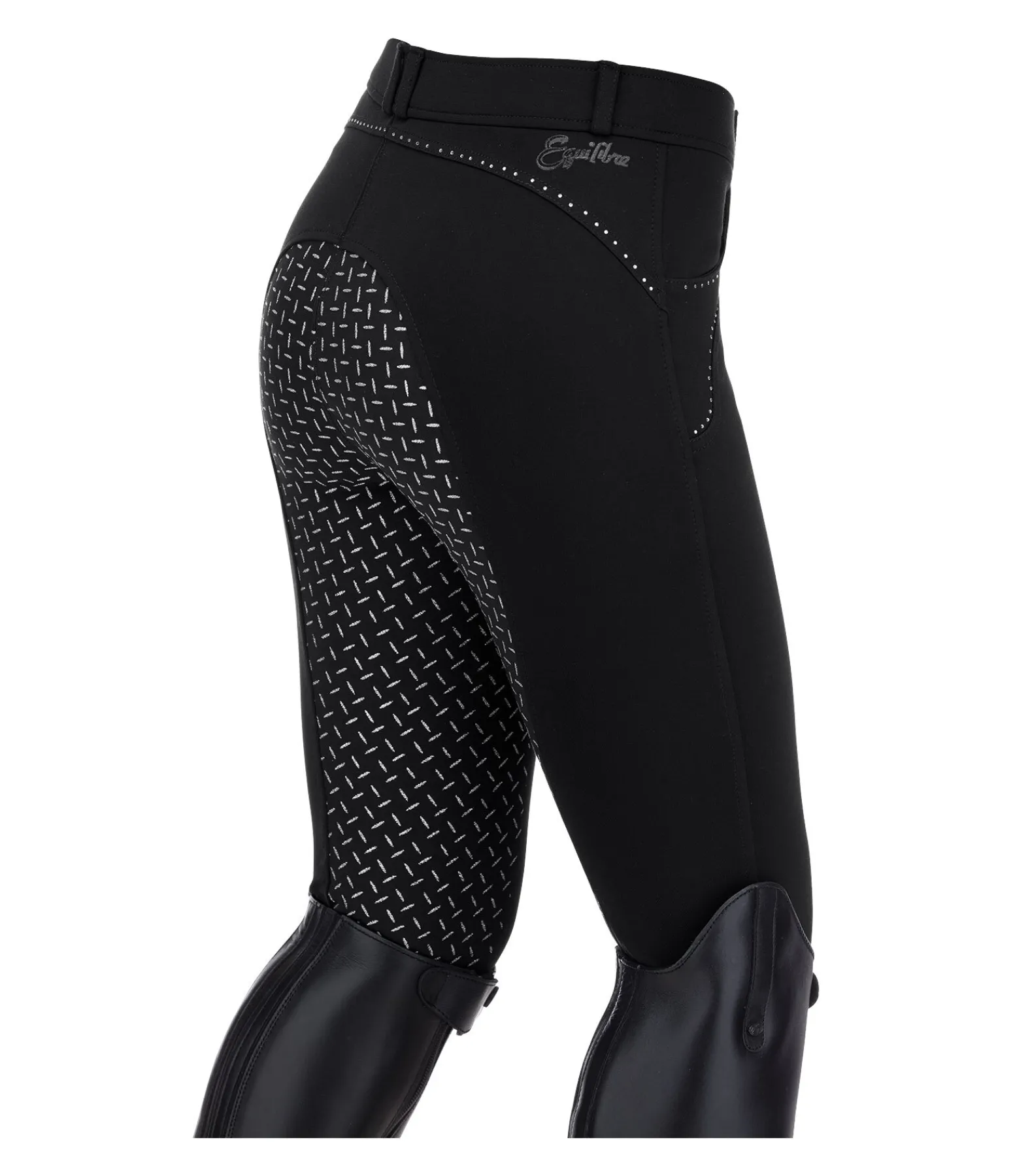 Pantalon d’équitation. Fond intégral grip en silicone scintillant. Matière stretch respirante, extensible dans 4 directions et ultra confortable. Strass sur les poches avant. Bas de jambe extensible sans patte auto-agrippante. 68 % viscose, 27 % polyamide, 5 % élasthanne.