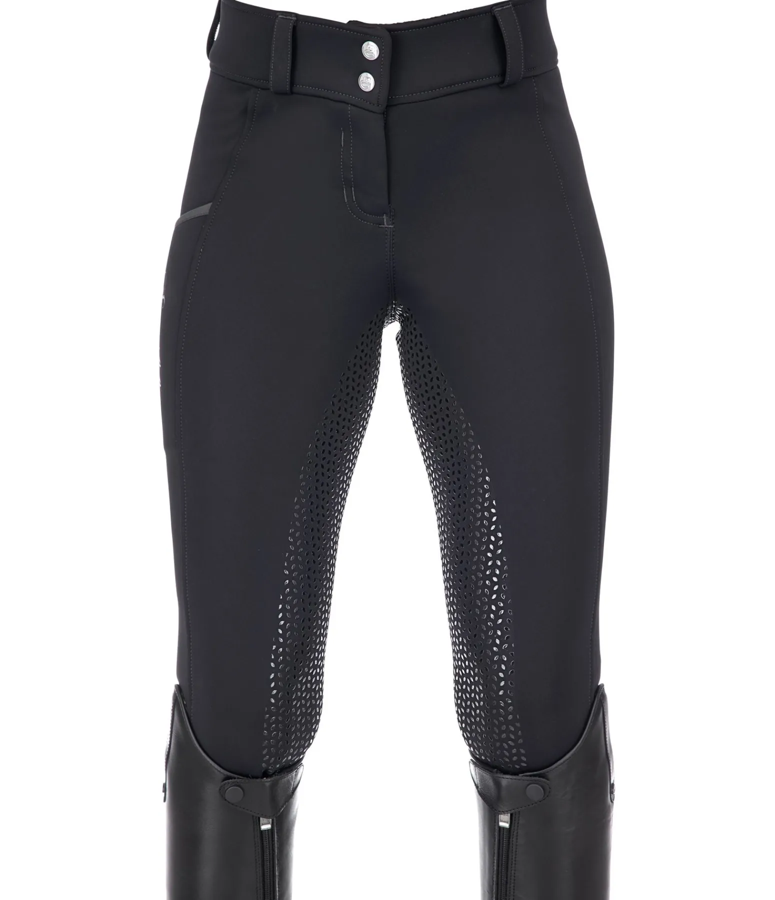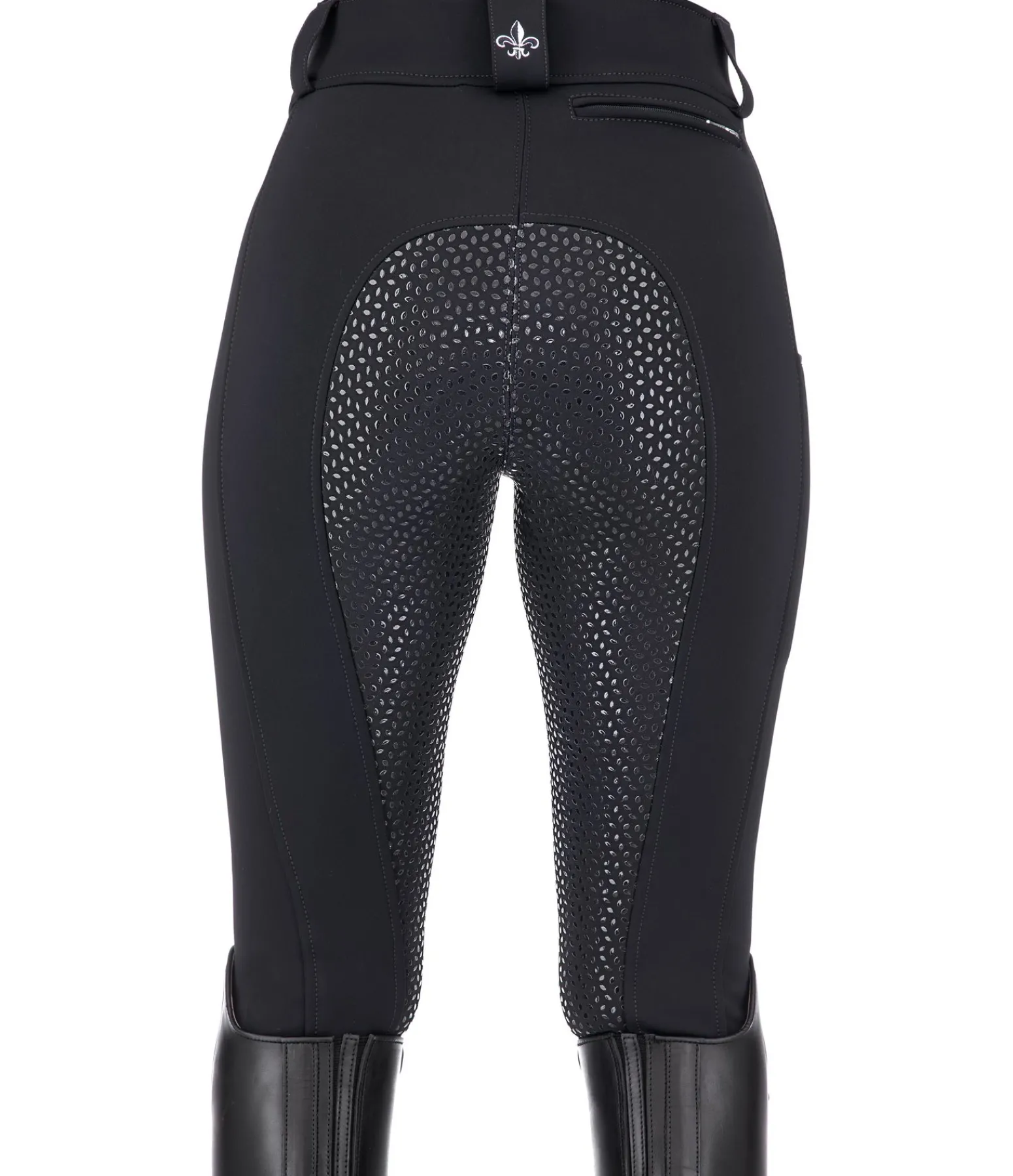 Legging d’équitation confortable avec fond intégral grip en silicone. Matière extensible lisse à l’extérieur et confortable à l’intérieur. Ceinture extra large élastiquée. Une poche zippée pour téléphone portable sur la cuisse. Bas de jambe extensible sans patte auto-agrippante. 86 % polyester, 14 % élasthanne.