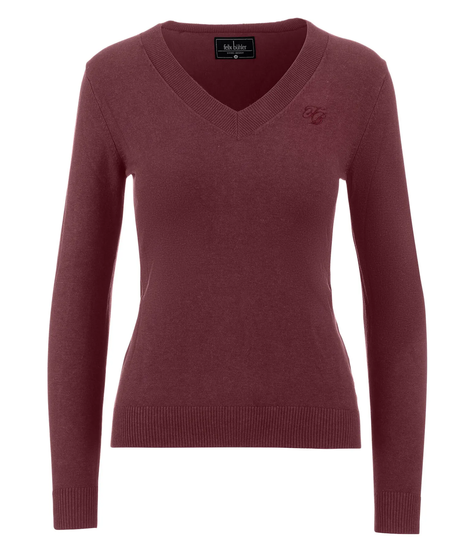 Pull classique avec col en V. Matière douce. Discrète broderie Felix Bühler sur la poitrine. Finition bord-côte à la taille, au col et aux poignets. 80 % viscose, 20 % nylon.