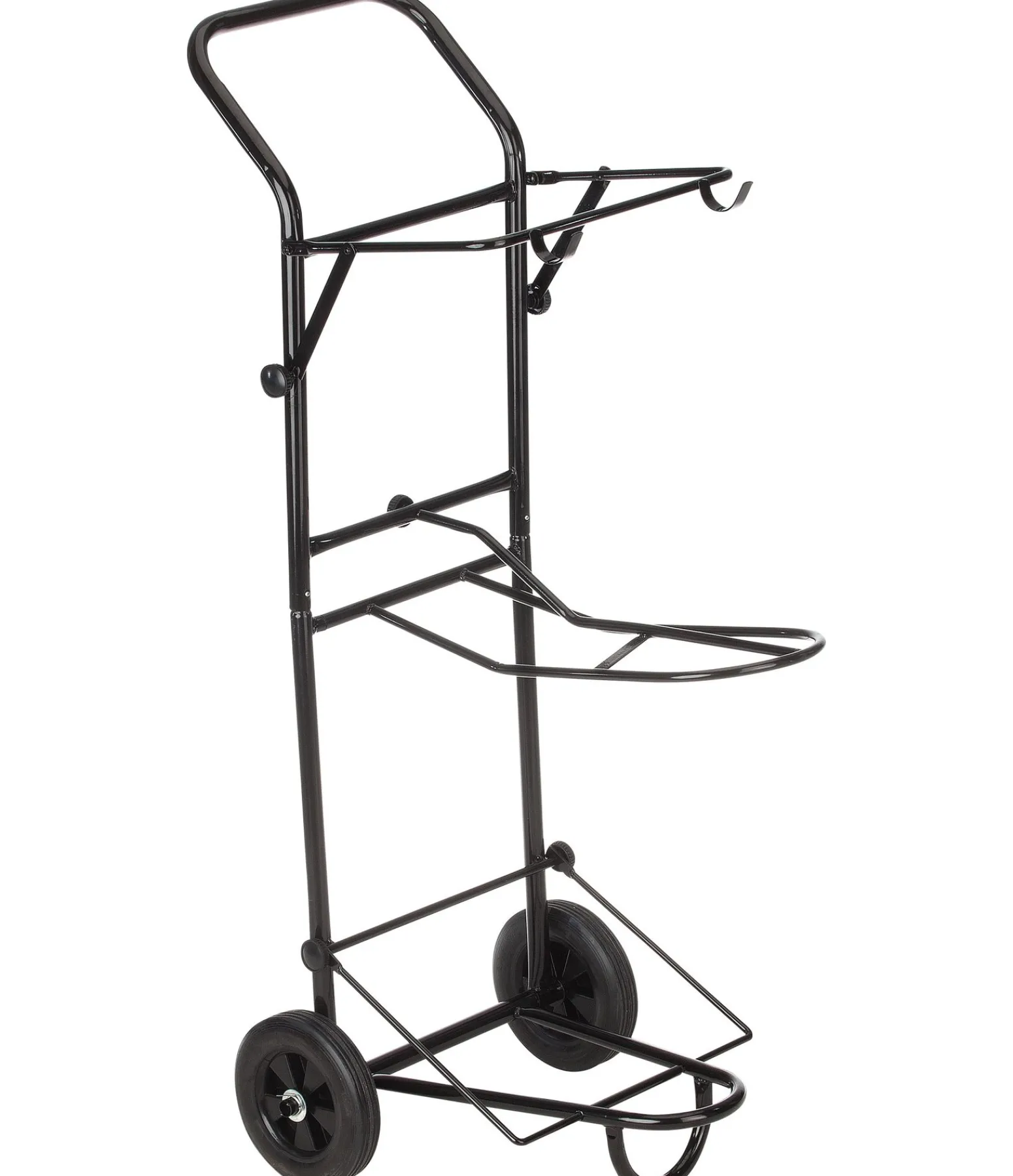 Chariot porte-selle maniable et solide. Monté sur roulettes, en acier creux, avec supports pour la selle, la briderie et pour le coffre de pansage. Parfaitement adapté à notre coffre de pansage Lissabon, il s’utilise à l’écurie, en concours ou en voyage. 130 x 58 x 38 cm. Insert pour coffre de pansage 30 x 40 cm. Pliable.