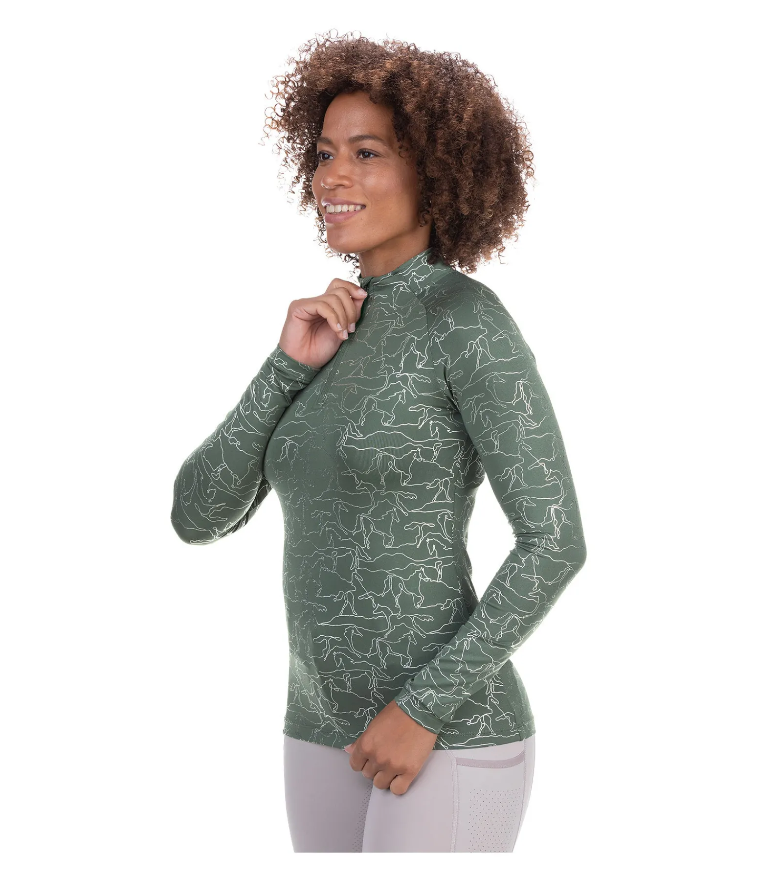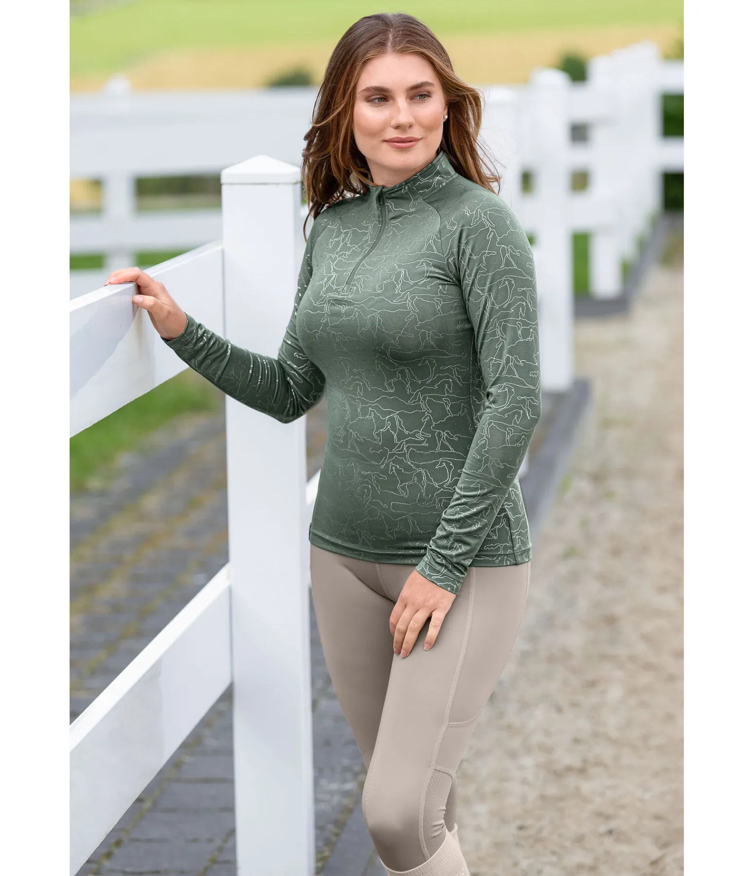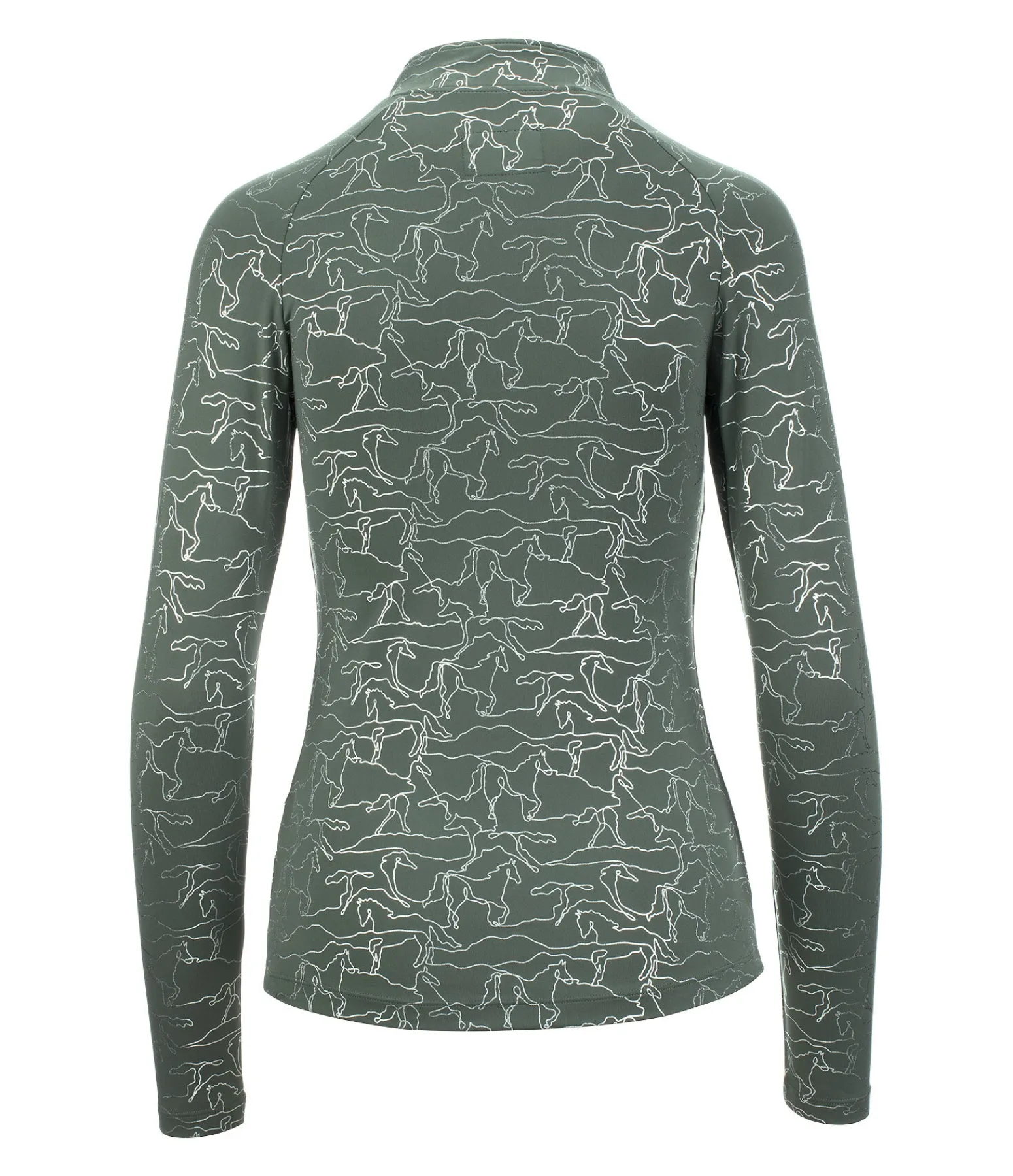 T-shirt technique à manches longues. Imprimé métallisé cheval all-over. Manches raglan. Col montant zippé avec protège-menton. Matière respirante. Séchage rapide. 88 % polyester, 12 % élasthanne.