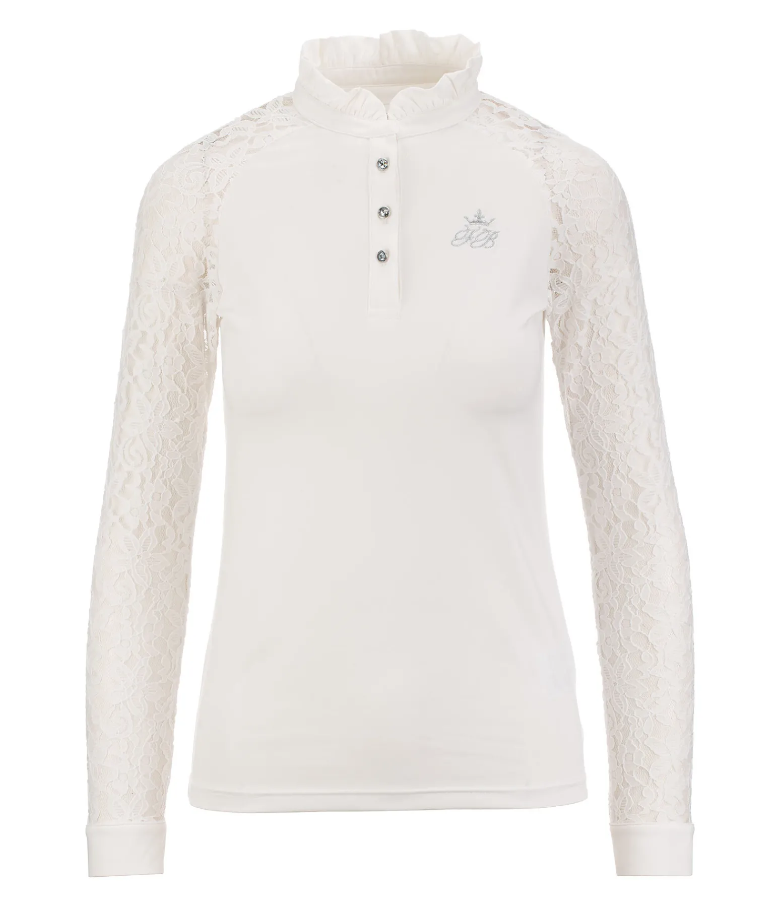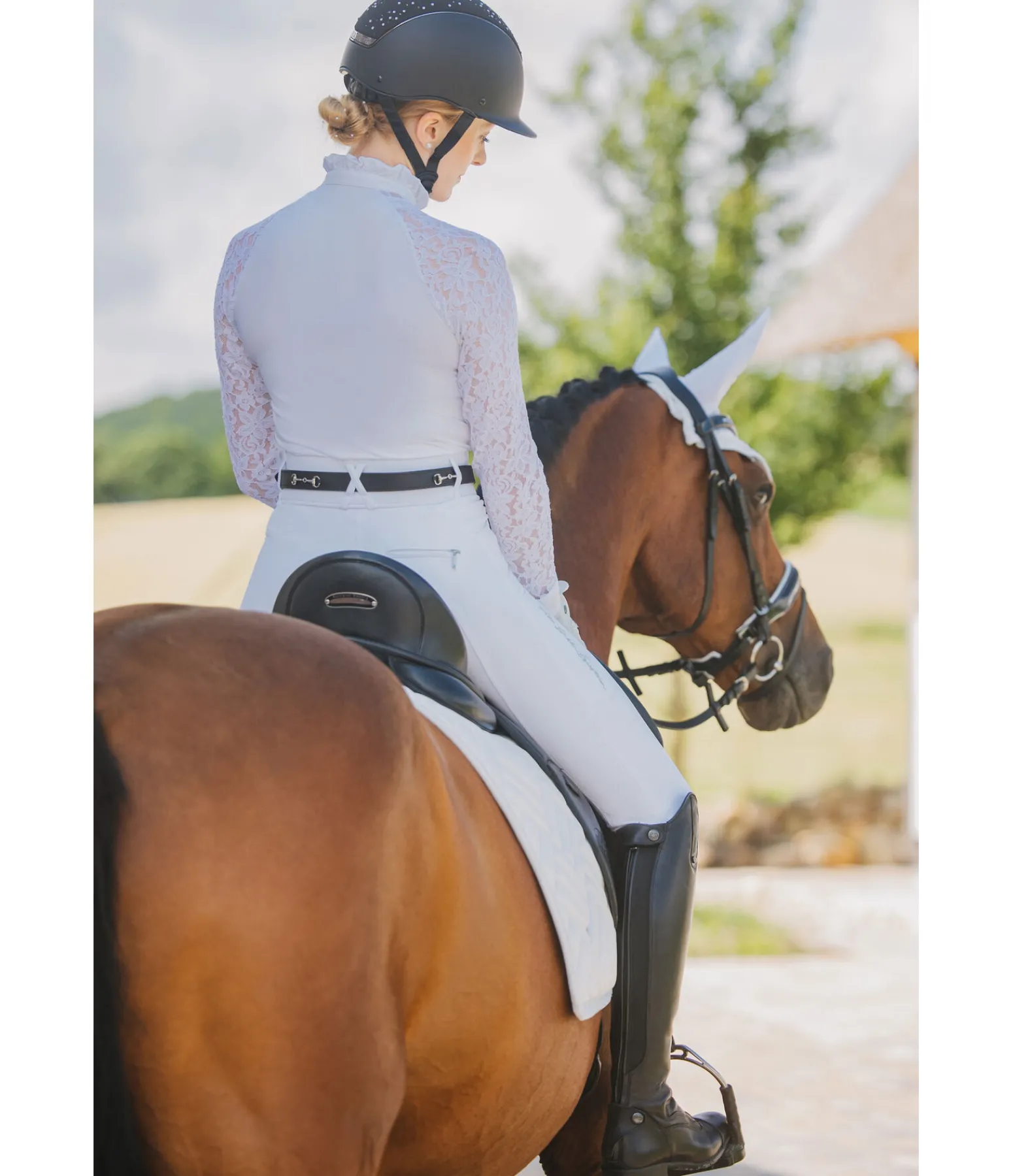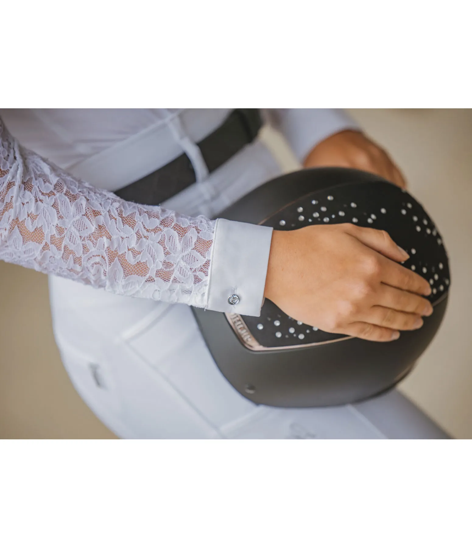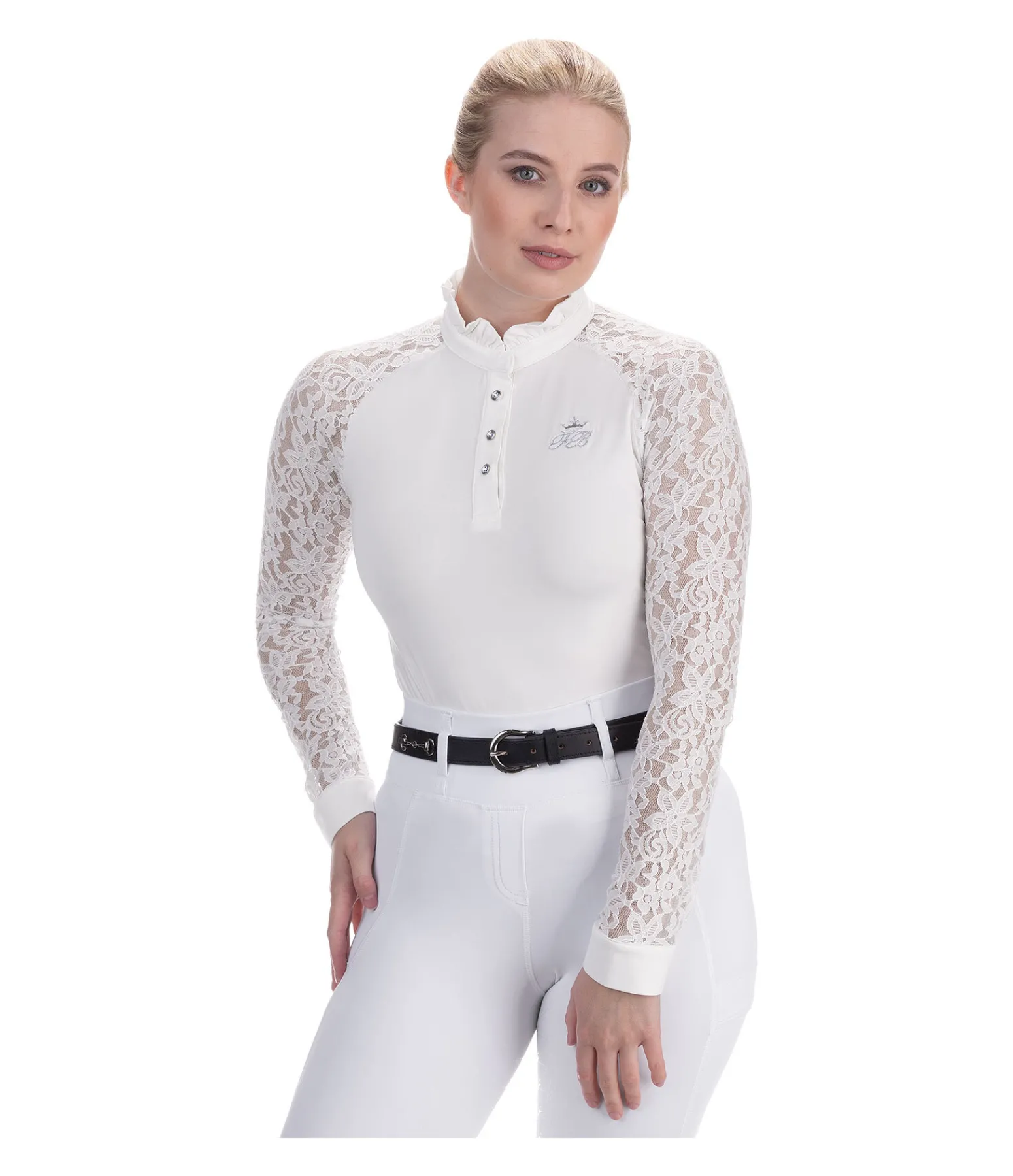 Élégant T-shirt de concours à manches longues en dentelle douce avec col à volants et boutons à strass. Respirant et à séchage rapide. 88 % polyester, 12 % élasthanne. Recommandation : laver à la main ou dans un sac de lavage.