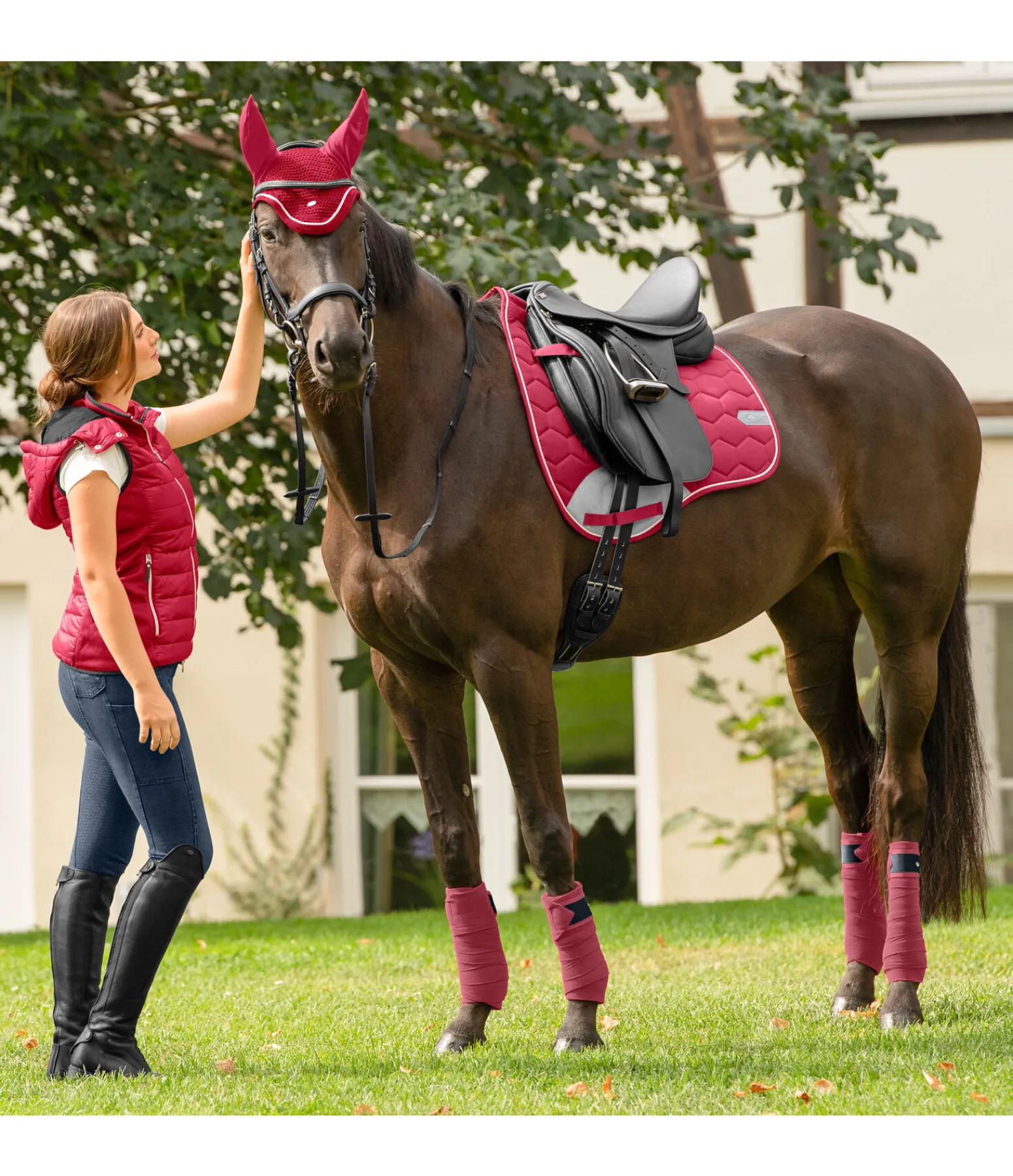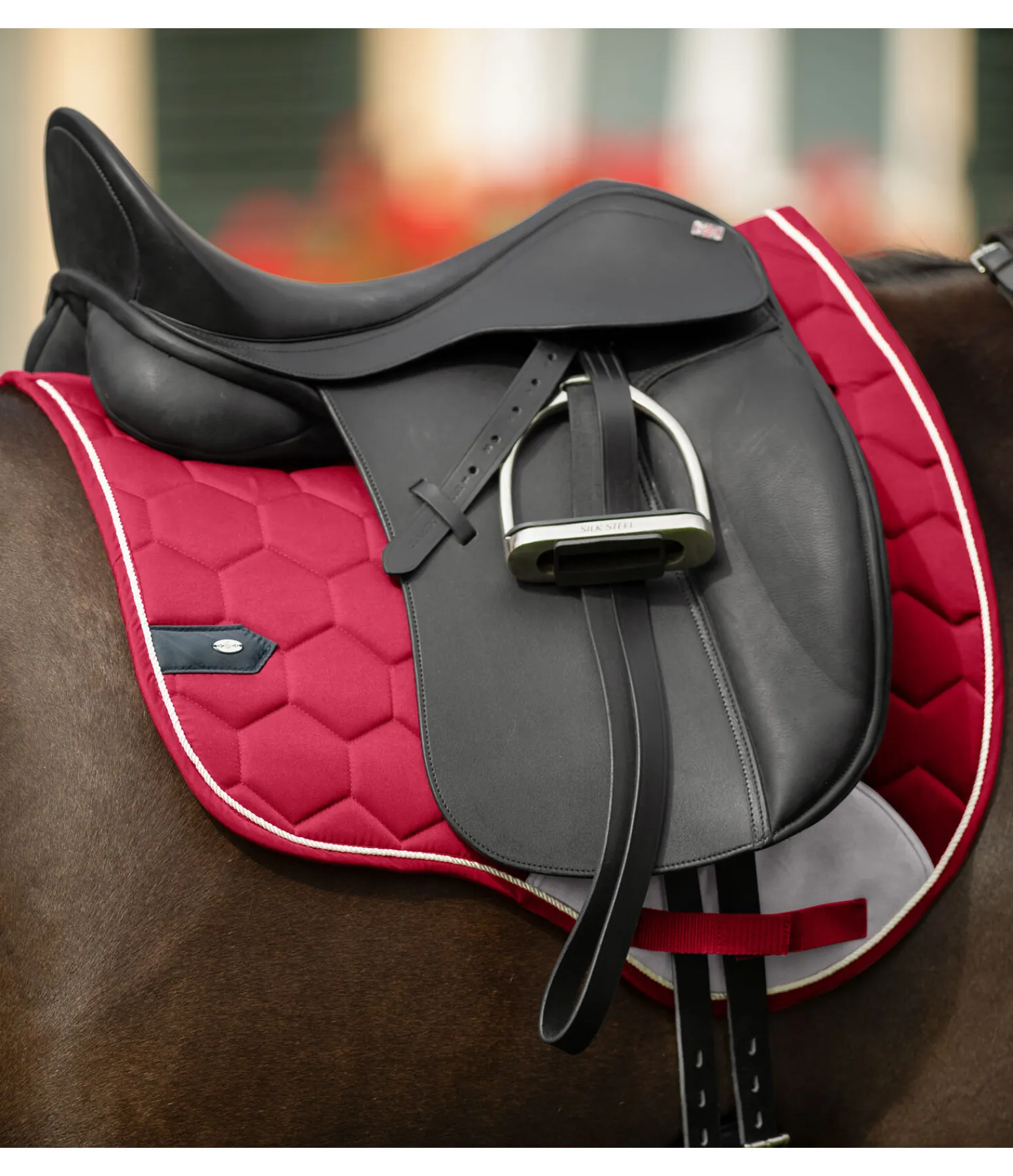 Tapis de selle dans une coupe sportswear avec protection contre les frottements de couleur contrastante à l’aspect velours au passage de sangle. Petite plaque argentée filigrane avec logo gravé de chaque côté et cordon décoratif discret satiné de couleur contrastante. Passants de sangle et de contre-sanglons avec patte auto-agrippante pratique. Dessous en Air mesh respirant et absorbant l’humidité. Dessus 100 % coton, rembourrage et dessous 100 % polyester.