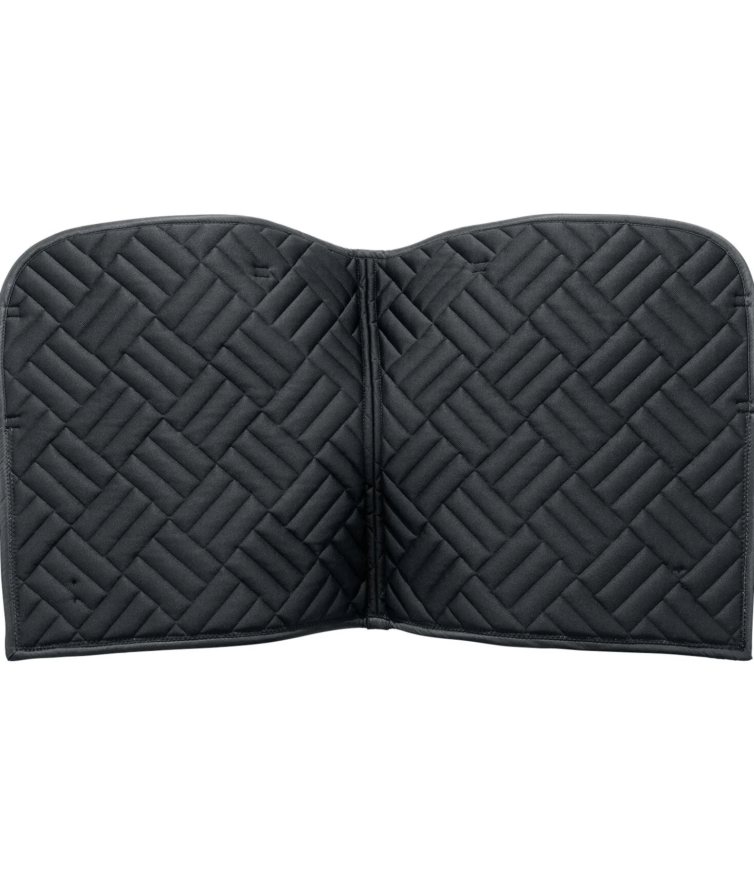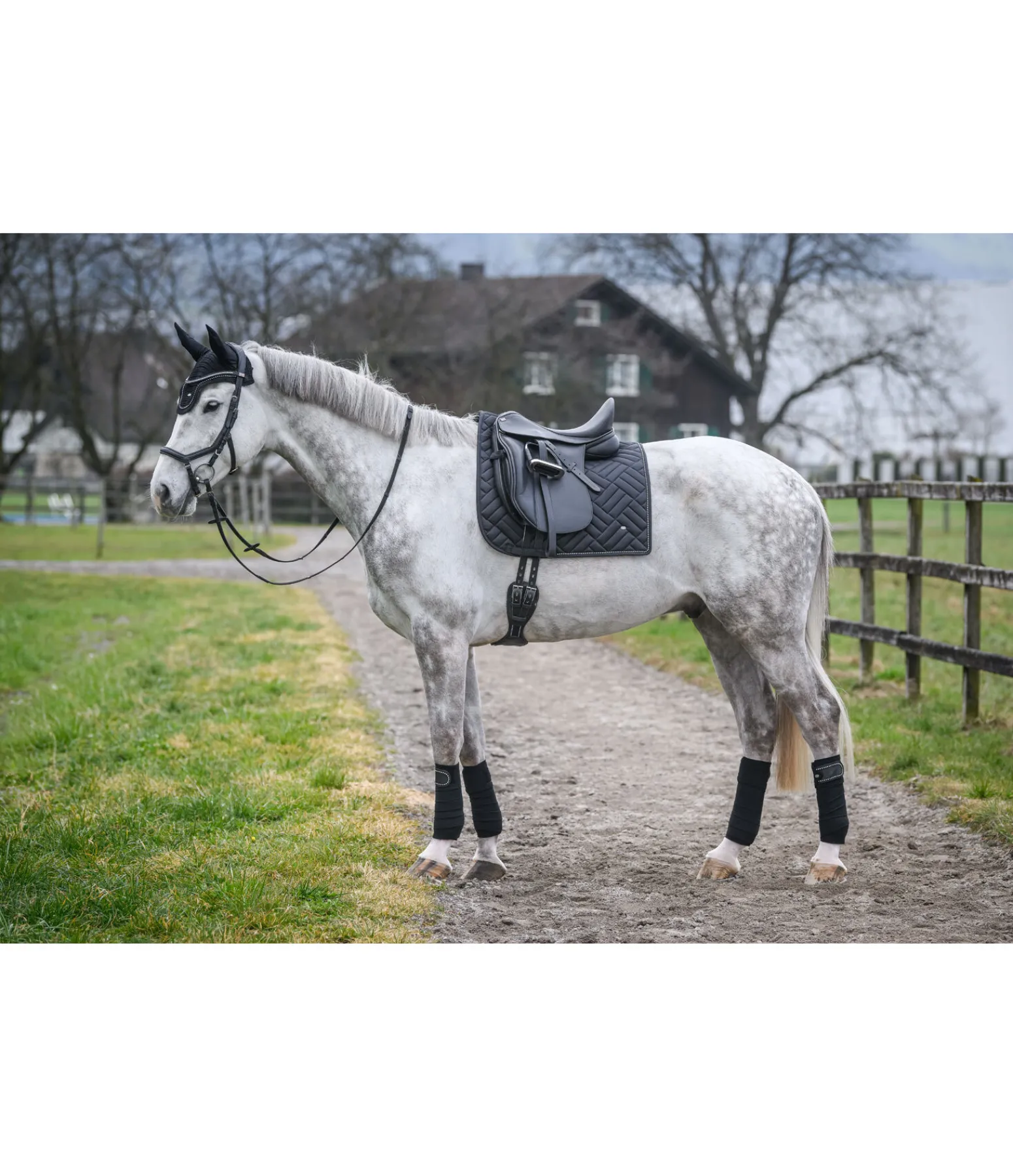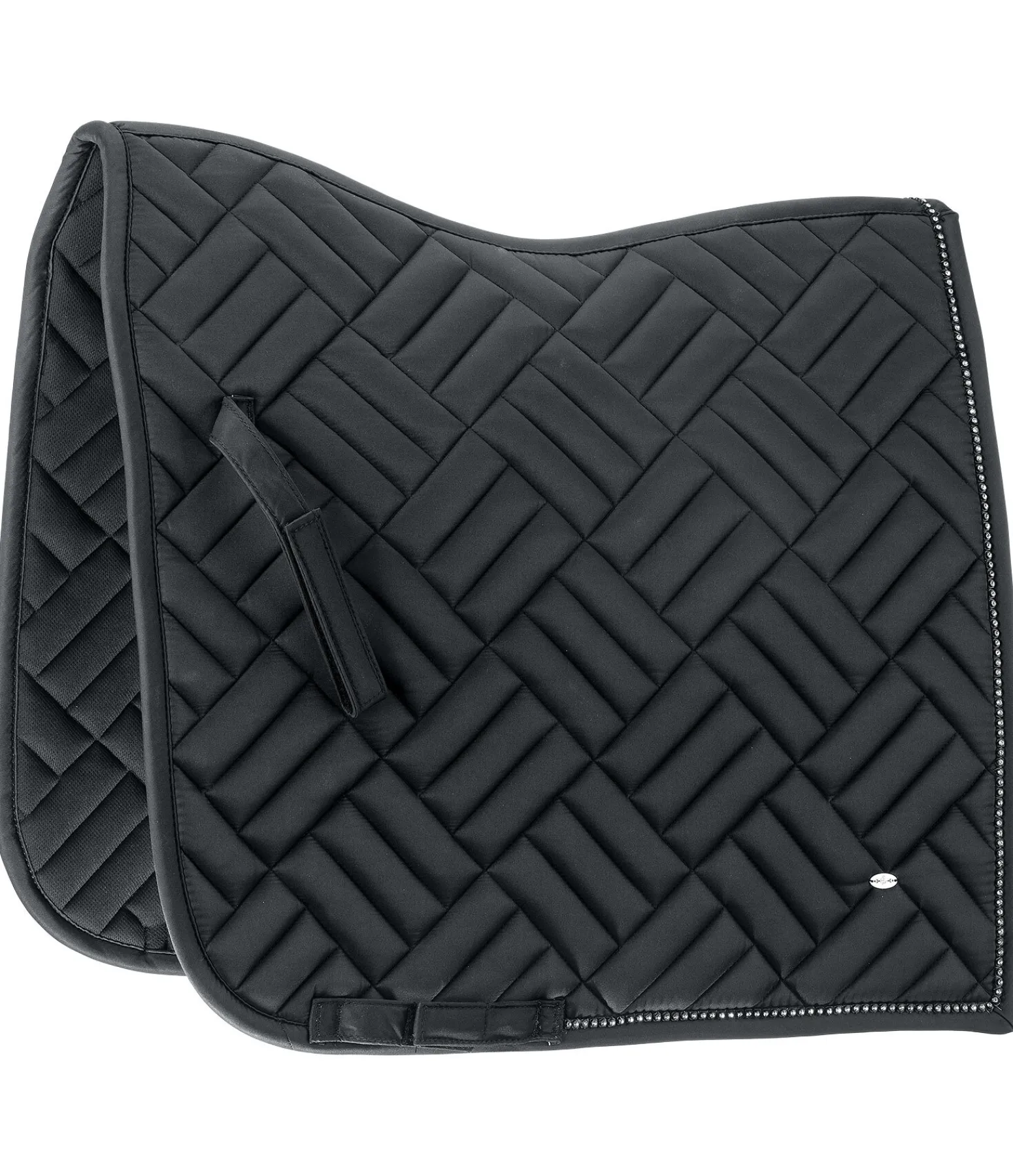 Tapis de selle de forme carrée, particulièrement élégant, avec surpiqûres apparentes. Passepoil avec strass. Petit médaillon discret avec logo gravé. Passants de sangle et de contre-sanglons avec patte auto-agrippante fonctionnelle. Dessous Air mesh respirant et absorbant l’humidité. 100 % polyester.