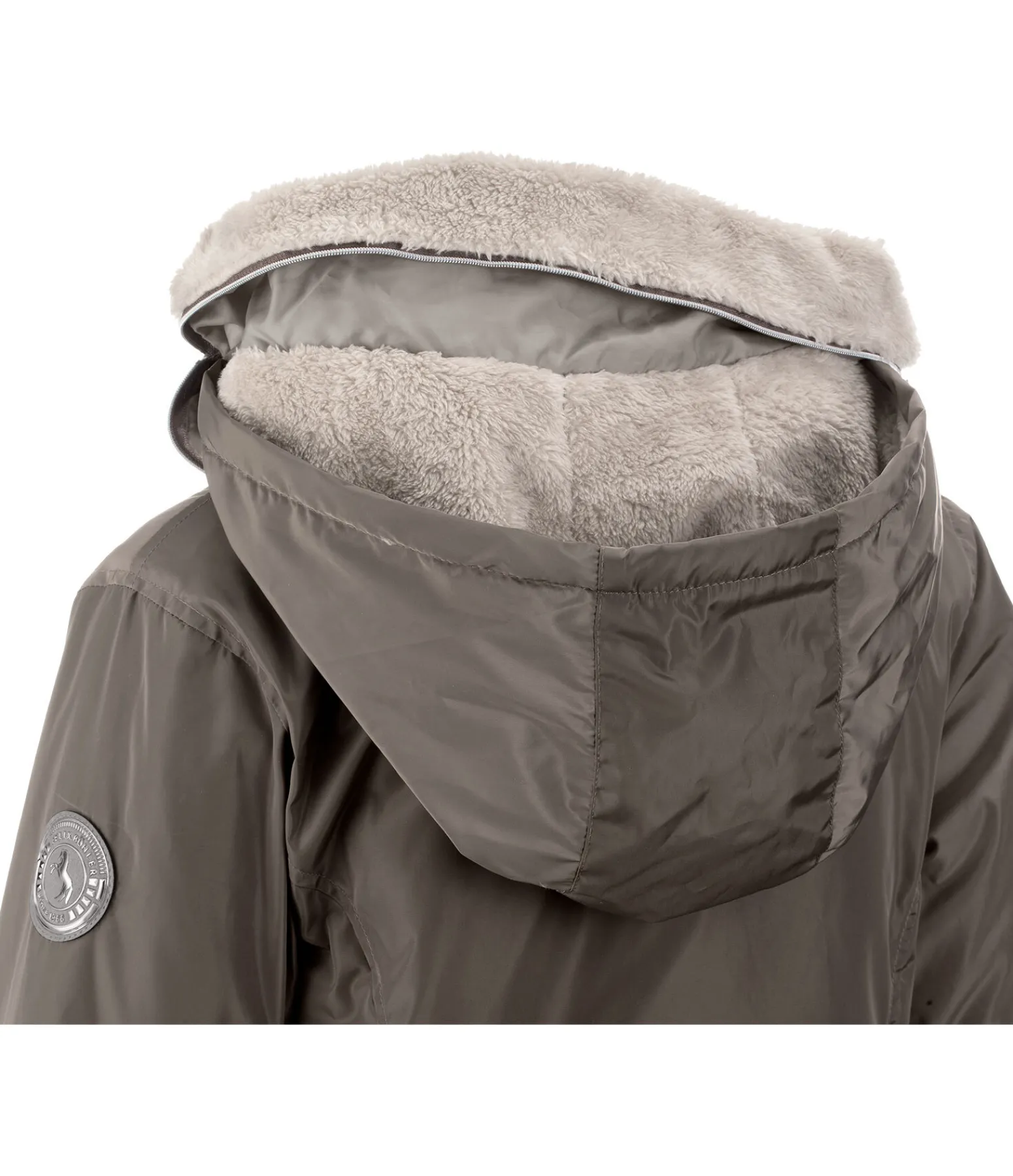 Veste d’équitation d’hiver technique, déperlante et coupe-vent. Matière respirante et chaude. Large col et capuche amovible doublés en polaire Teddy douce. Capuche rétractable dans le large col. Garnissage imitation duvet. Fermeture à glissière double sens dissimulée avec protège-menton. Deux poches zippées latérales dissimulées et une poche intérieure. Taille ajustable. Deux fentes cavalières avec boutons-pression à l’arrière. Badge logo Felix Bühler sur la manche. Fermeture à glissière et boutons-pression rose doré. 100 % polyester.