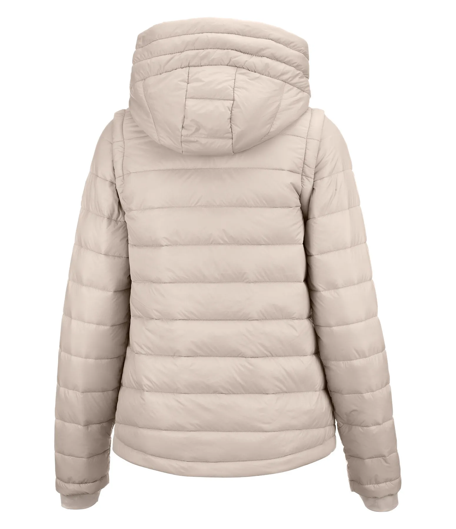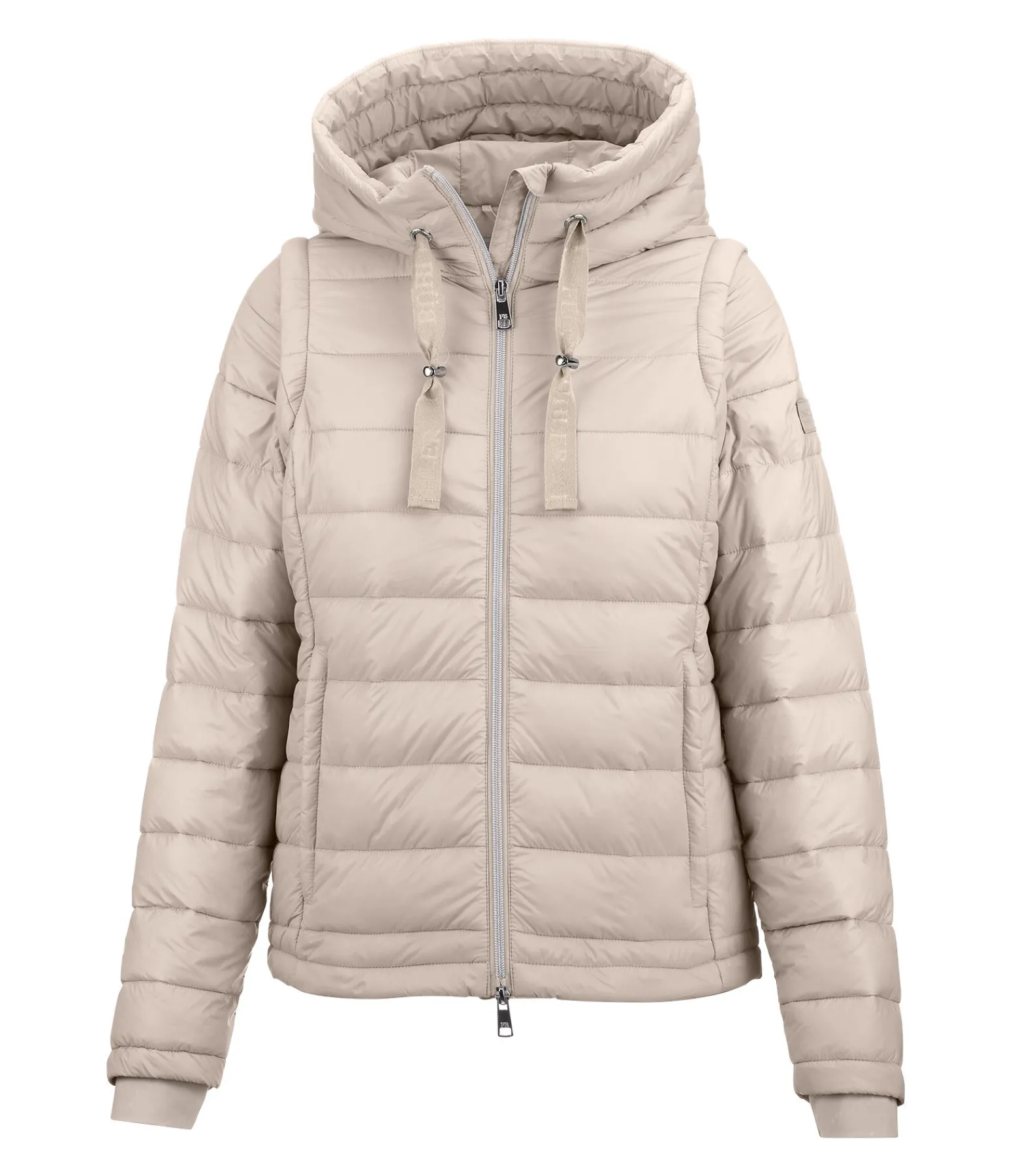 À la fois veste et gilet ! Veste d’équitation matelassée sportswear et confortable. Manches amovibles par fermeture à glissière. Capuche ajustable pouvant être fixée dans le dos par un bouton-pression. Fermeture à glissière double sens avec sous-patte et protège-menton, 2 poches zippées à l’avant. Bas des manches avec finition bord-côtes coupe-vent. 100 % nylon.