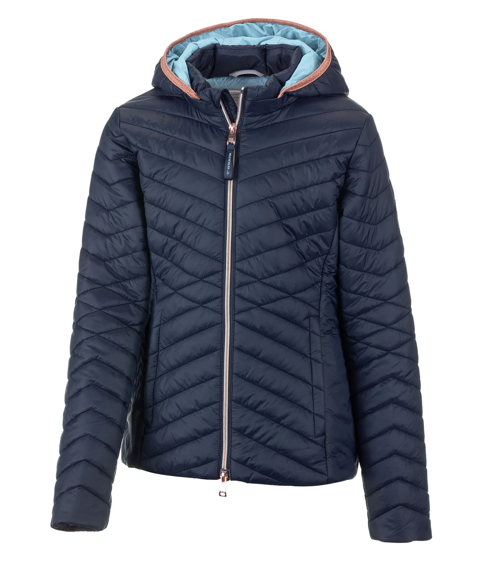 Veste d’équitation à capuche, légèrement matelassée avec garnissage imitation duvet. Doublure intérieure de couleur contrastante. Fermeture à glissière double sens rose doré avec protège-menton. Deux poches zippées latérales dissimulées. Badge logo sur la manche. Capuche avec passepoil rose doré scintillant, amovible par boutons-pression. 100 % nylon, garnissage 100 % polyester.