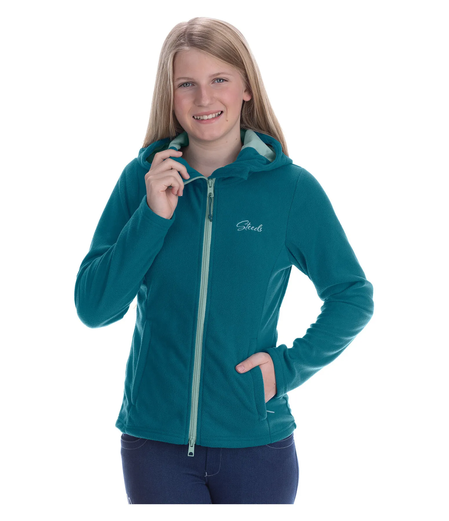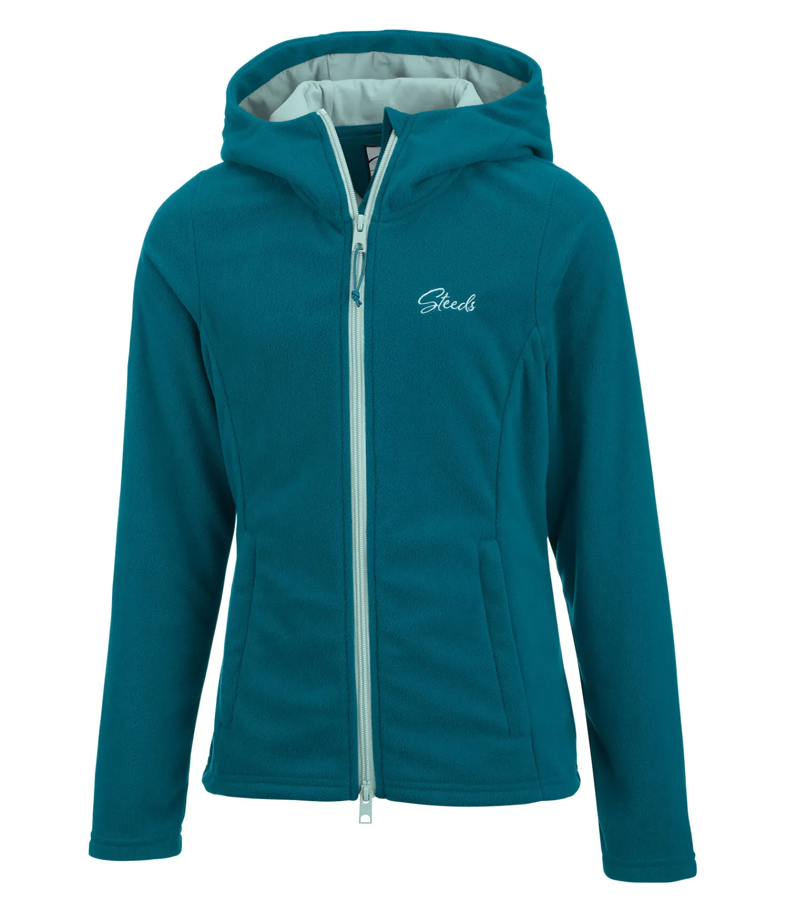 Veste polaire à capuche. Coupe légèrement plus longue à l’arrière. Fermeture à glissière bidirectionnelle de couleur contrastante avec protège-menton. Deux poches latérales zippées dissimulées. Logo STEEDS brodé sur la poitrine. Matière en polaire 100 % polyester, doublure de la capuche 95 % coton, 5 % élasthanne.