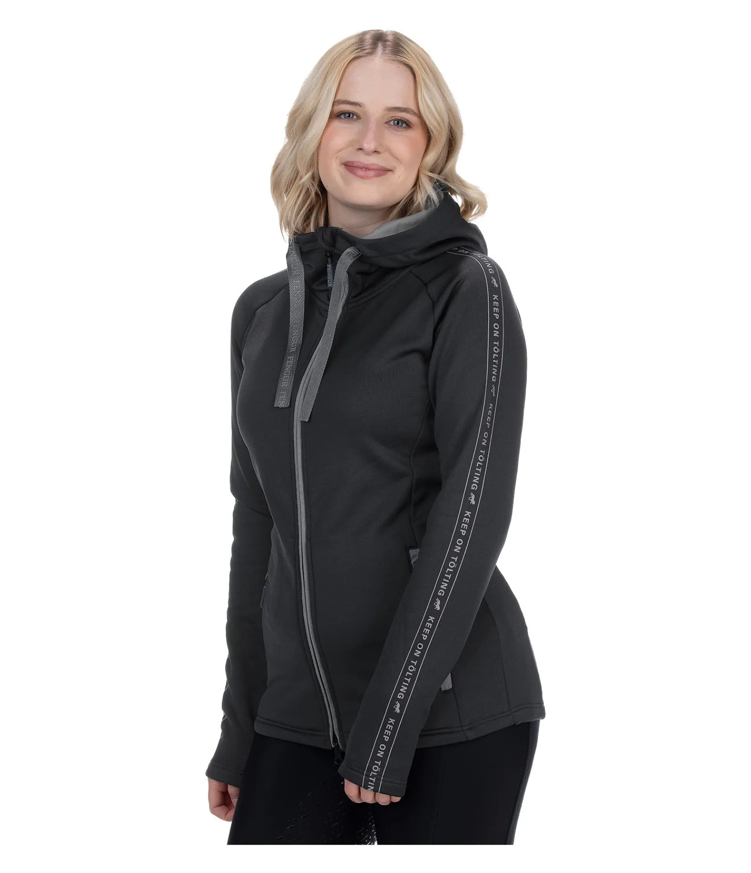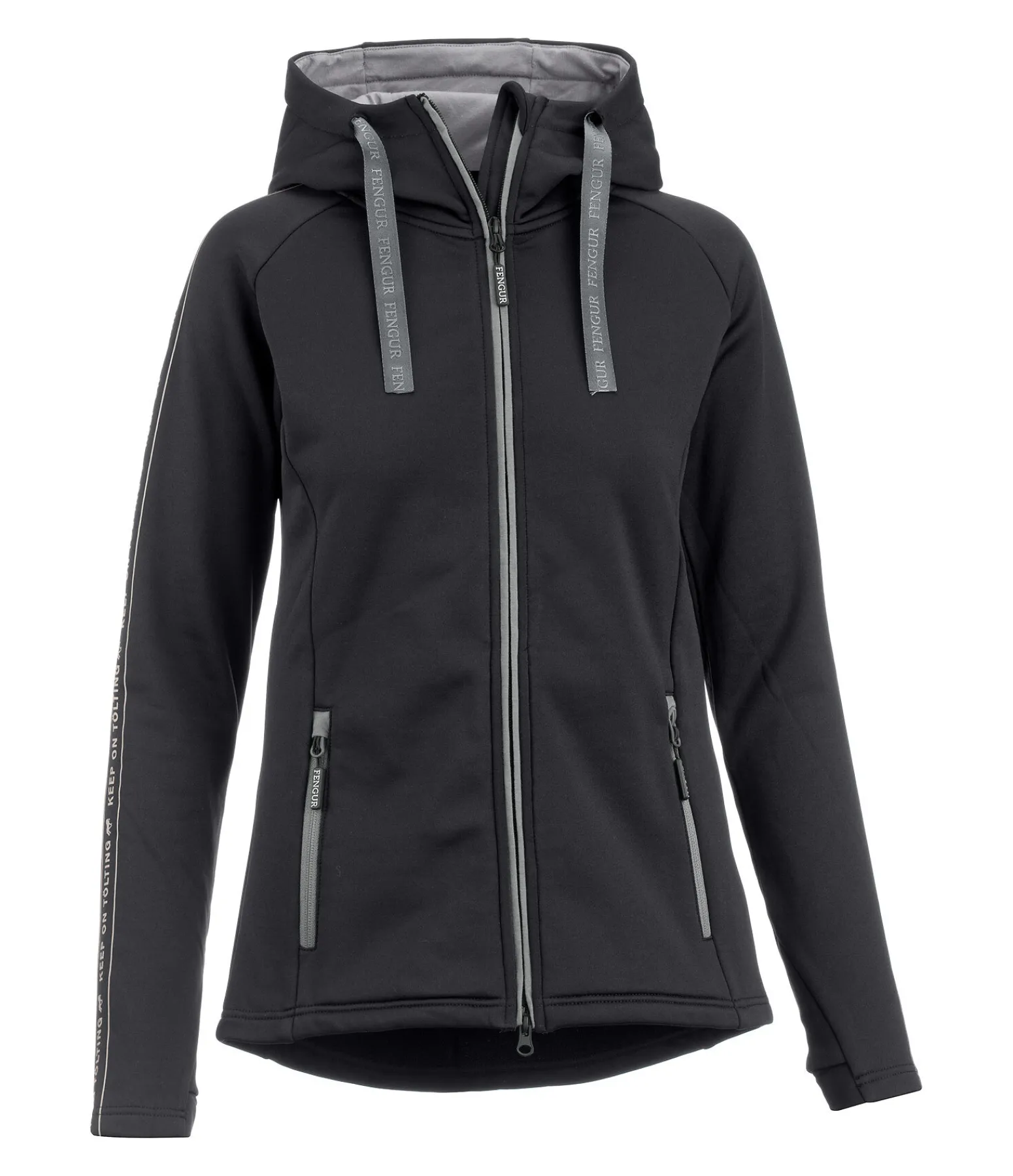 Veste à capuche technique et respirante avec intérieur doux. À séchage rapide. Fermeture à glissière double sens dissimulée, 2 poches zippées, capuche réglable par cordons de serrage et pouvant être fixée dans le dos. Avec inscription sur les manches et passe-pouce intégré. 93 % polyester, 7 % élasthanne.