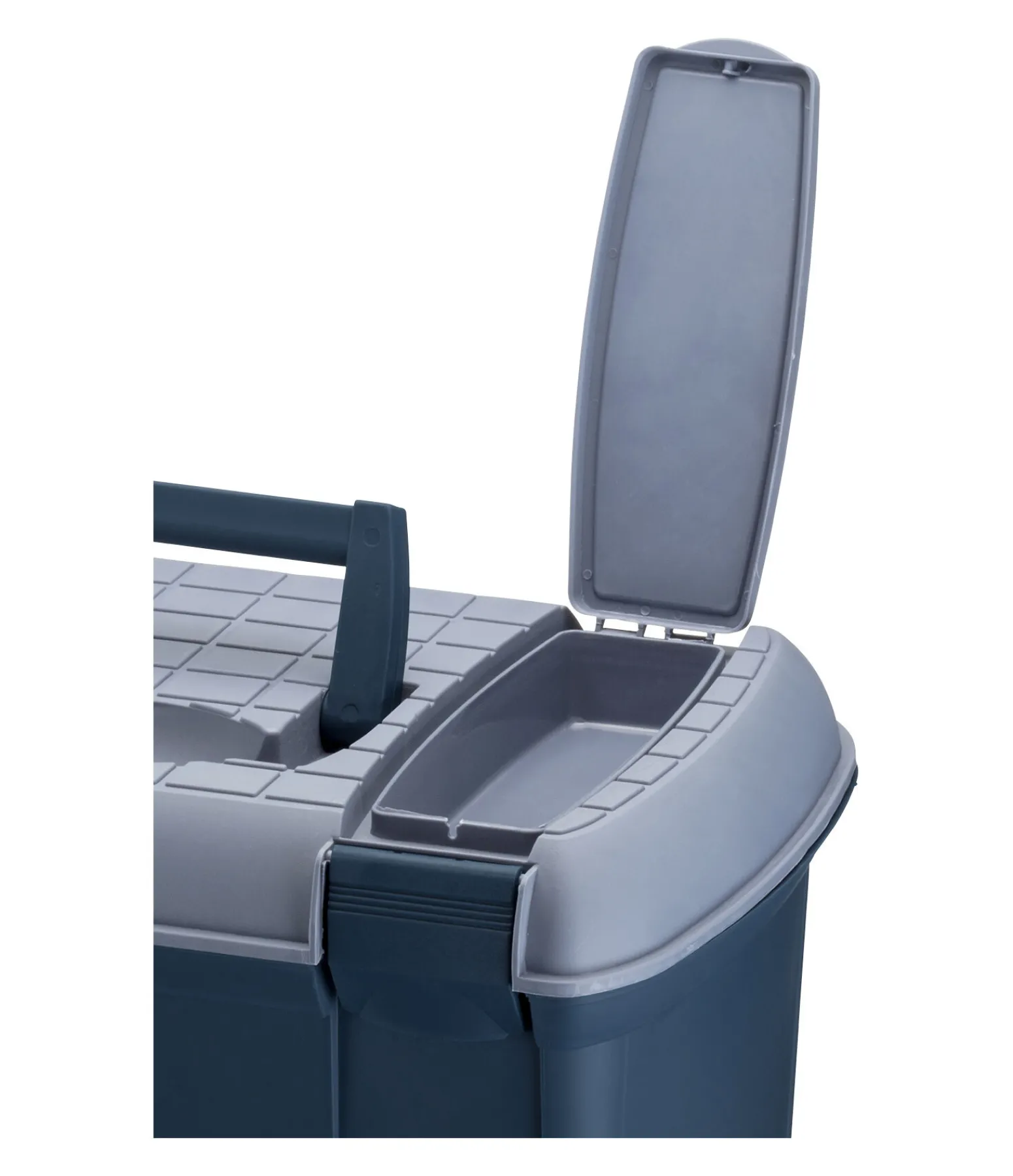 Coffre de pansage solide en plastique avec intérieur compartimenté. Compartiment pour petits accessoires amovible. Verrouillable. Cadenas non inclu. 39 x 25 x 25 cm.