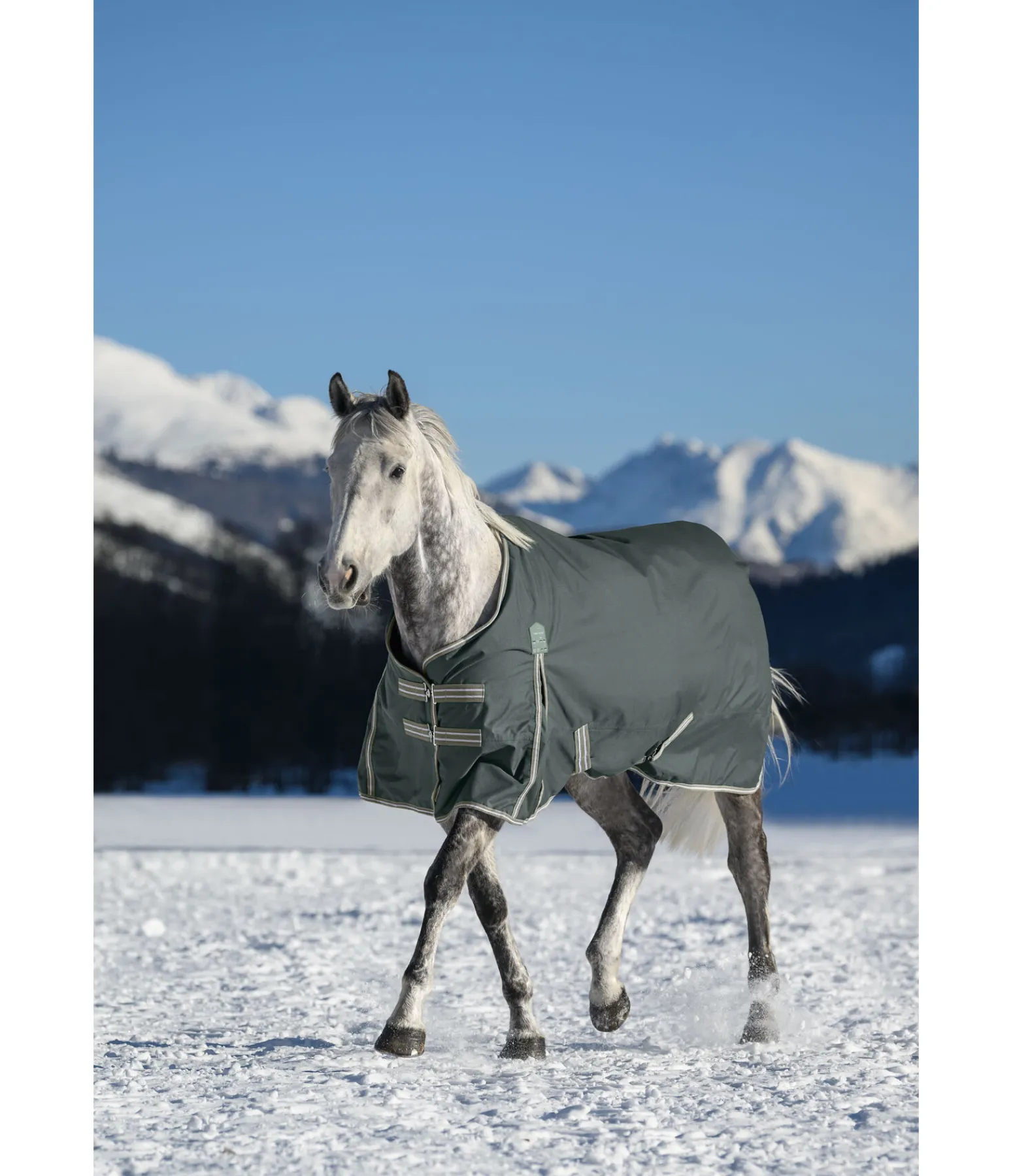 Couverture d’extérieur classique. Imperméable (3.000 mm). En matière Ripstop résistante (600 deniers) avec garnissage 50 g léger. Avec plis d’aisance pour une liberté de mouvement optimale, double fermeture de poitrail avec crochets en T et patte auto-agrippante supplémentaire, sursangles croisées réglables et rabat de queue. Anneaux permettant la fixation de courroies de cuisses (non incluses), courroie de queue réglable incluse. Pad de garrot permettant d’éviter les pressions et irritations dues aux frottements. Doublure lisse protégeant la robe. 100 % polyester.