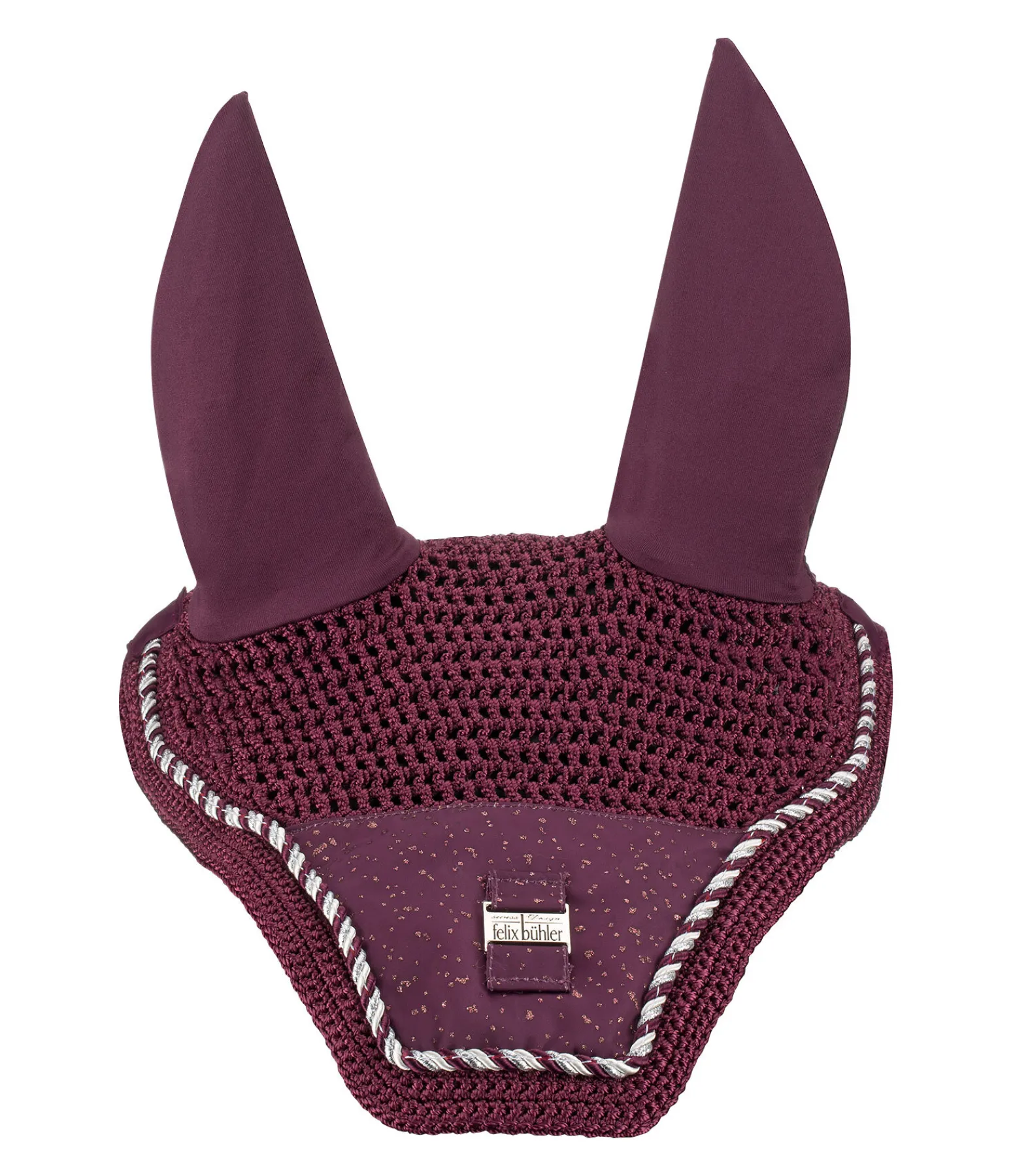 Bonnet anti-mouches en maille crochetée avec triple cordon décoratif et insert en tissu satiné orné de fragments scintillants et d’une petite plaque métallique avec logo gravé. Plaque argentée en S, dorée en CO et rose doré en NV. Matière extensible aux oreilles pour un confort optimal. Maille 100 % polyacrylique, matière extensible 97 % polyester, 3 % élasthanne.