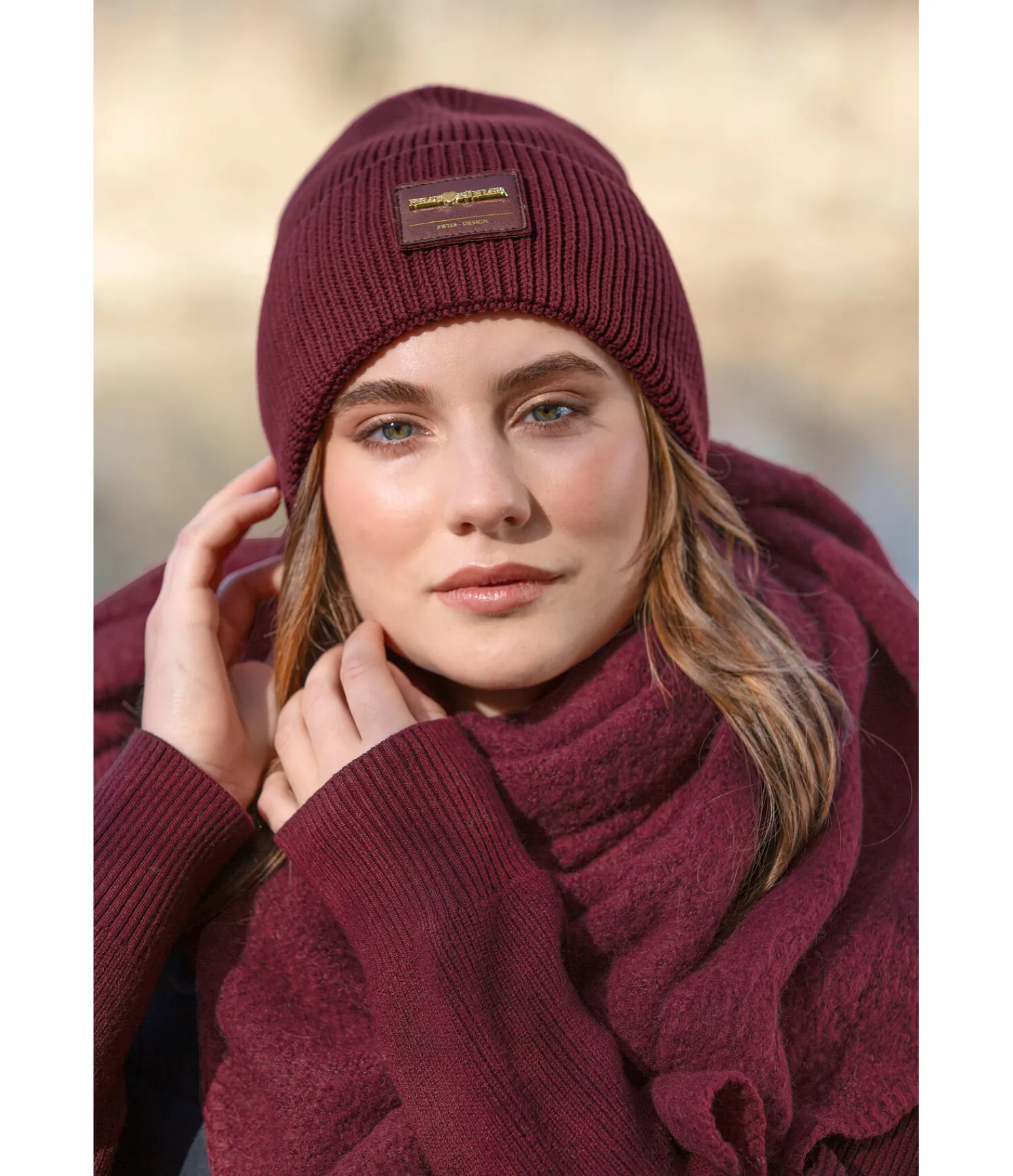Bonnet chaud en maille côtelée tendance. Badge en relief avec logo doré. 100 % coton.
