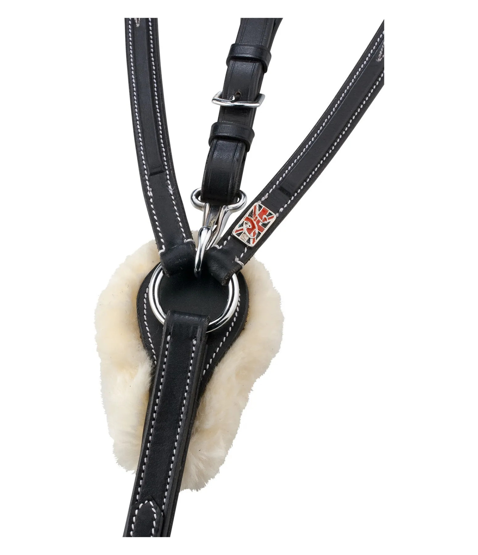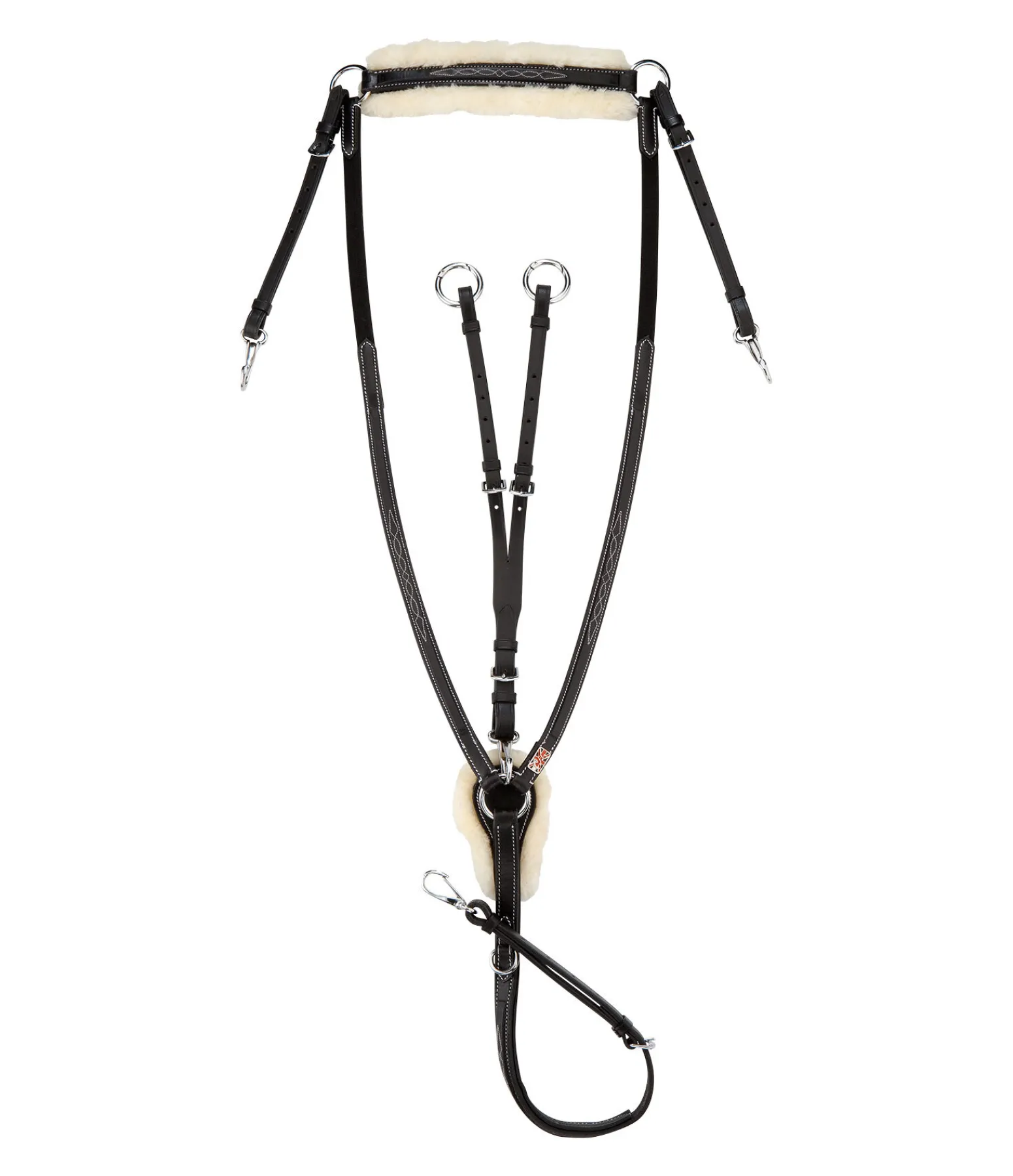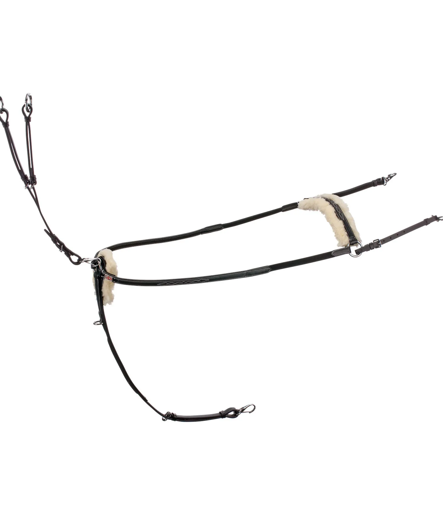 Collier de chasse élégant. Taille ajustable grâce aux élastiques. Cuir véritable haut de gamme avec surpiqûres de couleur contrastante. Rembourrages amovibles en polaire Teddy sur les points de pression au poitrail et au garrot. Fourche de martingale réglable et amovible. Anneaux de martingale ouvrables. Fixation rapide à la selle grâce à des mousquetons pratiques. Bouclerie argentée.