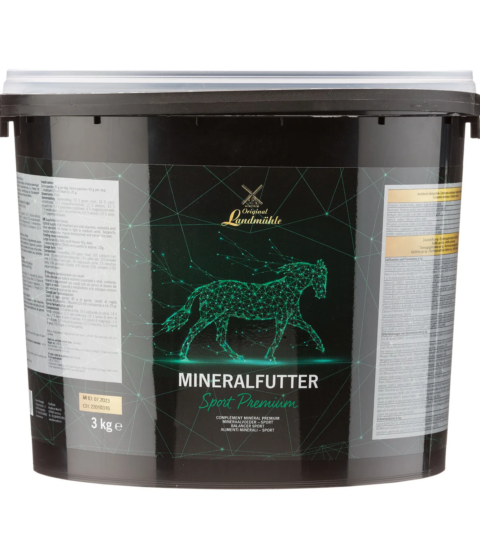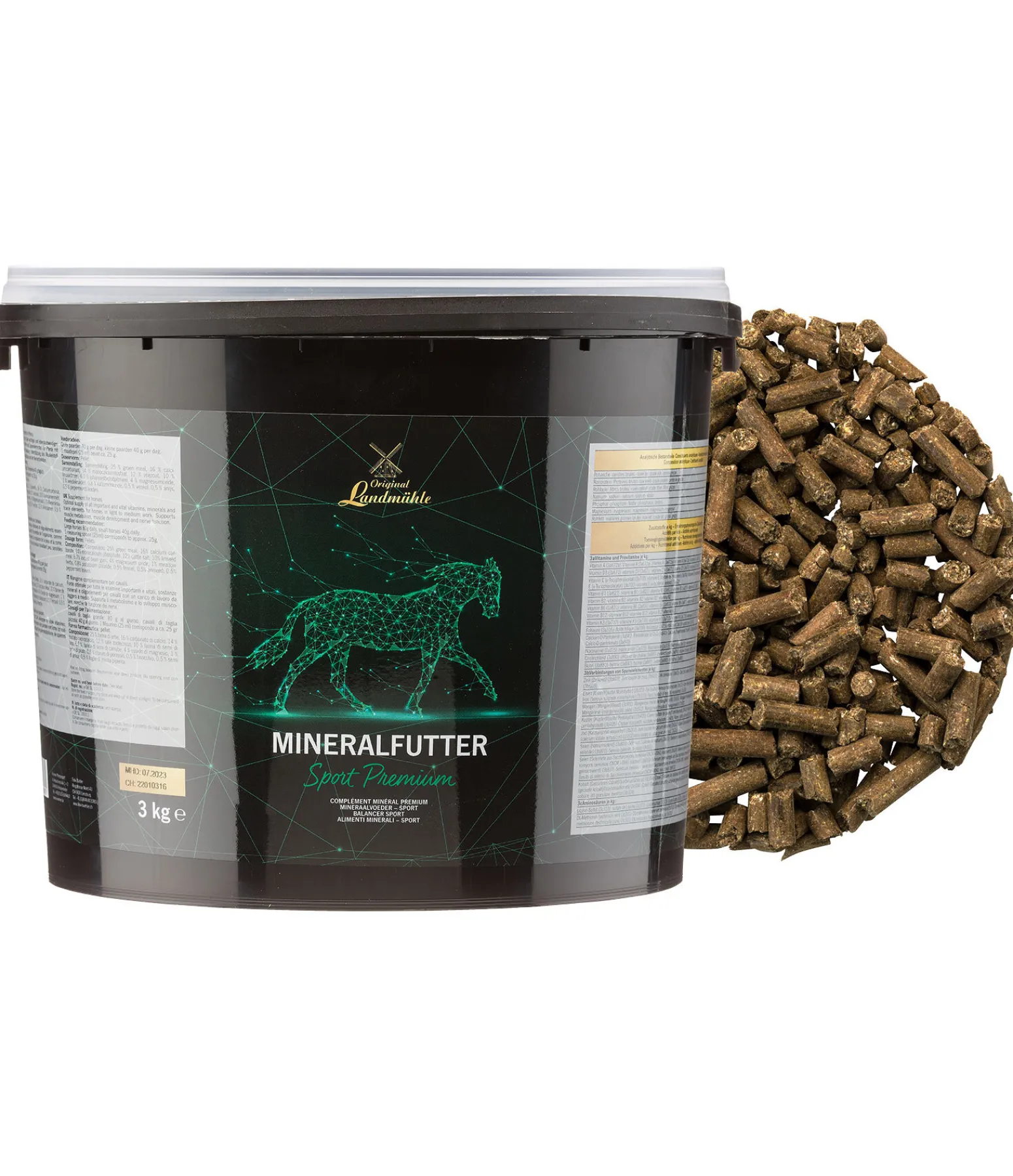 Apporte tous les minéraux, vitamines et oligo-éléments essentiels aux chevaux qui travaillent régulièrement. Les chevaux au travail ont besoin d’un apport complémentaire en minéraux car ils en perdent beaucoup en transpirant et sont plus sujets aux tensions musculaires. Le complément minéral premium Original Landmühle Sport contient tous les nutriments importants tels que la vitamine E, le sélénium, le magnésium et la biotine. L’association de vitamine E et de sélénium peut avoir un effet positif sur le métabolisme musculaire. Les acides aminés tels que la lysine et la méthionine permettent de soutenir la croissance musculaire. La biotine soutient la croissance de la corne et rend la robe brillante et les crins solides. Ce complément minéral contient des électrolytes permettant de rétablir l’équilibre hydrique du cheval après l’entraînement et est donc idéal pour les chevaux de sport en travail léger ou moyen. À base d’herbes de prairie hachées, sans céréales ni mélasse. En granulés bien acceptés par les chevaux.