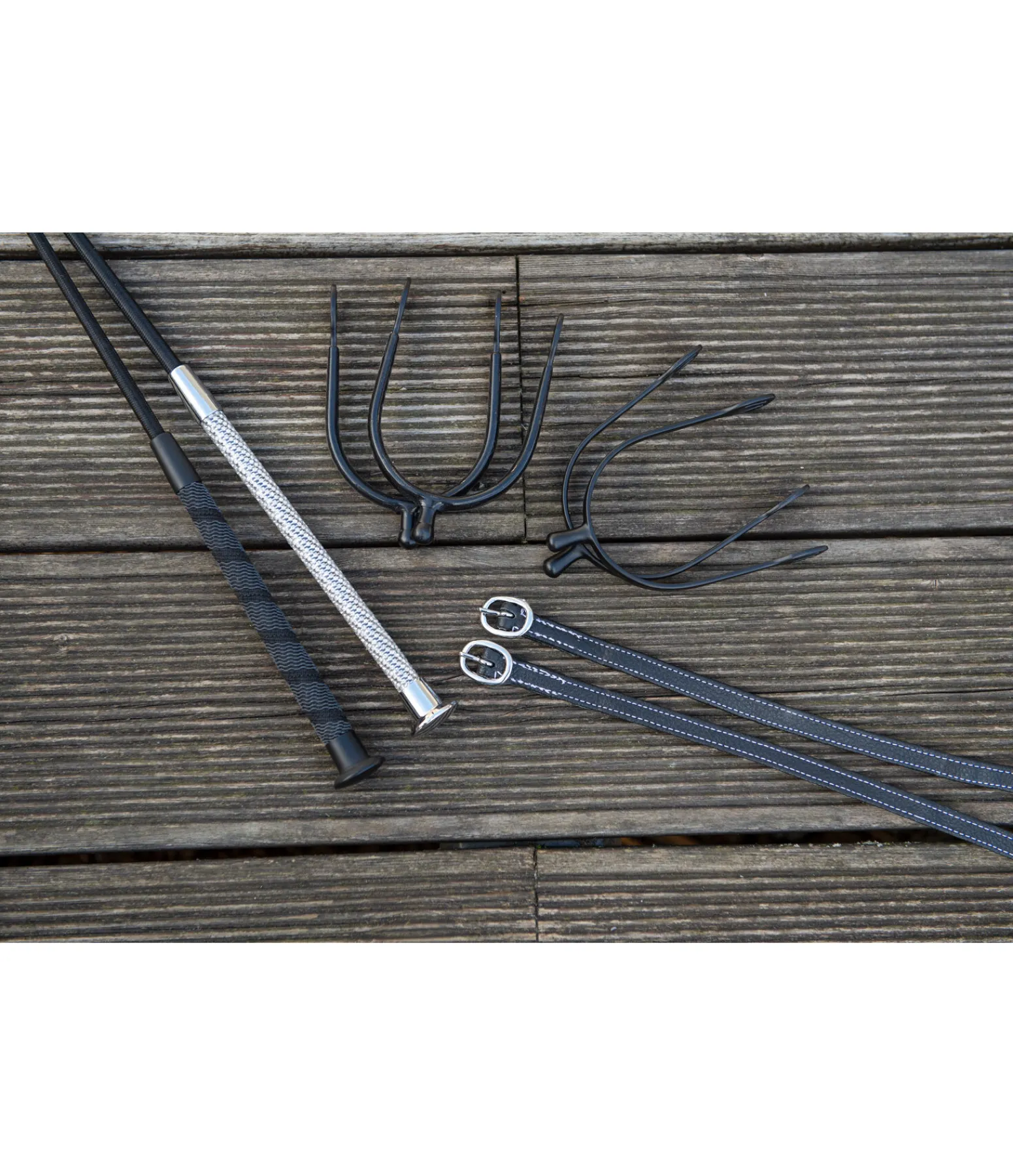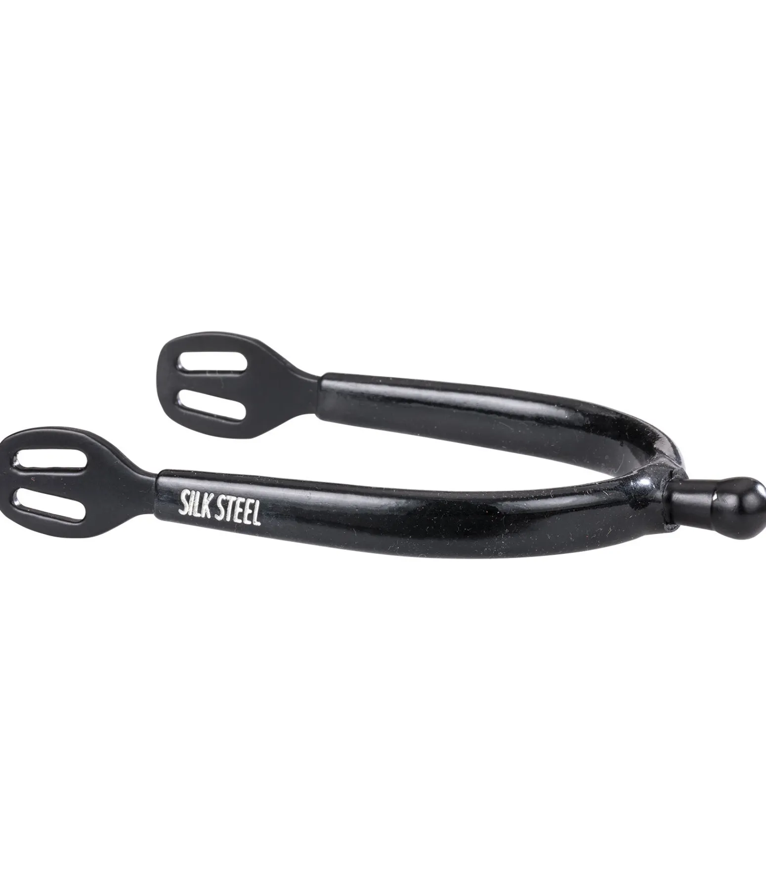Éperons à bout rond en acier inoxydable noir mat. Forme améliorée des oeillets pour faciliter le passage des lanières. Revêtement silicone avec imprimé SILK STEEL. Longueur de tige : 20 mm.