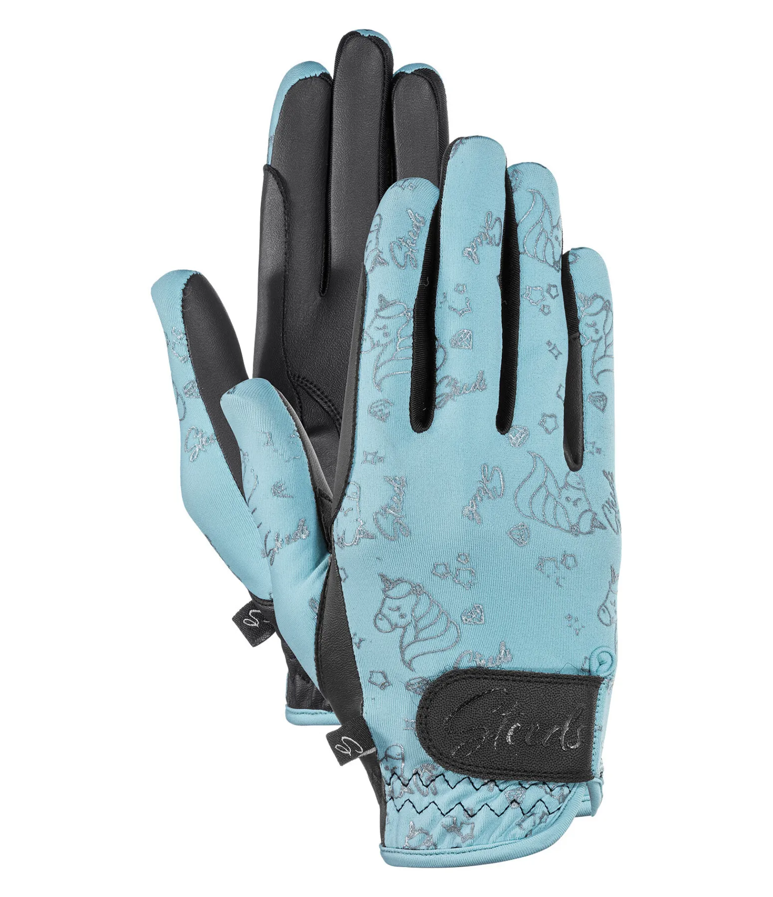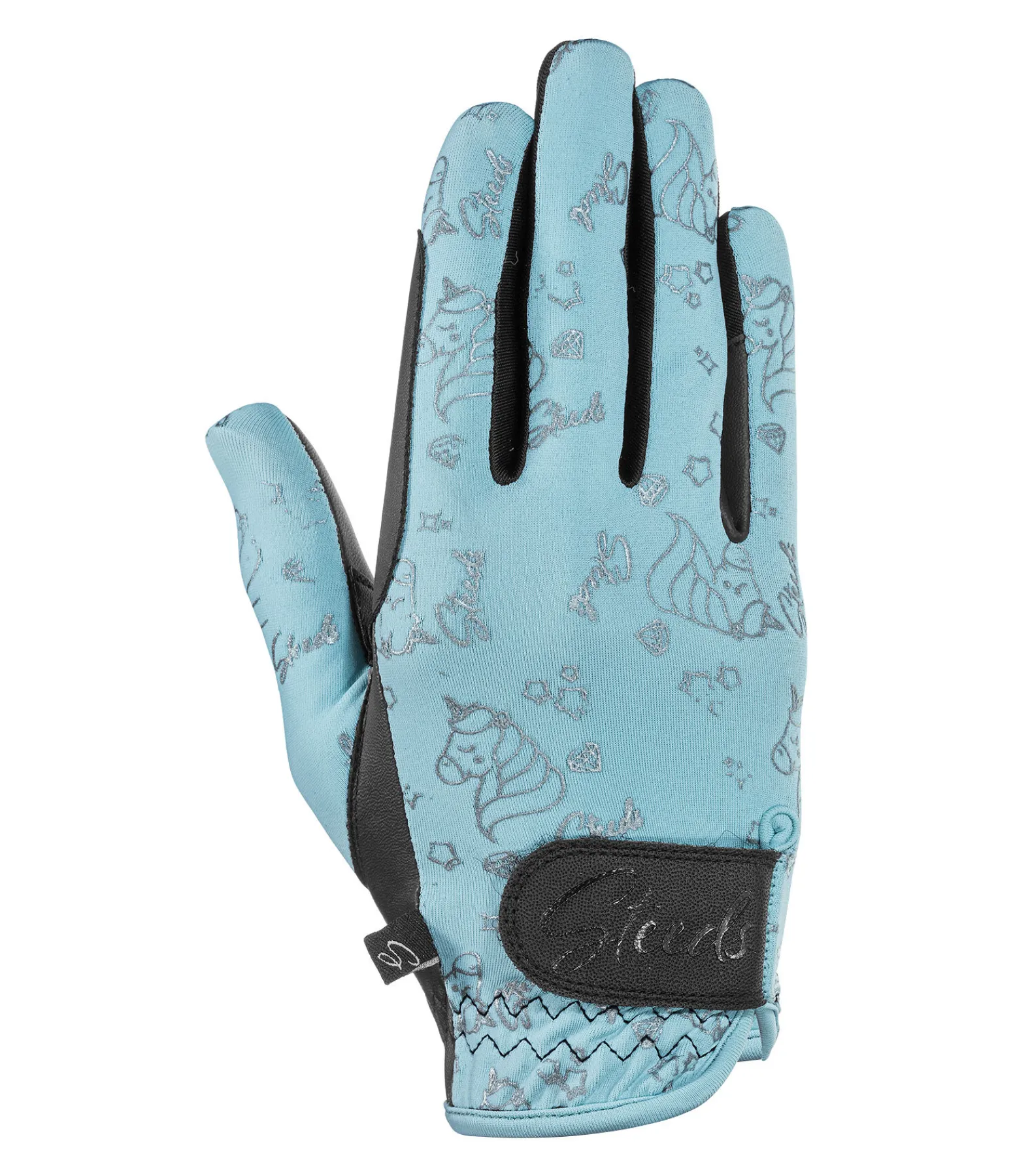 Gants d’équitation extensibles. Matière respirante. Motif licorne all-over sur le dessus de main. Paume antidérapante. Renfort de rêne sur l’index pour éviter les irritations dues aux frottements. Fermeture par patte auto-agrippante pour un ajustement optimal, avec logo STEEDS. Dessus de main 90 % nylon, 10 % élasthanne. Paume 80 % polyuréthane, 20 % polyester.