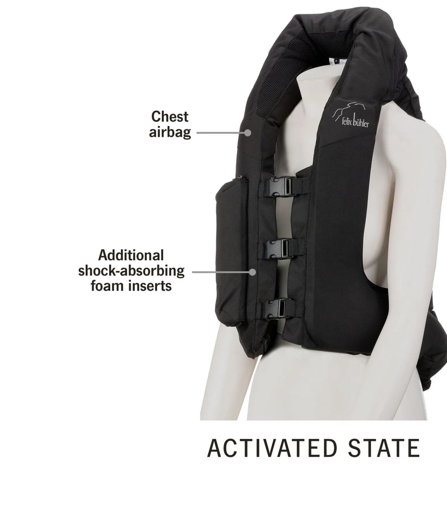 Le gilet est certifié selon la norme pour gilet airbag NF S72-800:2022. À l’avant, des mousses amortissantes sont ajoutées afin de renforcer la protection. Le gilet airbag Felix Bühler se distingue d’autres gilets similaires par son grand airbag au col qui peut réduire ou éviter les blessures au niveau du cou ou de la nuque ainsi que l’hyperextension du cou (coup du lapin). ATTENTION : aucun gilet de protection ou gilet airbag ne peut éviter totalement les blessures. Le gilet airbag ne doit être utilisé que dans le cadre de l’équitation. Pour une protection maximale, il est recommandé de porter une protection dorsale ou un gilet de protection sous le gilet airbag.