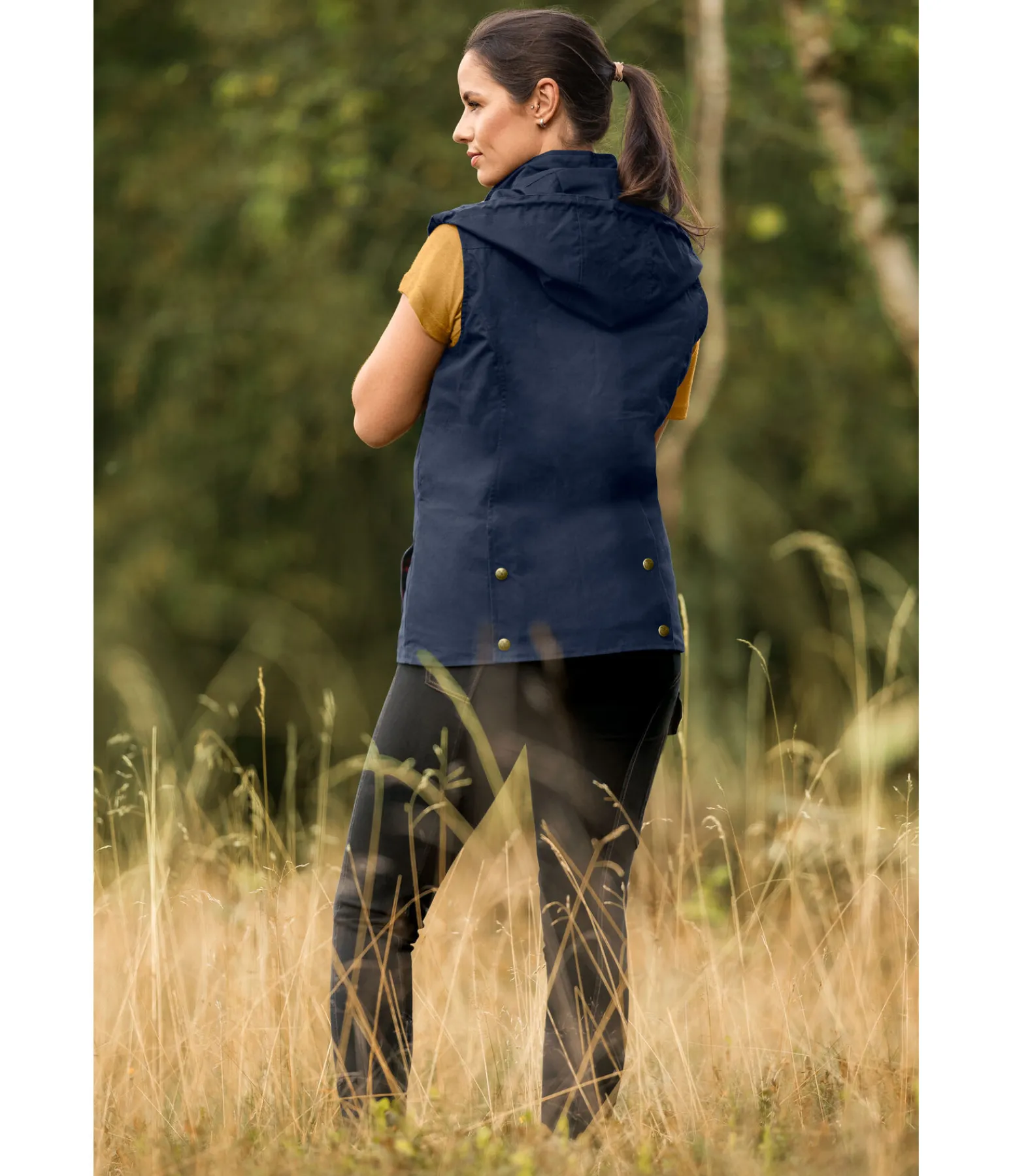 Gilet sans manches de qualité supérieure. Respirant et légèrement rembourré. Capuche amovible. En coton huilé aux propriétés très déperlantes et respirantes. Idéal pour la mi-saison ! Avec doublure douce à carreaux. Le gilet dispose d’une fermeture à glissière double sens pratique ainsi que de deux fentes cavalières avec boutons-pression pour une liberté de mouvement optimale à l’écurie ou en selle. Avec ses deux poches avec boutons-pression et ouverture latérale ainsi qu’une poche intérieure, il offre assez de rangements pour son portable et autres. Capuche amovible grâce à une patte de boutonnage derrière le col en velours côtelé. Capuche réglable par cordon de serrage. Matière extérieure 100 % coton huilé, doublure 100 % coton, garnissage 100 % polyester.