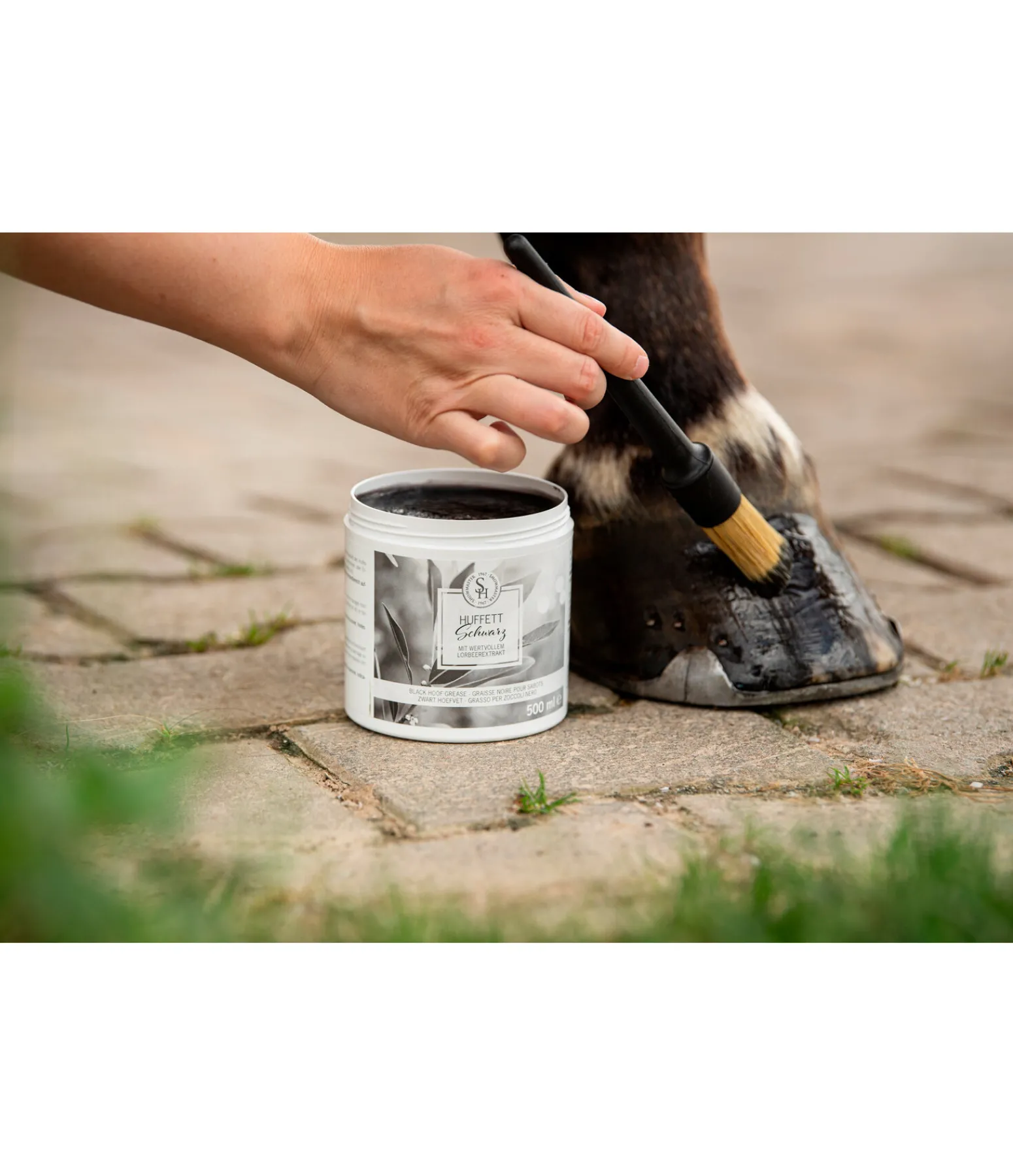 Utilisation : Sur un pied propre, appliquer avec un pinceau sur la paroi extérieure du sabot et sur le bord de la couronne. L’application quotidienne apporte protection et soin au sabot.