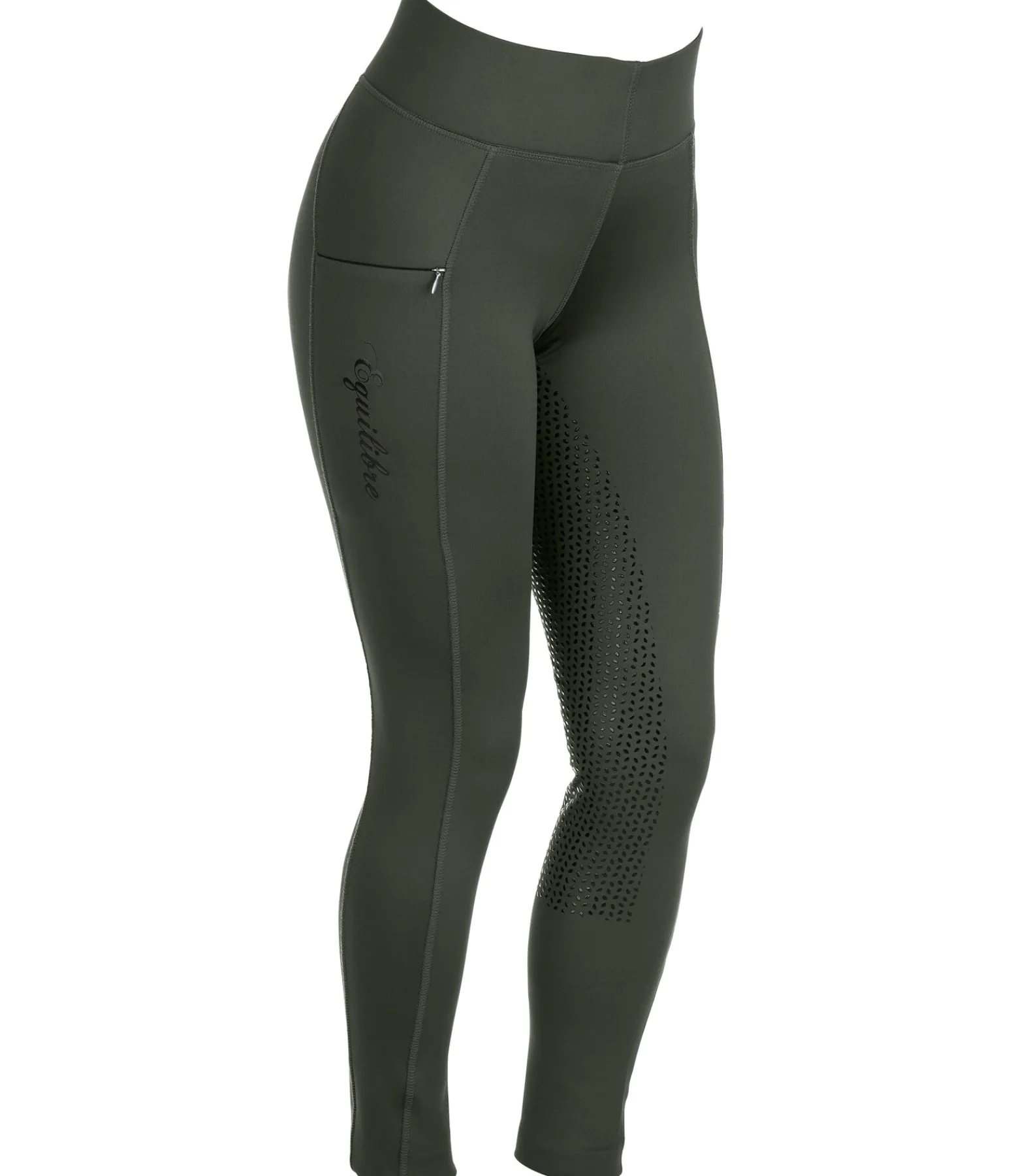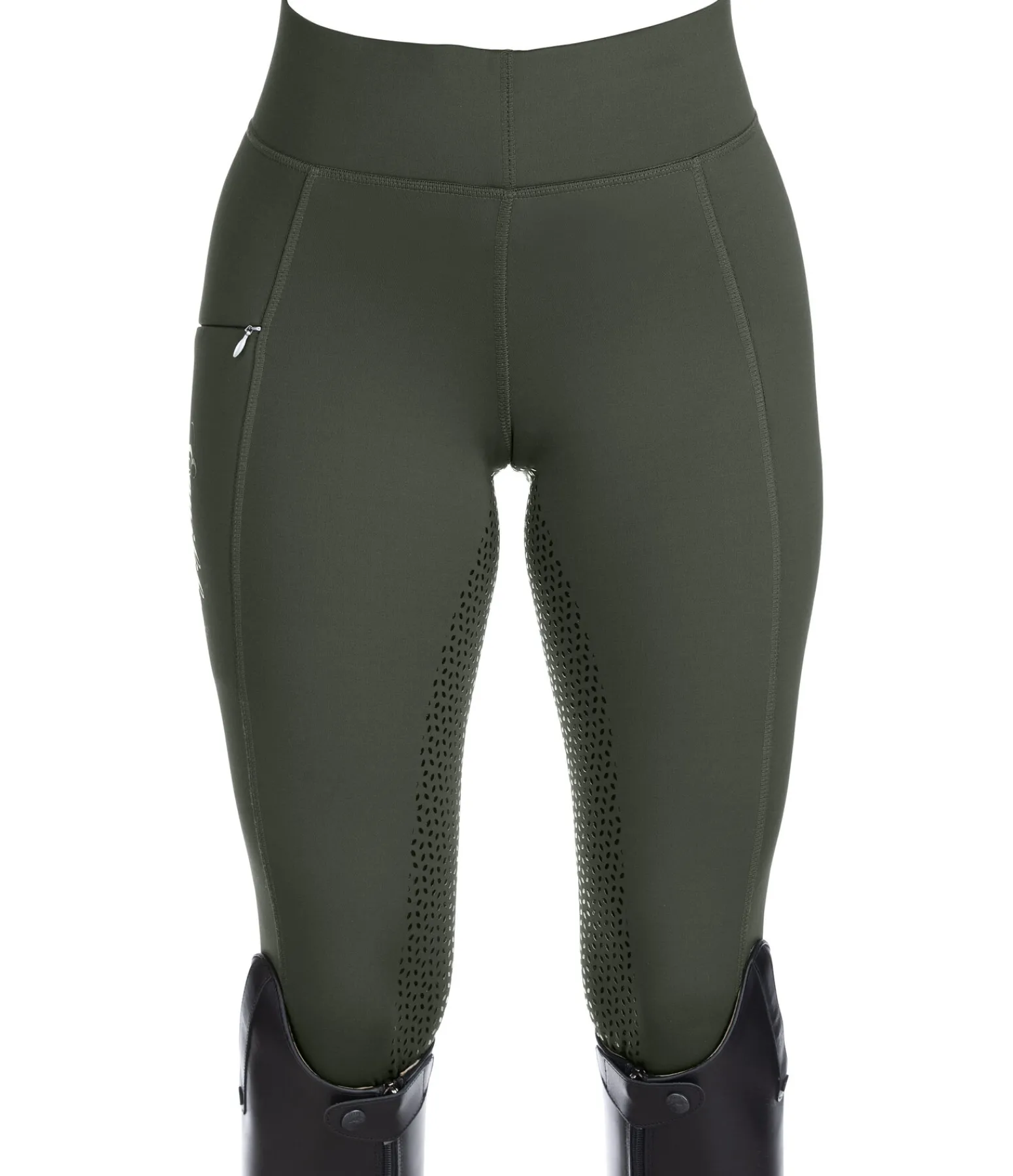 Legging d’équitation extensible avec fond intégral grip en silicone. Extérieur lisse et intérieur molletonné. Ceinture extra large élastiquée. Poche zippée pour téléphone portable sur la cuisse. Bas de jambe extensible sans patte auto-agrippante. 86 % polyester, 14 % élasthanne.