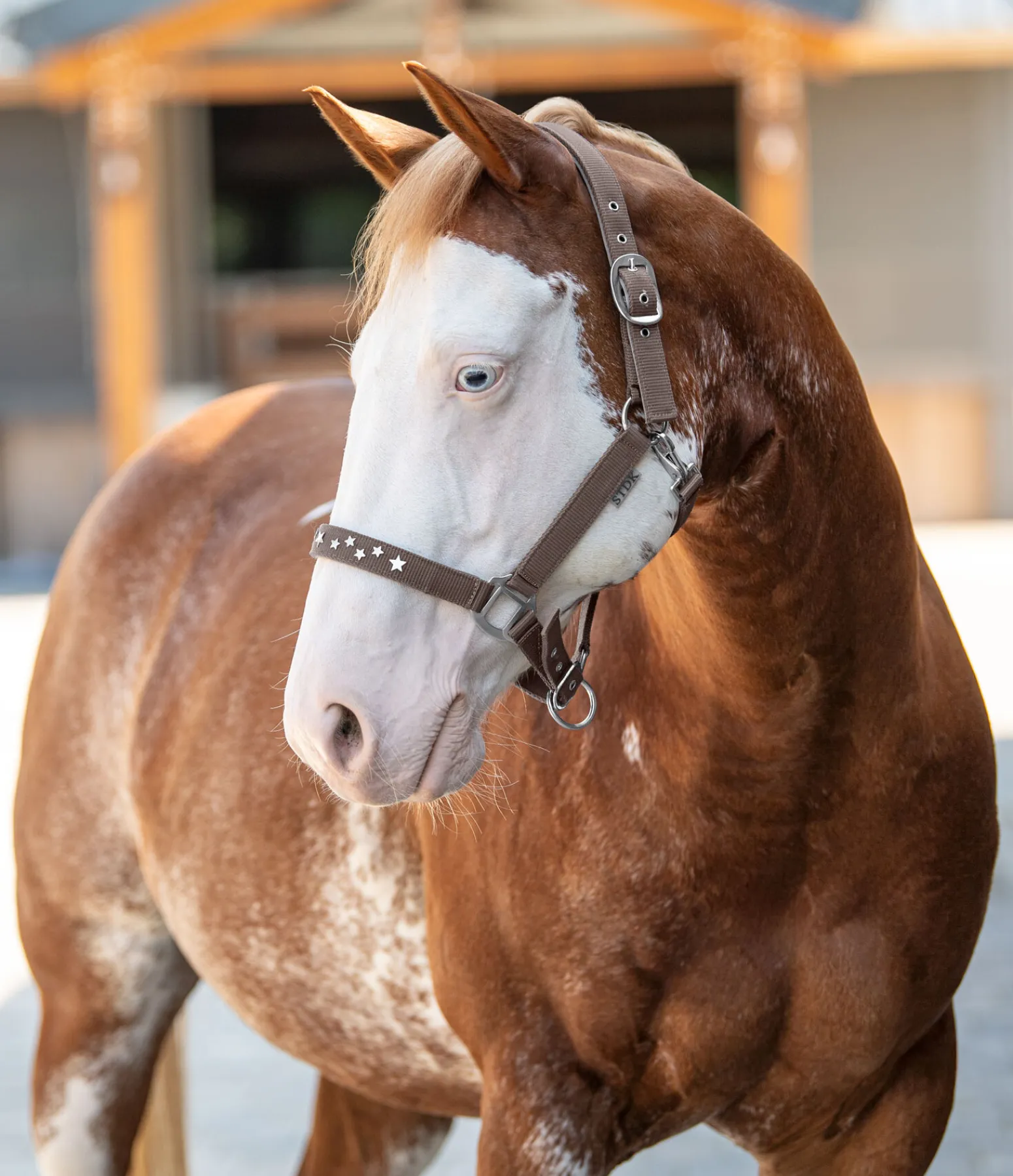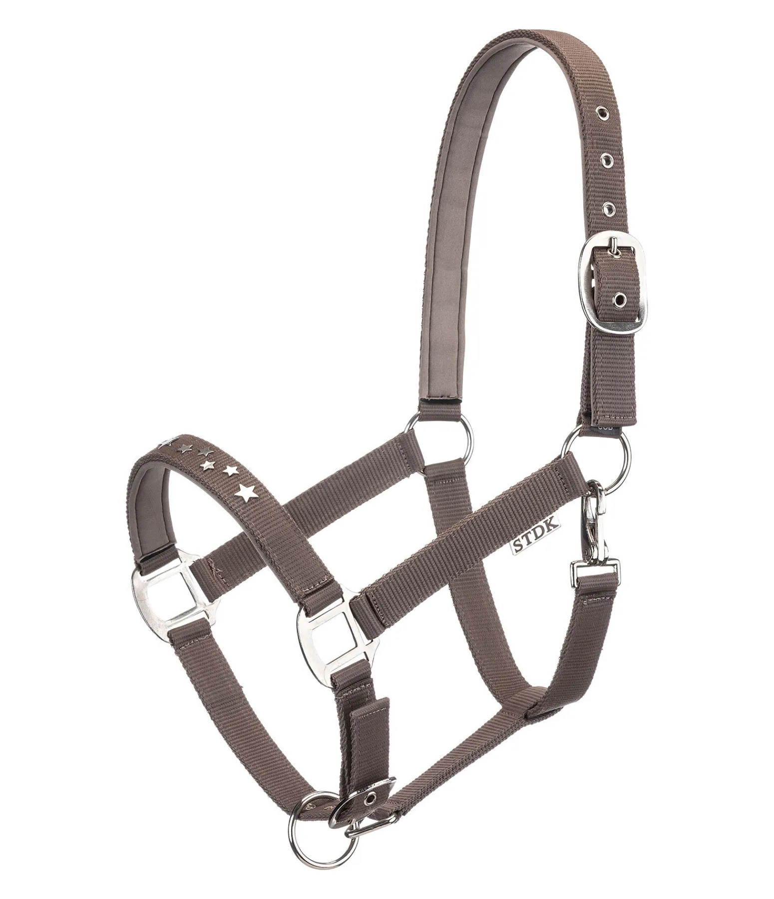 Licol orné de petites étoiles en métal sur la muserolle. Doublure douce en caoutchouc chloroprène sur la têtière et la muserolle. Têtière et muserolle réglables.