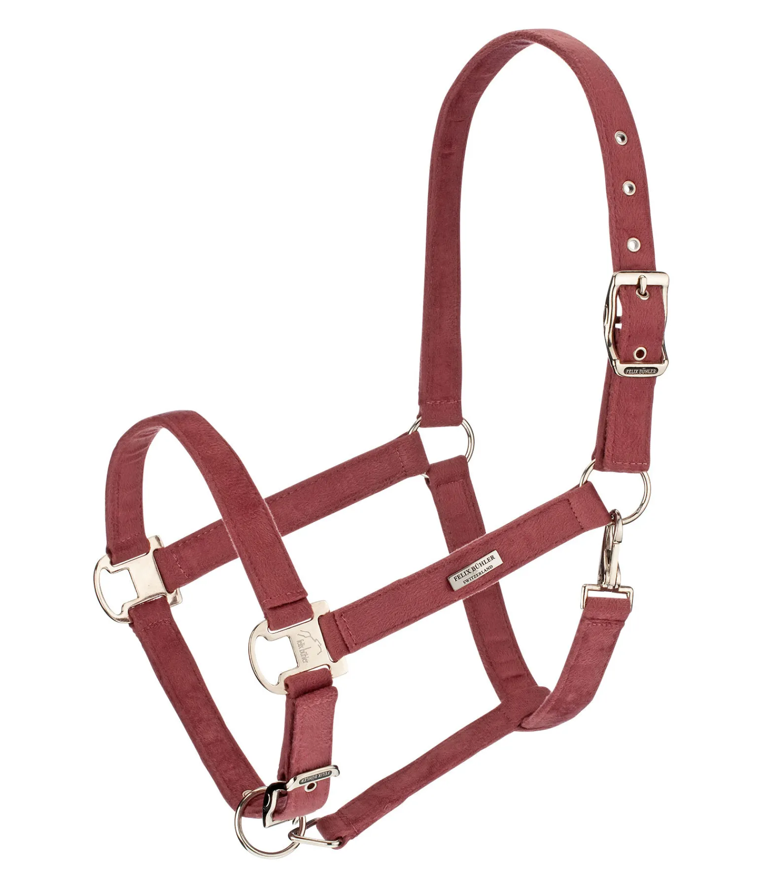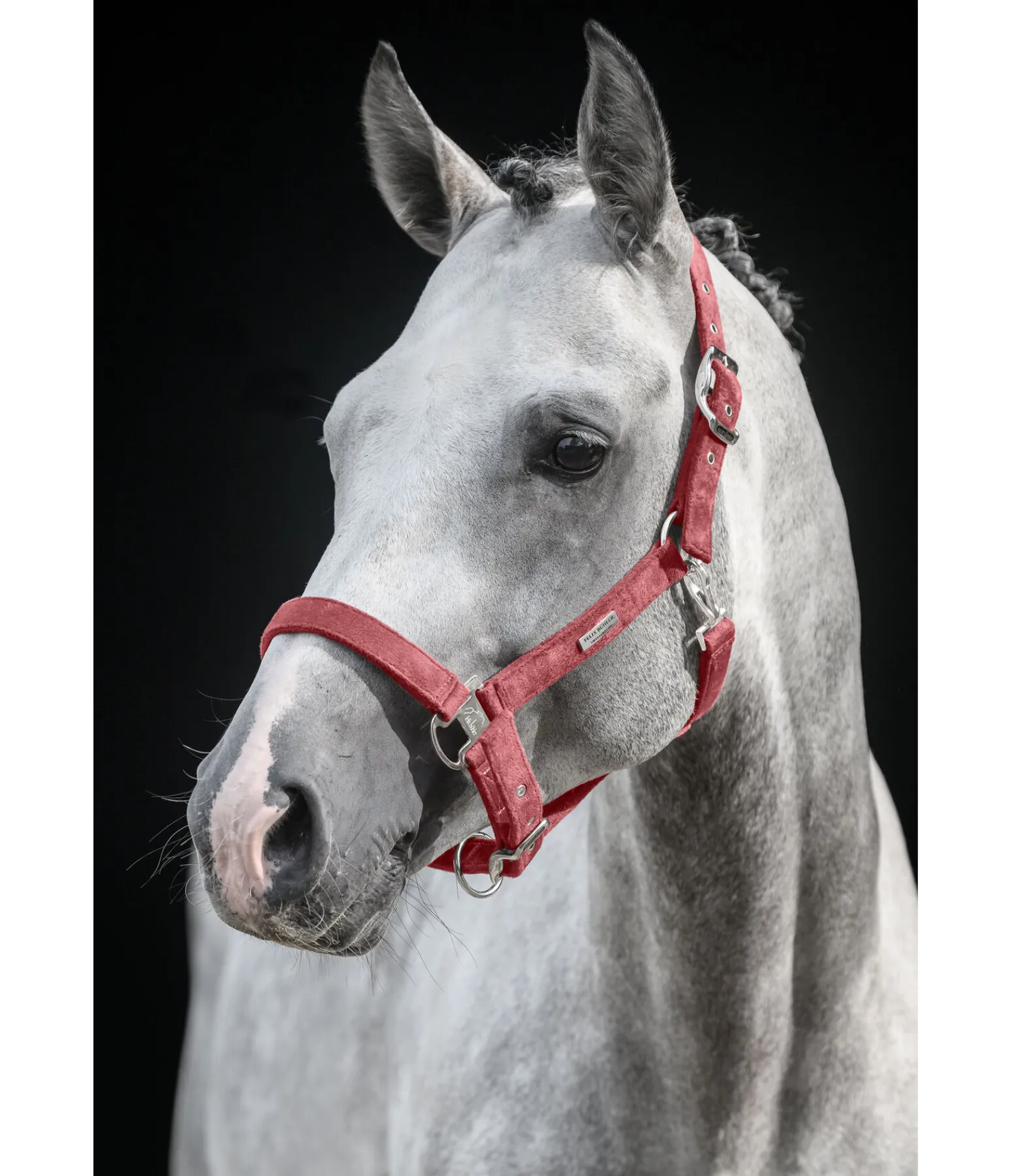 Élégant licol entièrement doublé en matière satinée. Avec plaque logo métallique brillante. Têtière et muserolle réglables. 100 % polypropylène.