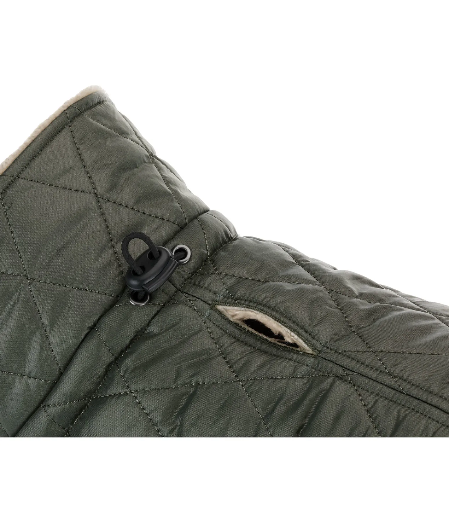Manteau matelassé tendance avec doublure en polaire Teddy douce et chaude avec un col et garnissage léger 160 g. Tour de cou réglable. Fermeture par patte auto-agrippante au poitrail et sous le ventre pour une mise en place facile. Avec ouverture dorsale pour passer la laisse. Jolis éléments en synthétique et coussinet en métal sur un badge en feutre. Extérieur 100 % nylon (210 deniers), doublure 100 % polyester.