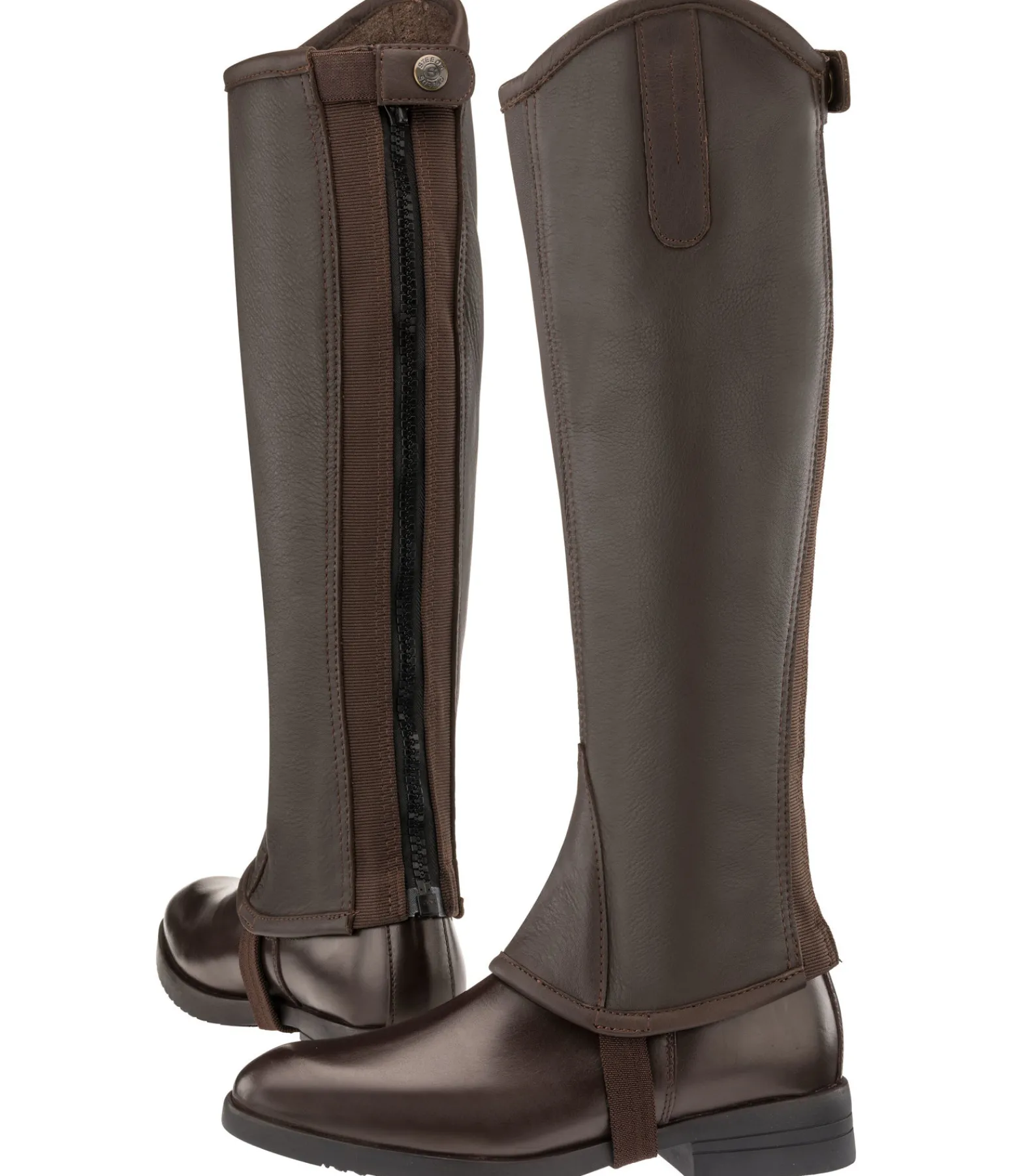 Mini-chaps souples dans un design évoquant des bottes cavalières. Dessus en cuir de vachette naturellement grainé, doux et résistant. Empiècements élastiqués le long de la fermeture à glissière pour un ajustement optimal.