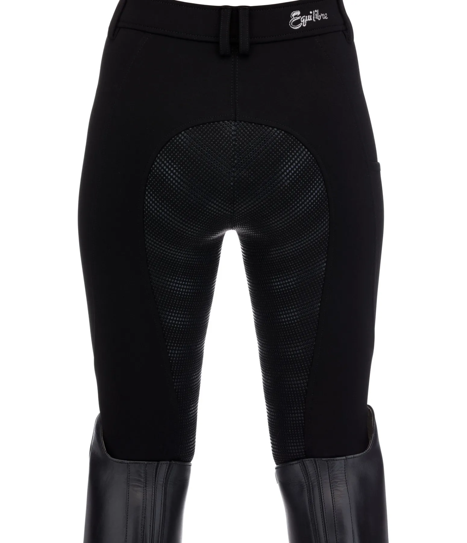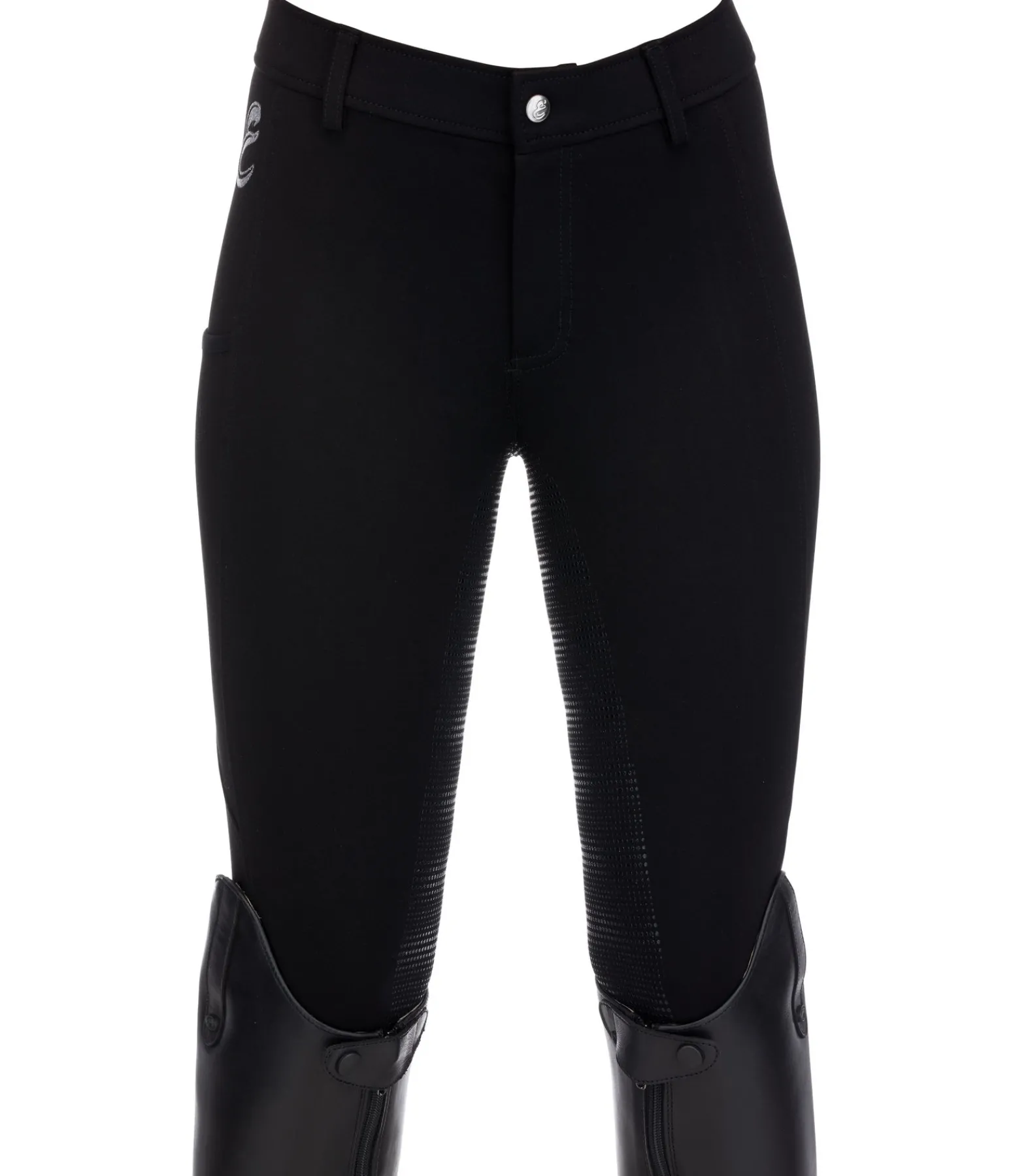 Pantalon d’équitation. Fond intégral grip en silicone. Matière stretch respirante,extensible dans 4 directions et ultra confortable. Poche latérale pour téléphone portable. Bas de jambe extensible sans patte auto-agrippante. 68 % viscose, 27 % polyamide, 5 % élasthanne.