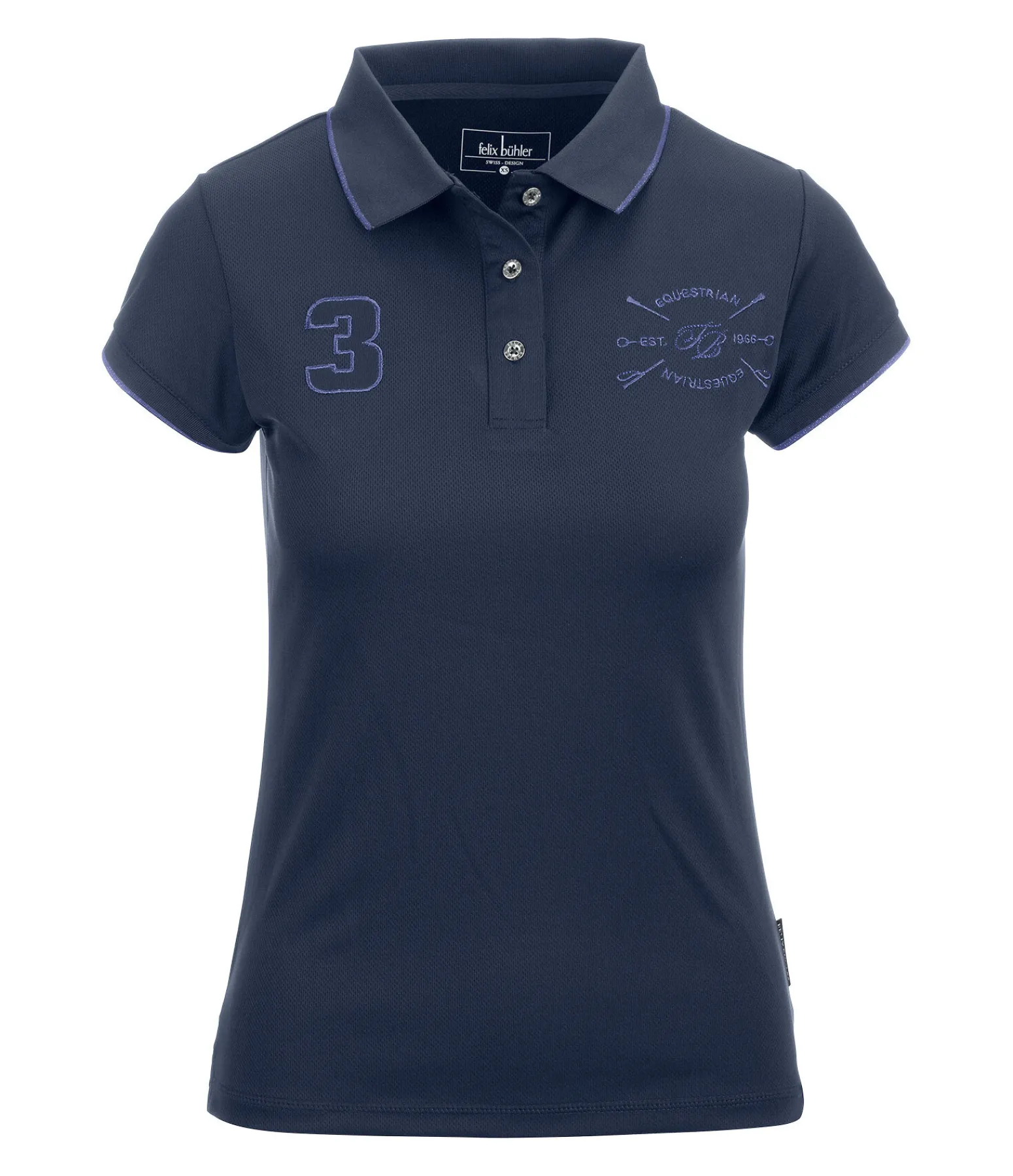 Polo femme classique en tissu technique. Respirant et à séchage rapide. Avec patte de boutonnage et jolies broderies en fil scintillant. Finition bord-côte au col et en bas des manches avec bord scintillant. 100 % polyester.