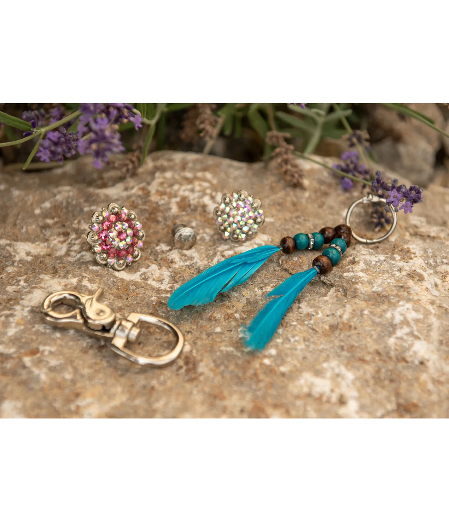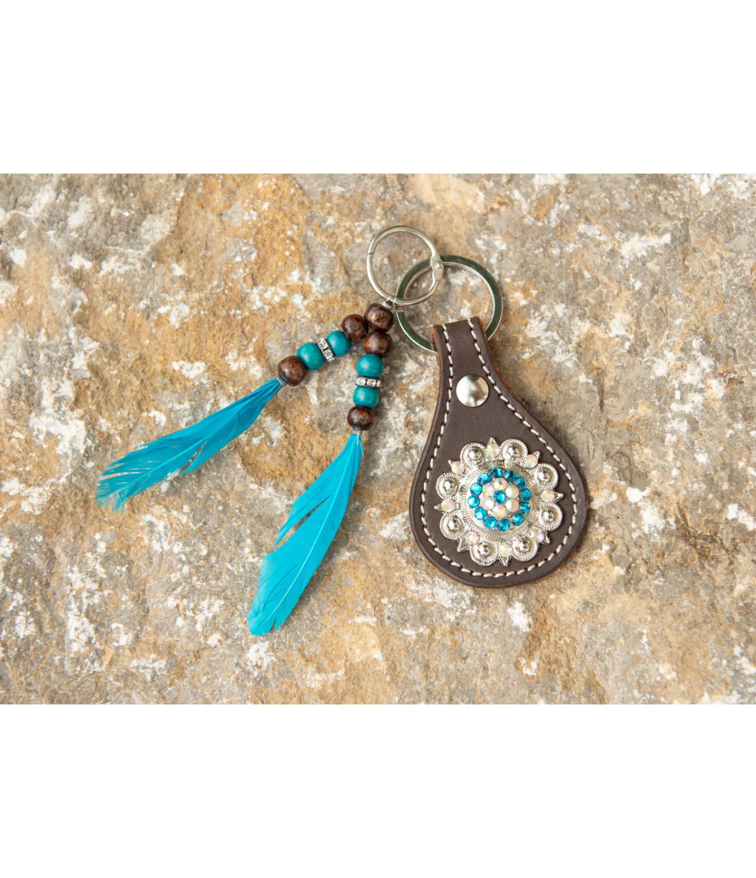 Superbe porte-clés avec perles et plumes pour décorer bridons, licols, colliers de chasse, etc. Anneau pour un accrochage facile et rapide.