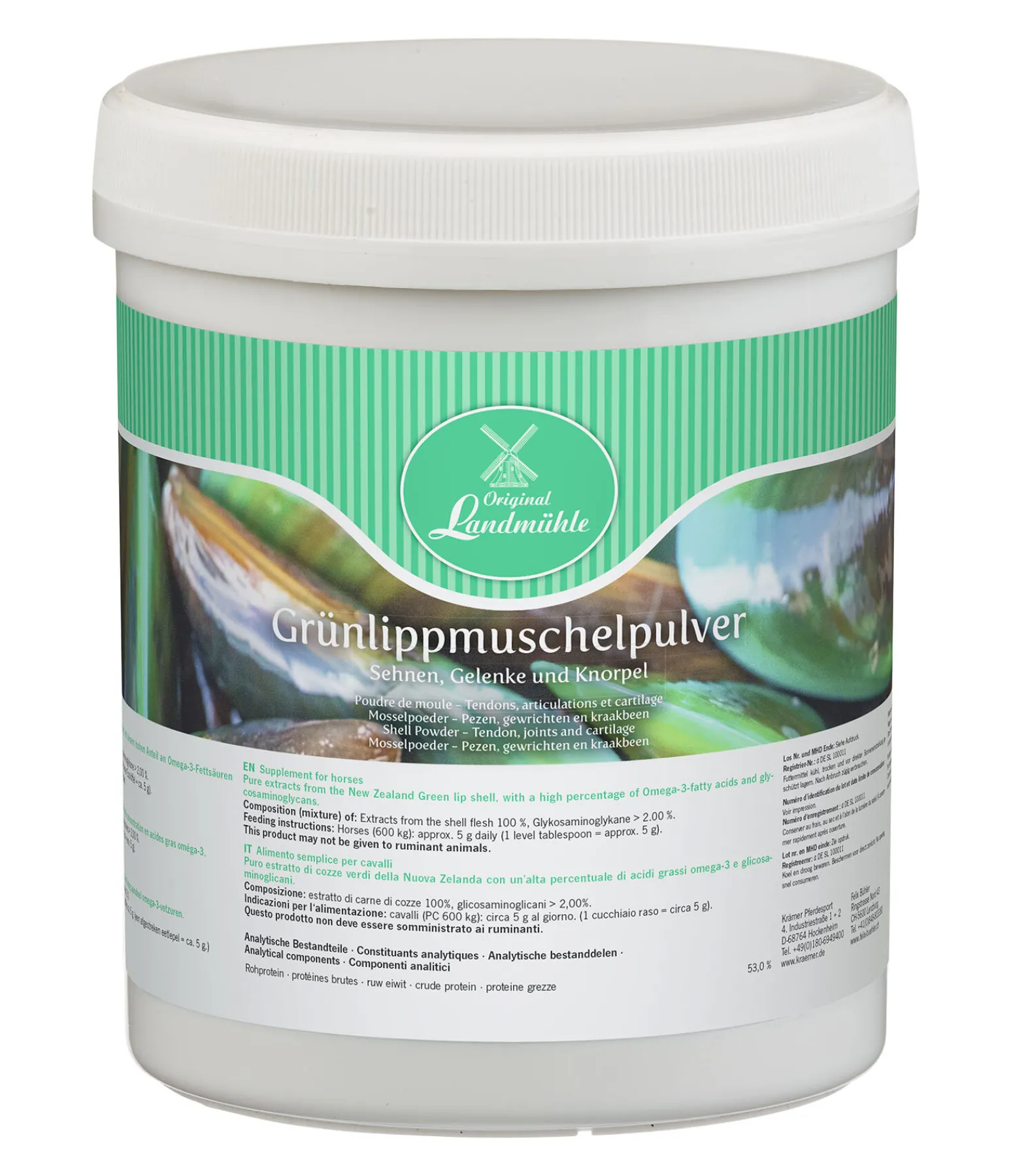 Ne pas donner à des ruminants !Composition : Extrait de chair de moule 100 %, glycosaminoglycanes > 2,00 %.