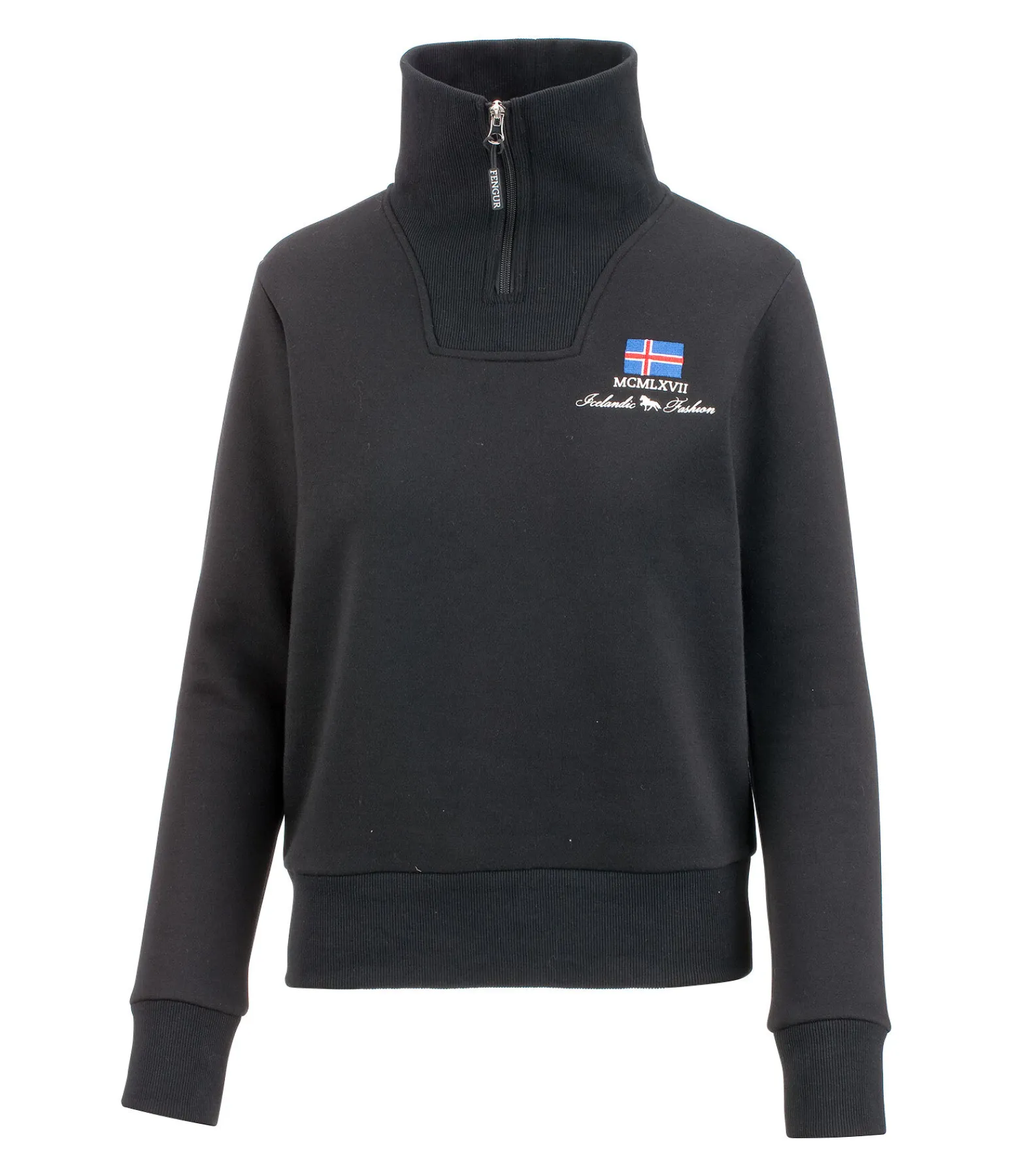 Pull coll camionneur zippé en coton stretch de grande qualité. Doux et sportswear. Finition en bord-côte en bas des manches et à la taille. Logo imprimé dans le dos. 65 % polyester, 35 % coton.