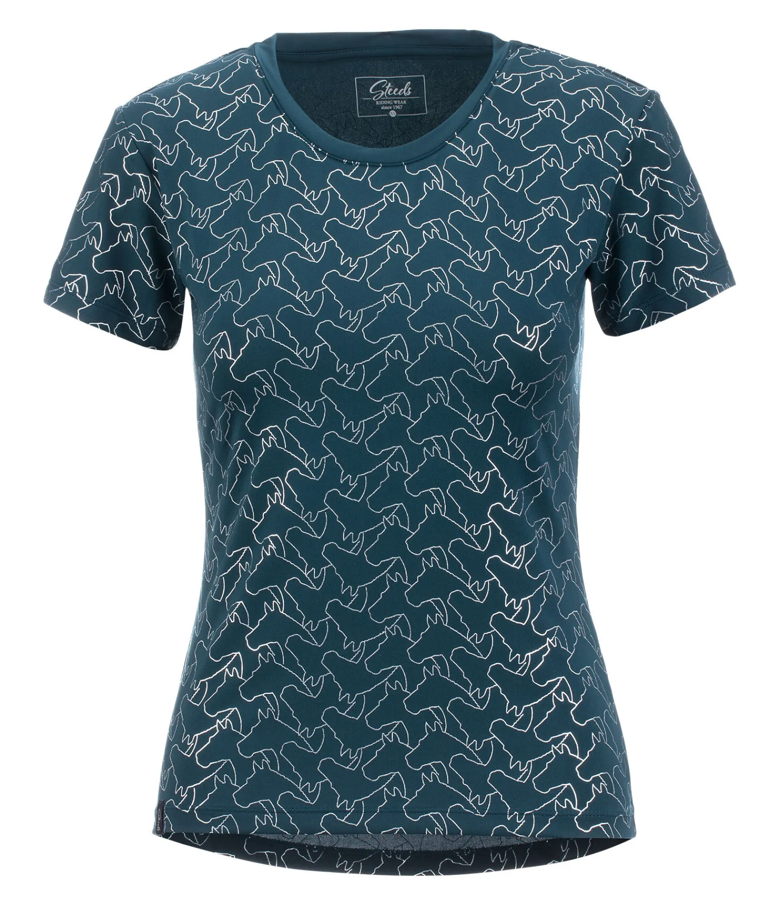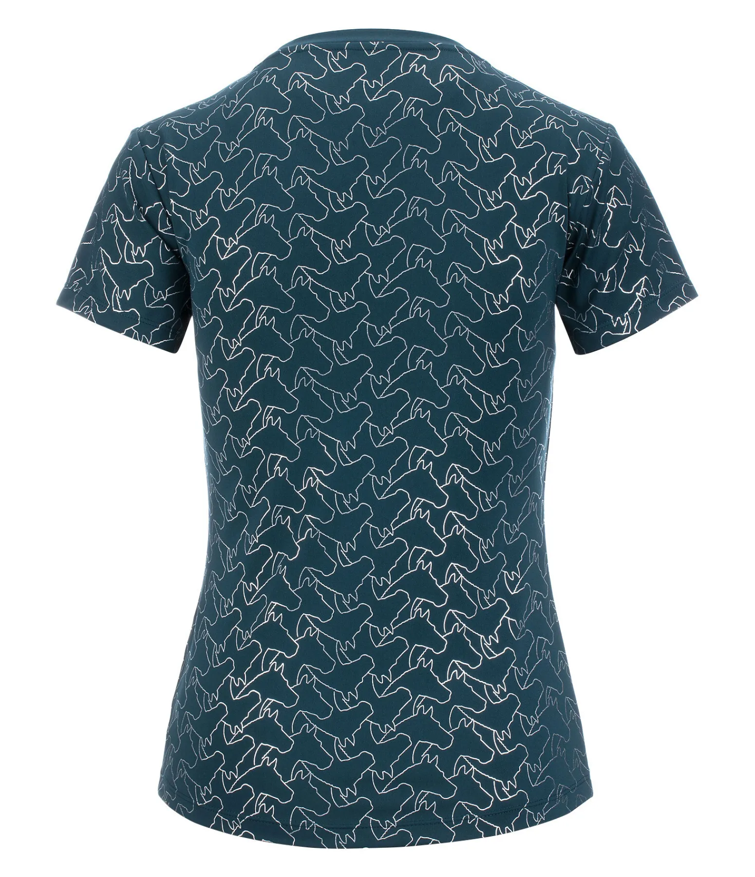 T-shirt chic à col rond avec imprimé all-over métallisé motif tête de cheval. Tissu technique respirant et à séchage rapide. 88 % polyester, 12 % élasthanne.