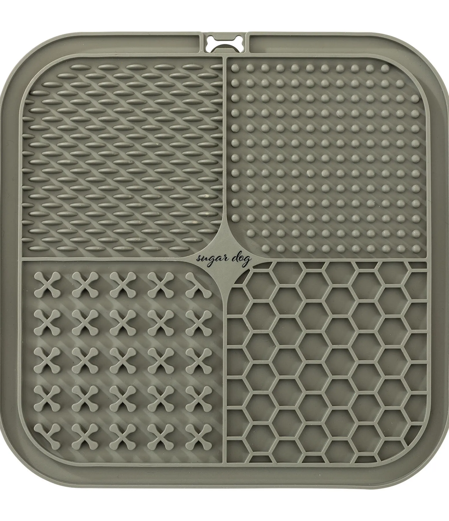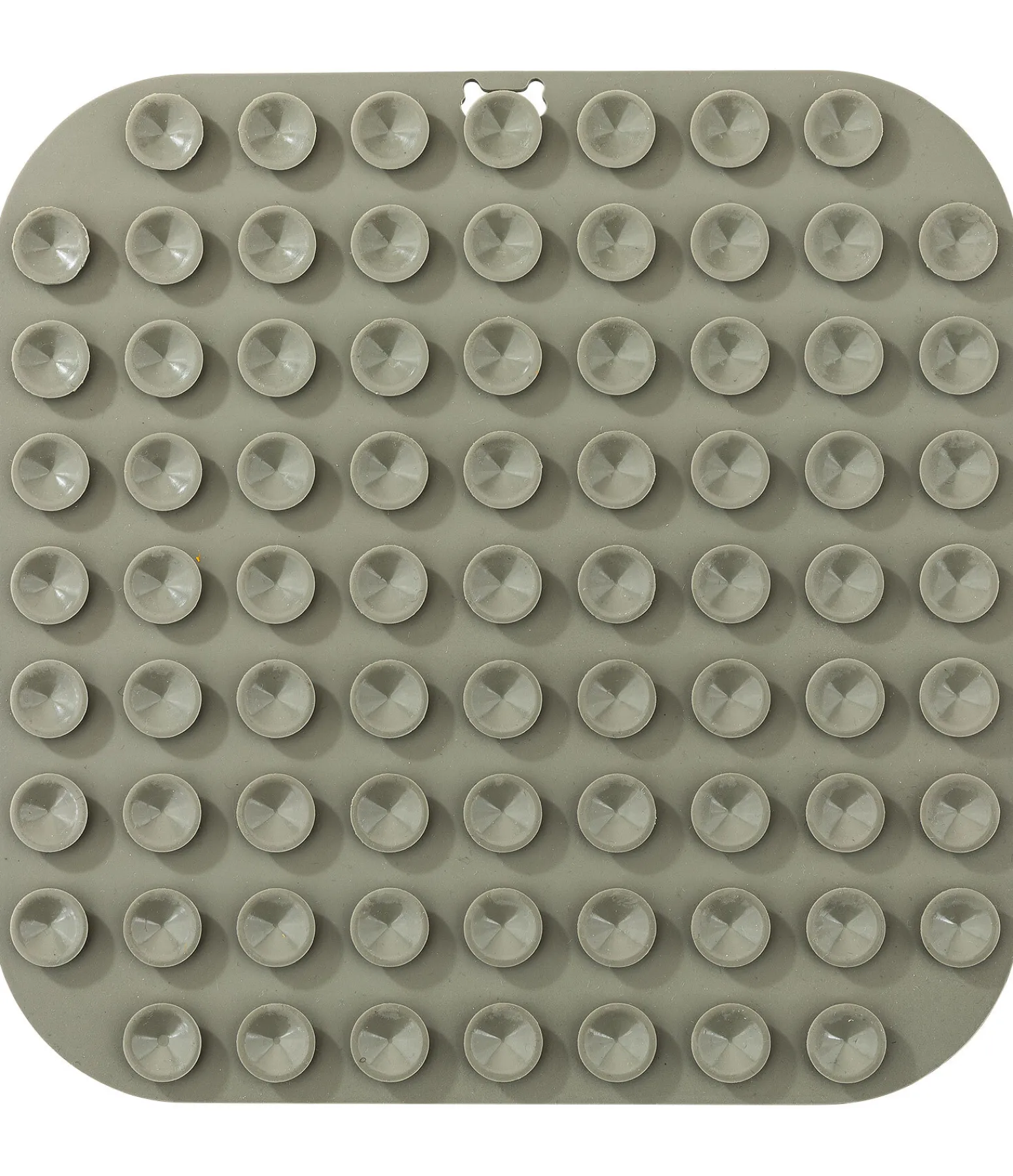 Tapis de léchage carré en silicone pour occuper et stimuler le chien. Quatre cavités avec différents degrés de difficulté. Le tapis de léchage peut être enduit de pâté, crème, yaourt, fromage frais ou autre. Plus la consistance est ferme, plus la difficulté est accrue. Ventouses sur la face inférieure pour empêcher le tapis de glisser lorsque le chien lèche. Peut être passé au lave-vaisselle. 20 x 20 cm.