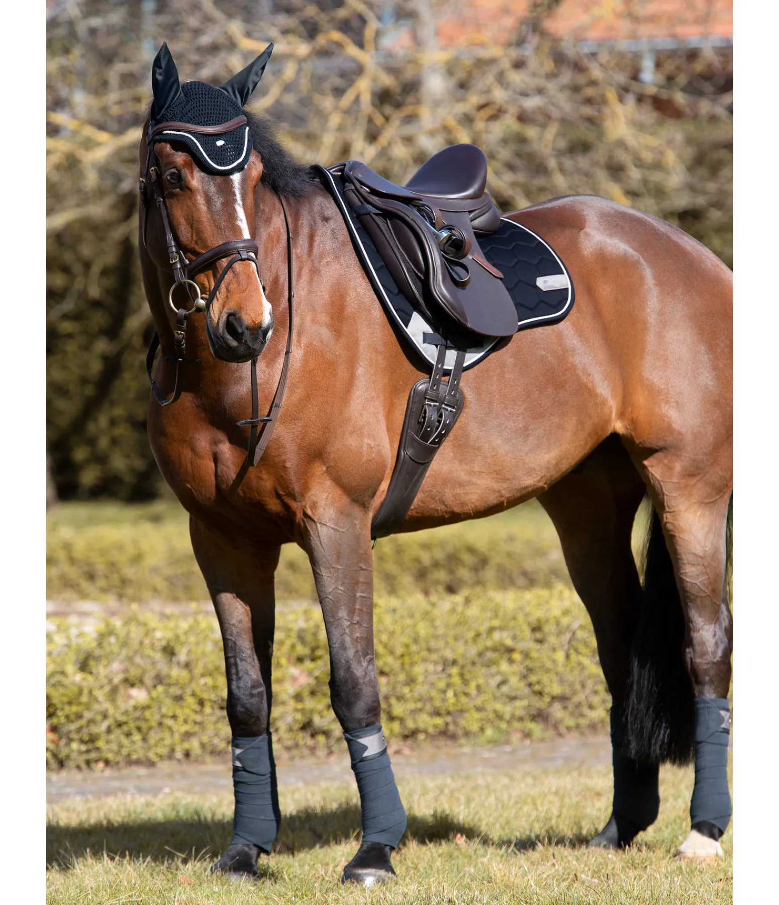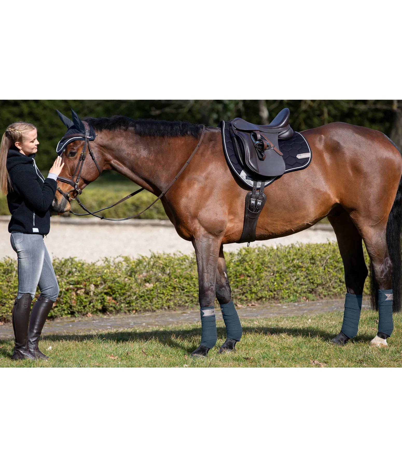 Tapis de selle dans une coupe sportswear avec protection contre les frottements de couleur contrastante à l’aspect velours au passage de sangle. Petite plaque argentée filigrane avec logo gravé de chaque côté et cordon décoratif discret satiné de couleur contrastante. Passants de sangle et de contre-sanglons avec patte auto-agrippante pratique. Dessous en Air mesh respirant et absorbant l’humidité. Dessus 100 % coton, rembourrage et dessous 100 % polyester.