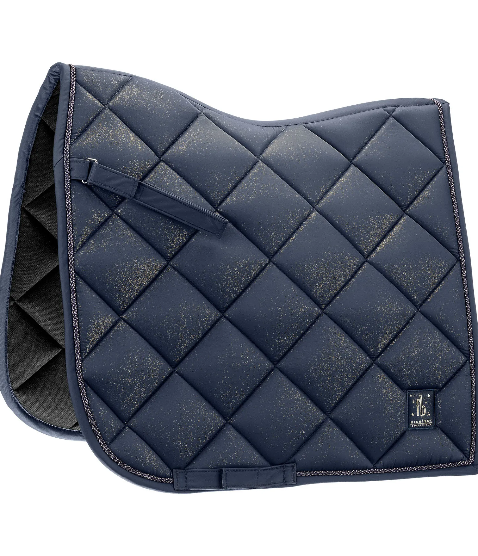 Élégant tapis de selle de forme carrée avec un soupçon de paillettes sur toute la matière supérieure et cordon décoratif scintillant. Logo de couleur assortie. Passants de contre-sanglons amovibles et passants de sangle avec pattes auto-agrippantes pratiques. Dessous en Air mesh respirant et absorbant l’humidité.