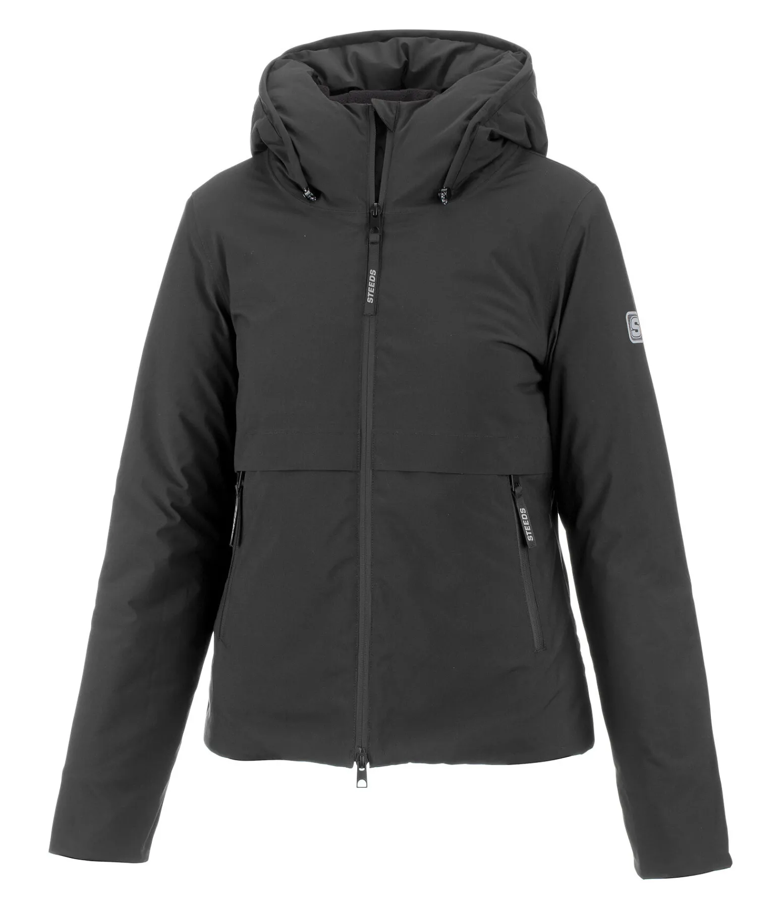 Veste d’équitation à capuche très technique dans une coupe sportive avec doublure chaude en polaire douce. Très imperméable (10.000 mm), coupe-vent et respirante (5.000 MVP). Fermeture à glissière double sens étanche, 2 poches zippées étanches devant, logo STEEDS réfléchissant sur le bras et dans le dos. Capuche réglable doublée en polaire pouvant être fixée dans le dos. Matière : 100 % polyester.